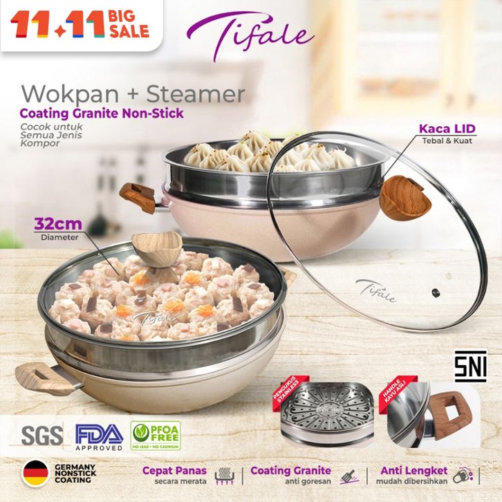 Tifale [2IN1] Wokpan Diameter 32cm Glass Lid Granite Steamer Non Stick Dandang Steamer Kukus Siomay dan Bakpao 2in 1 + T