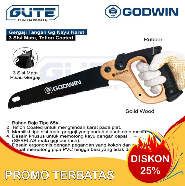 GUTE GODWIN Gergaji Tangan 3 Mata Premium GG Kayu Karet Gorok Kayu - 10 Inch Untuk Kayu /Triplek/Pipa Pvc/Gypsum/GRC Boa
