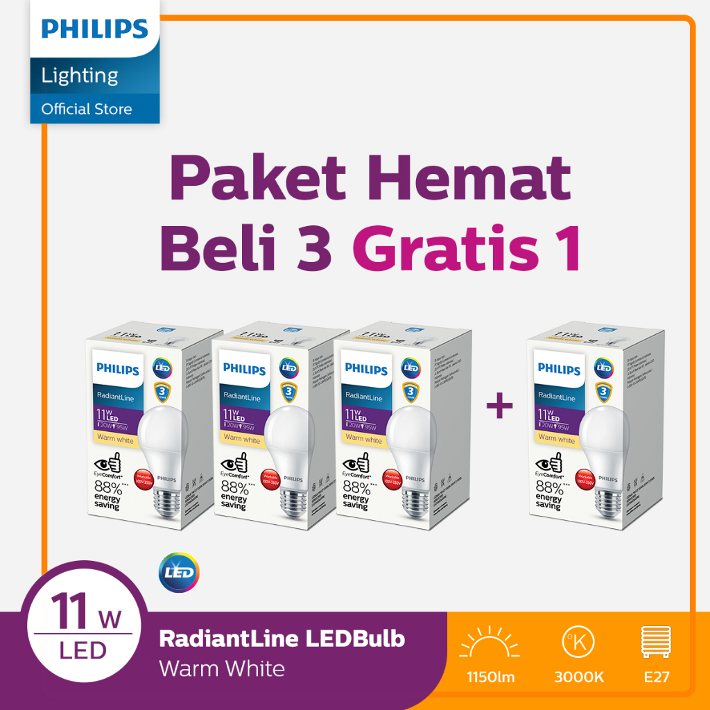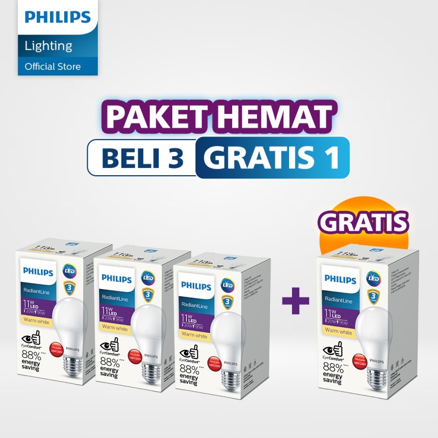 PHILIPS BELI 3 GRATIS 1 RADIANTLINE LEDBULB 11W 3000K KUNING
