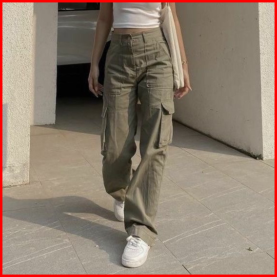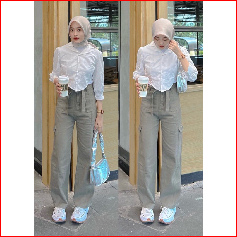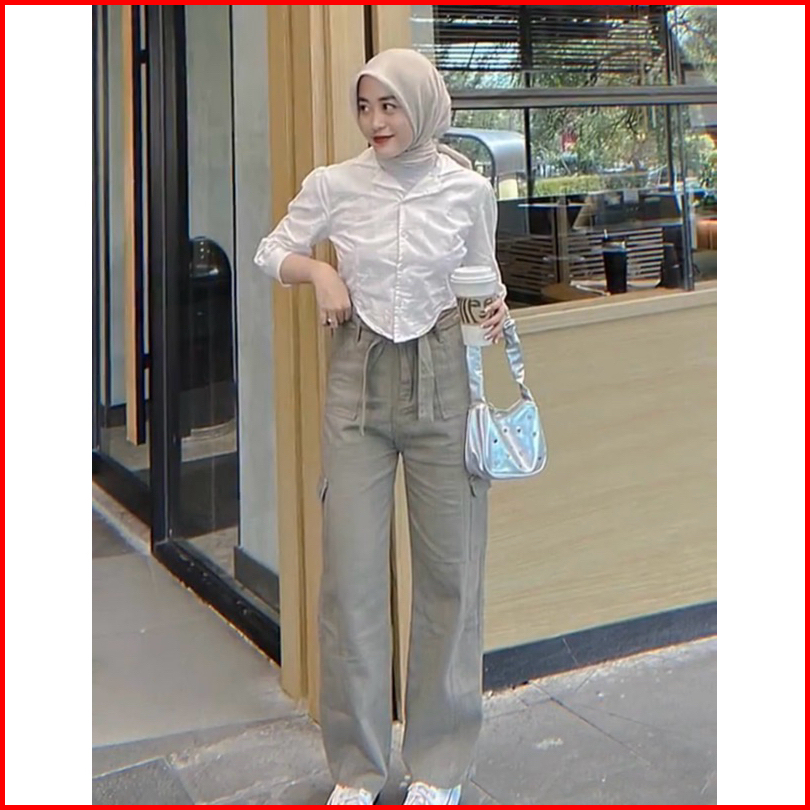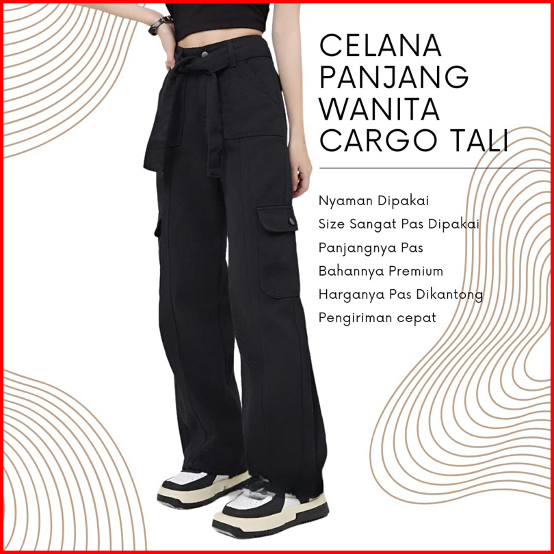 Celana Panjang Wanita Korean Style Jeans Pants Kekinian Cewek Pinggang Highwaist Perempuan Karet Kulot Kargo Tali Model