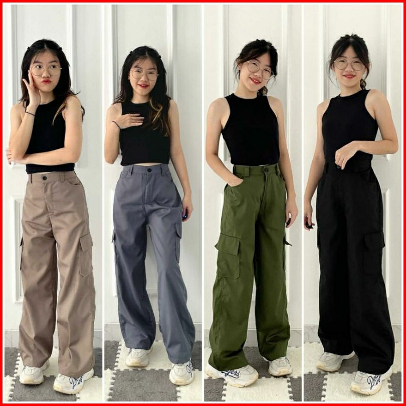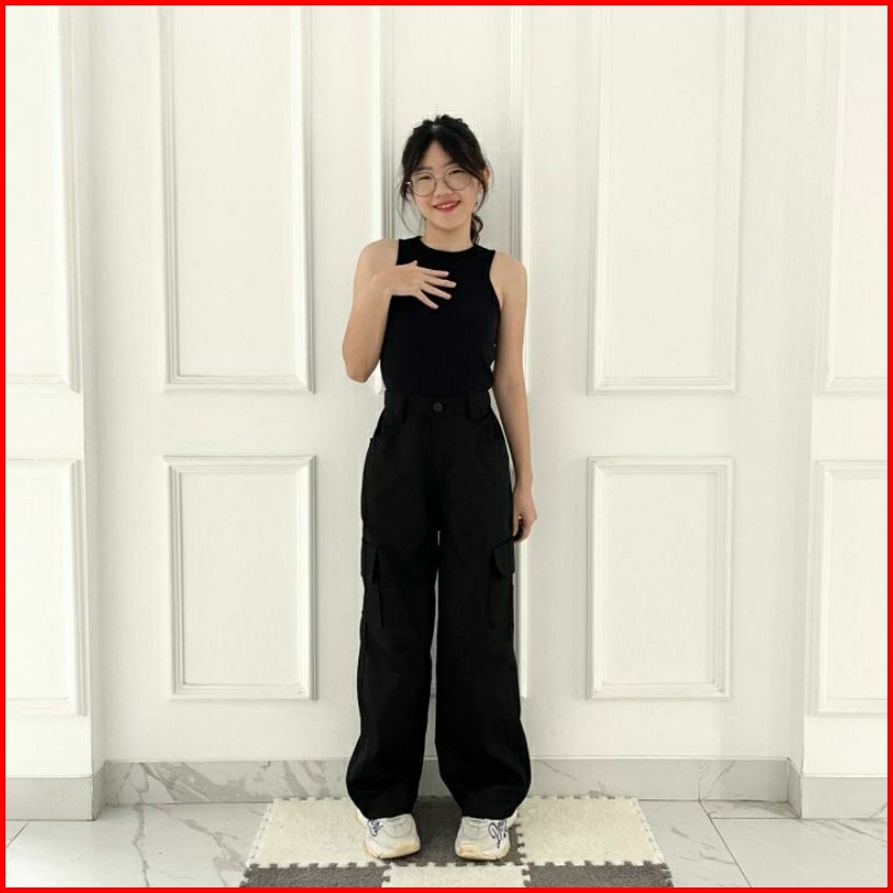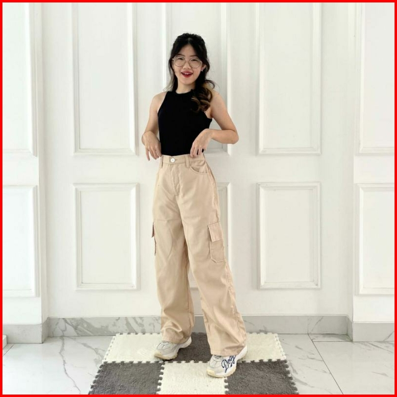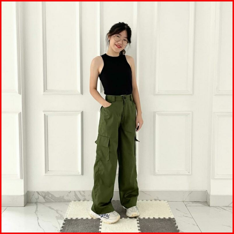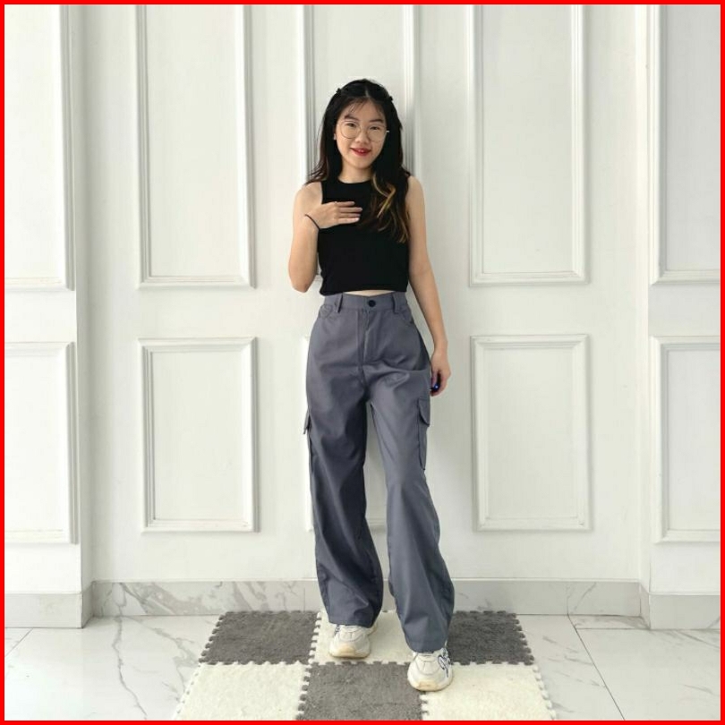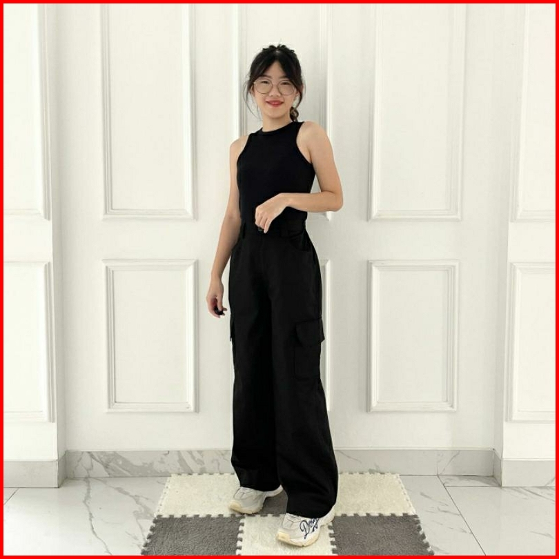 Celana Cargo Wanita Highwaist Loose Korean Style Ootd Premium