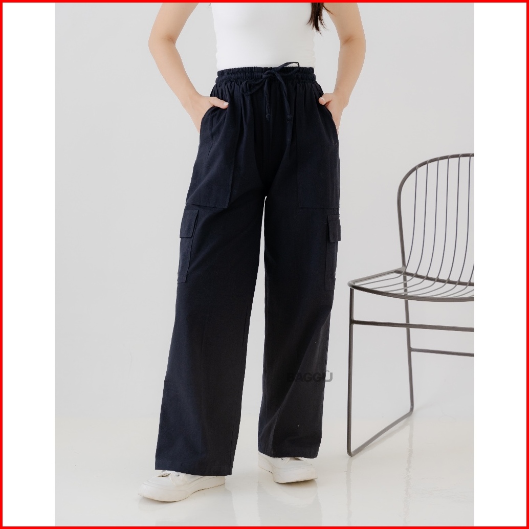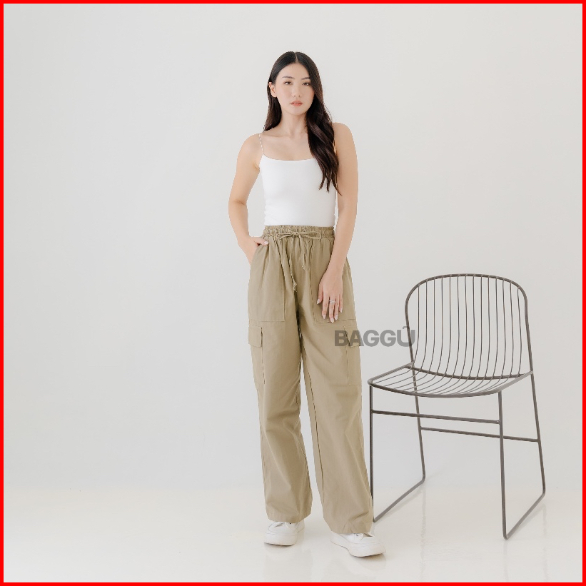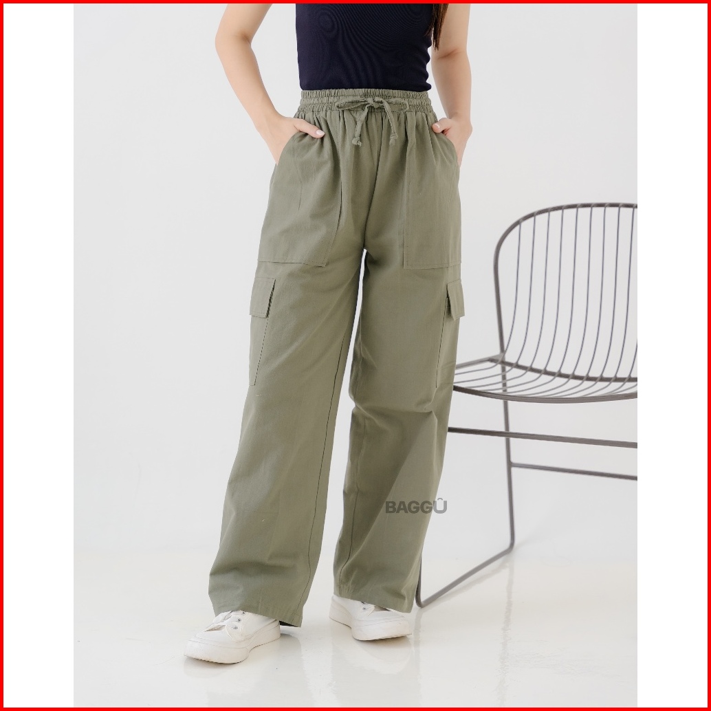 Baggu Cargo Pants Hanami - Olive - Celana Cargo Linen Panjang Wanita Loose Pants Highwaist
