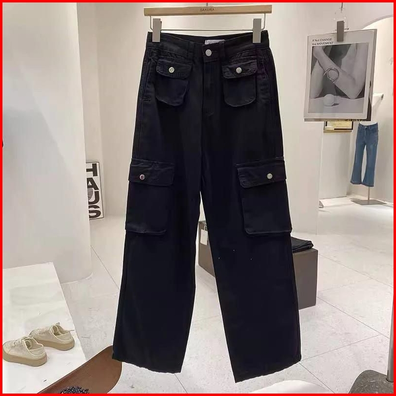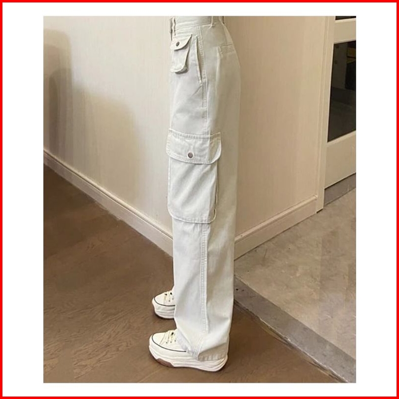 Celana Cargo Denim Pasir Putih Highwaist Loose Celana Jeans Wanita Korean