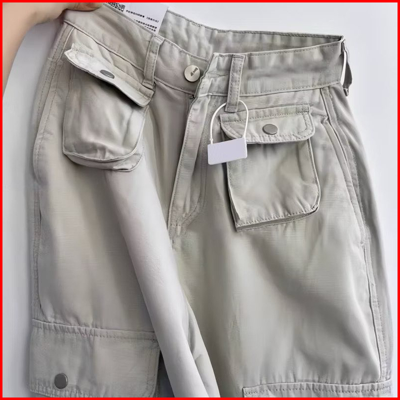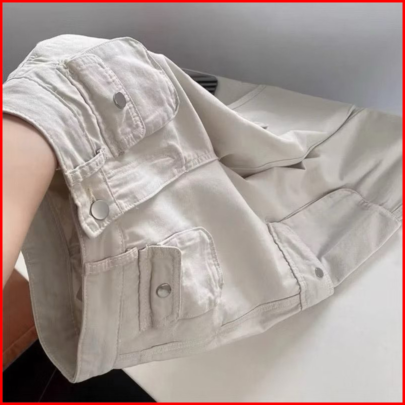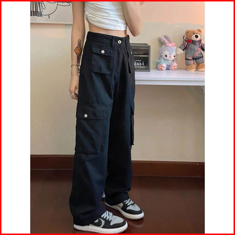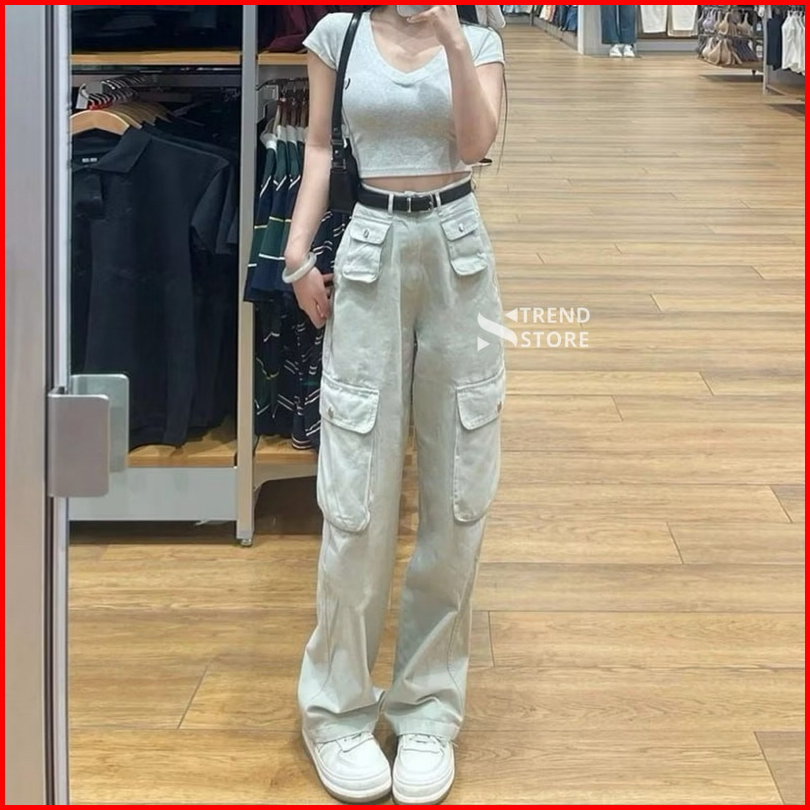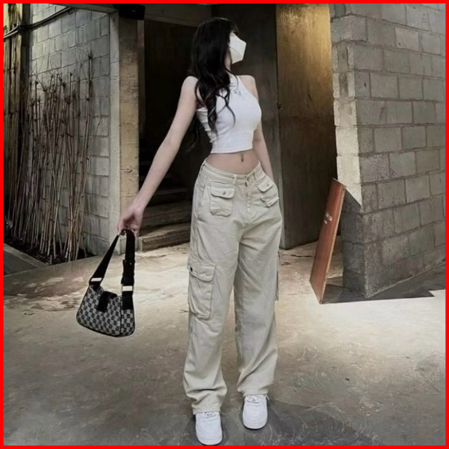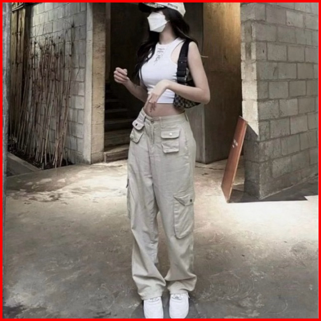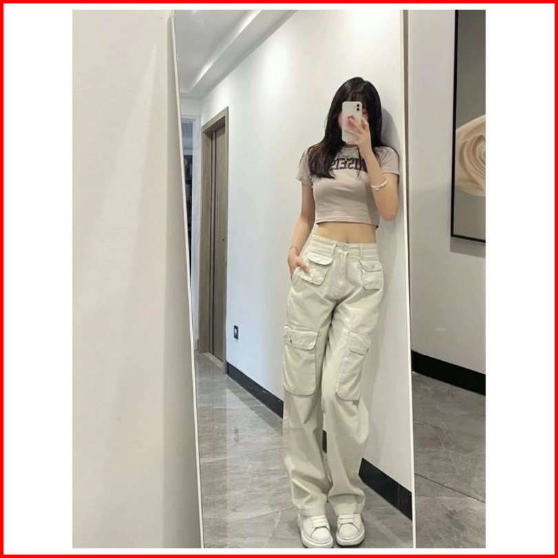 Korean Style Cargo Wanita Krem Pasir Putih - Straight High Loose - Celana Panjang Wanita Terbaru