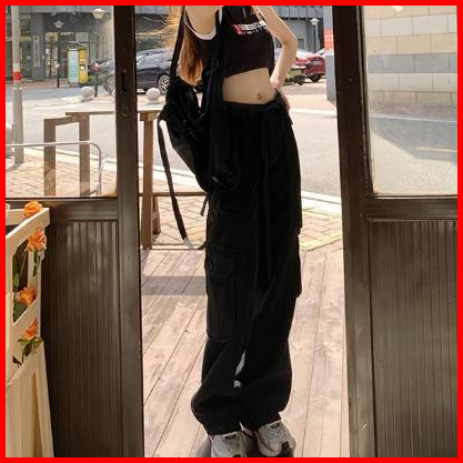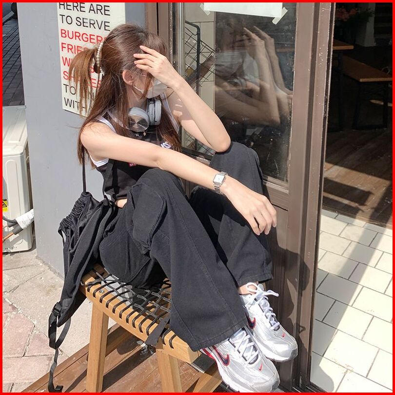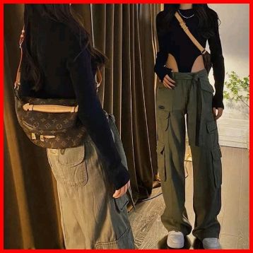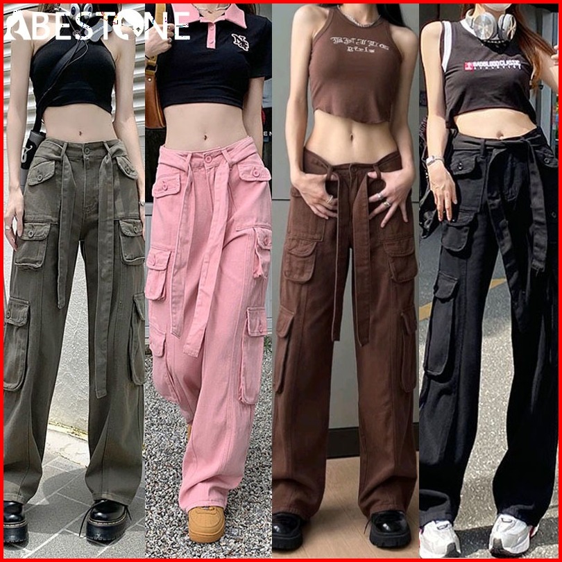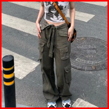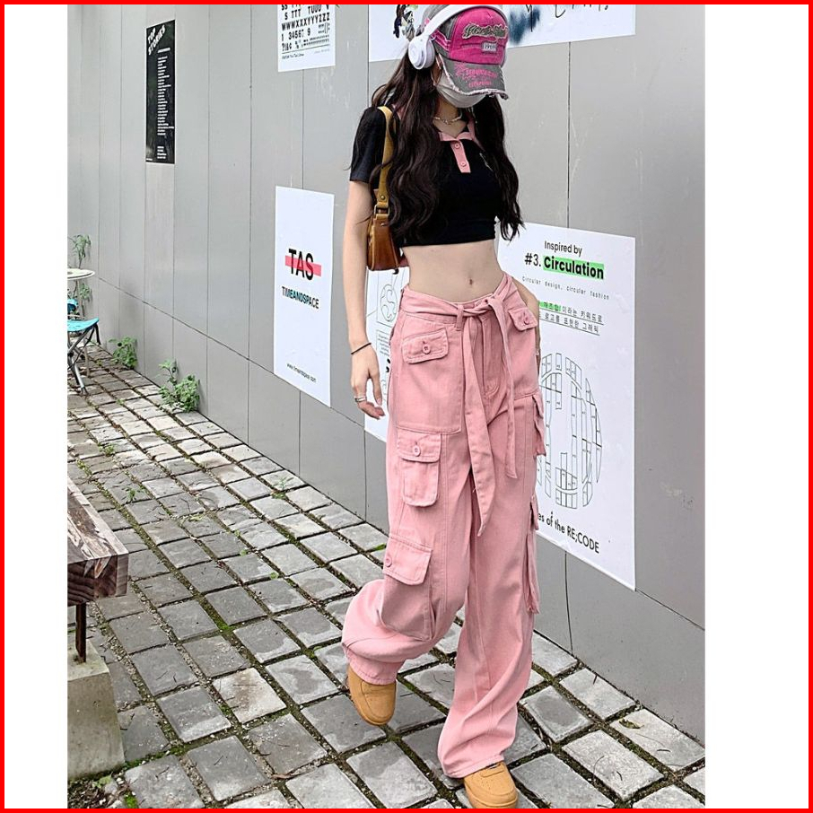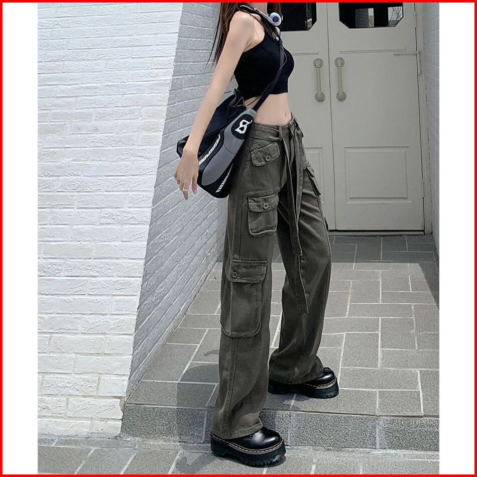 Celana Jeans High Waist Wanita Gaya Korea Celana Vintage Dengan Banyak Saku Dan Lebar Celana Lurus Dansa Kasual