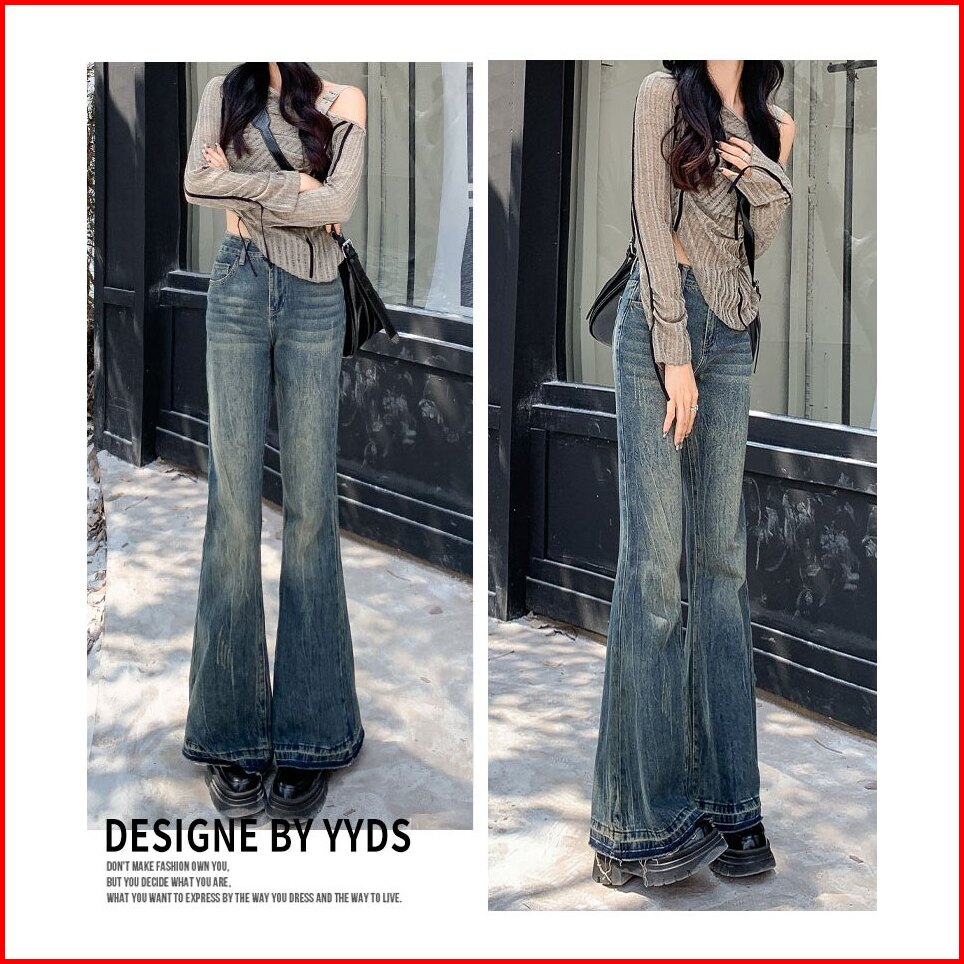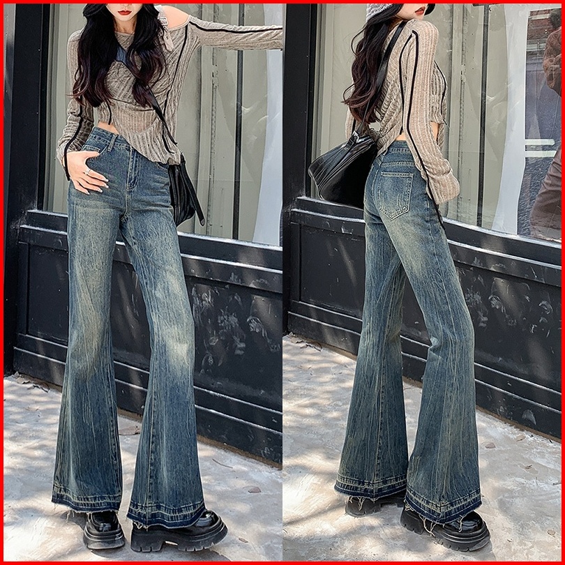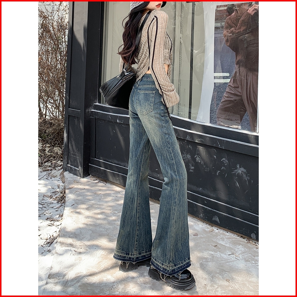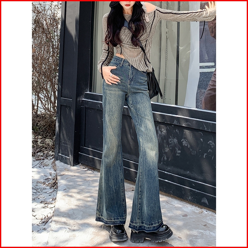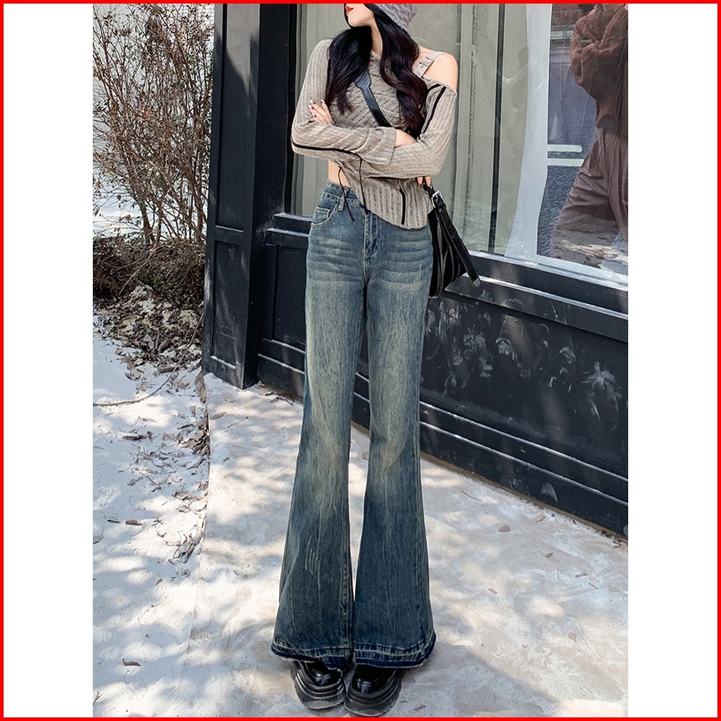 Celana Wanita Highwaist Korean Style Flare Jeans Pants Jeans Bootcut Pinggang Tinggi Retro Wanita Yang Tertekan Celana M