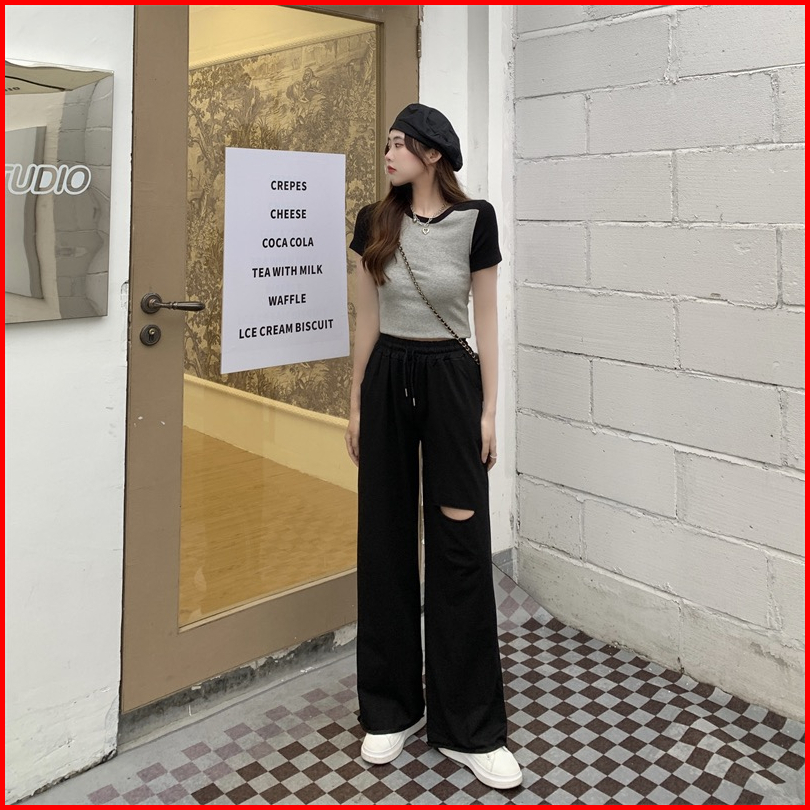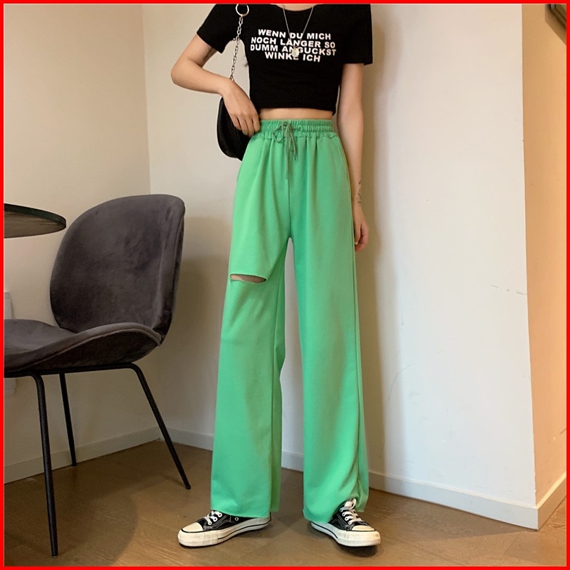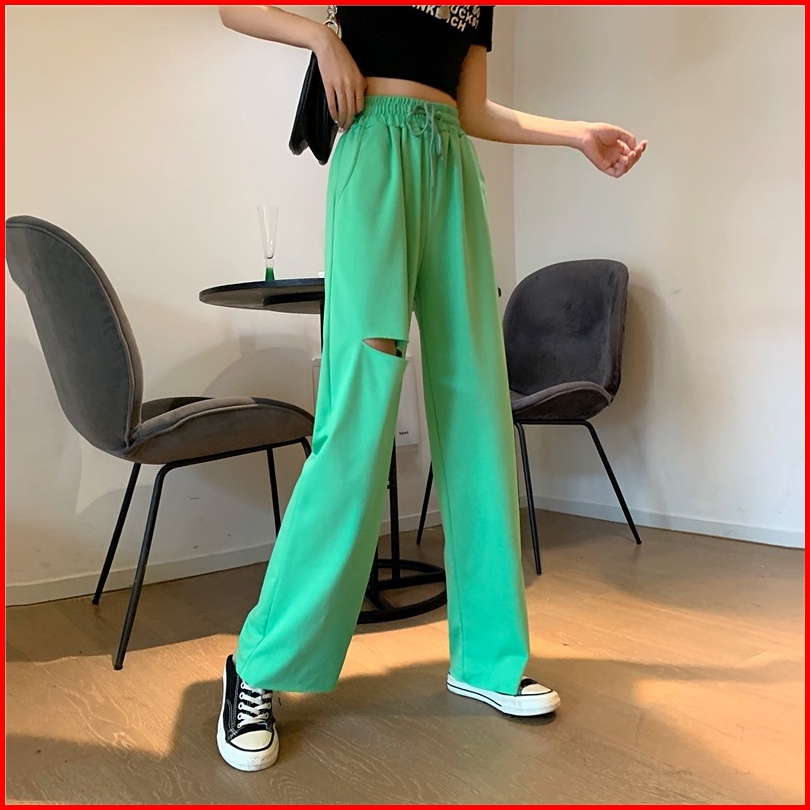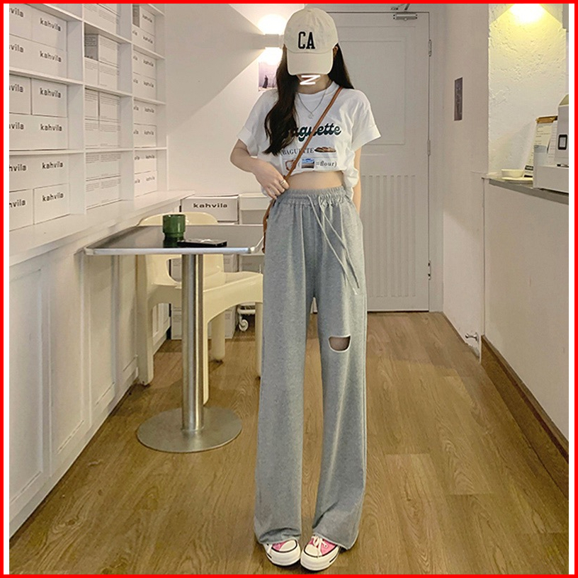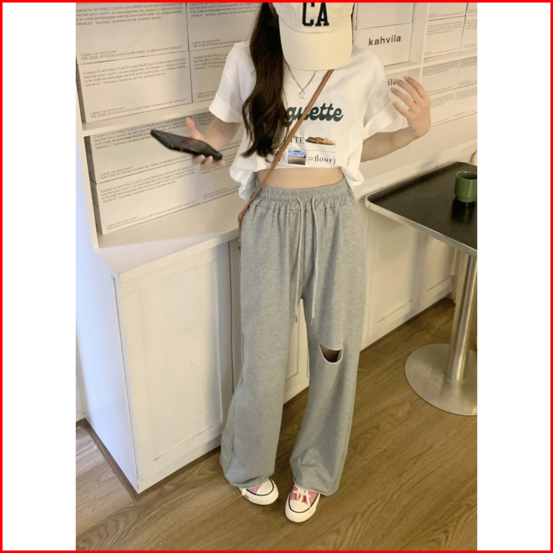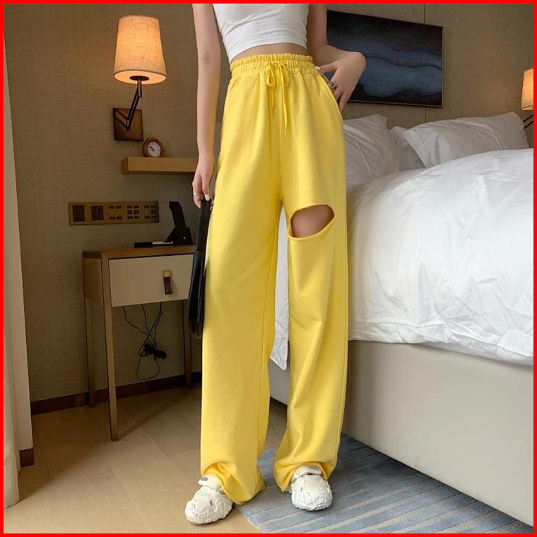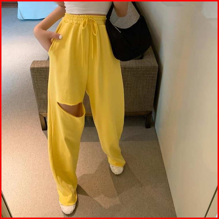 Versi Korea Tali Pinggang Elastis Sobek Celana Lebar Kaki Celana Olahraga Kasual Wanita