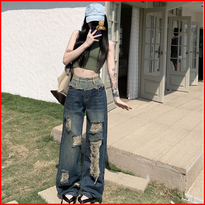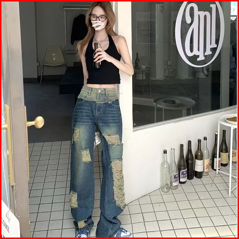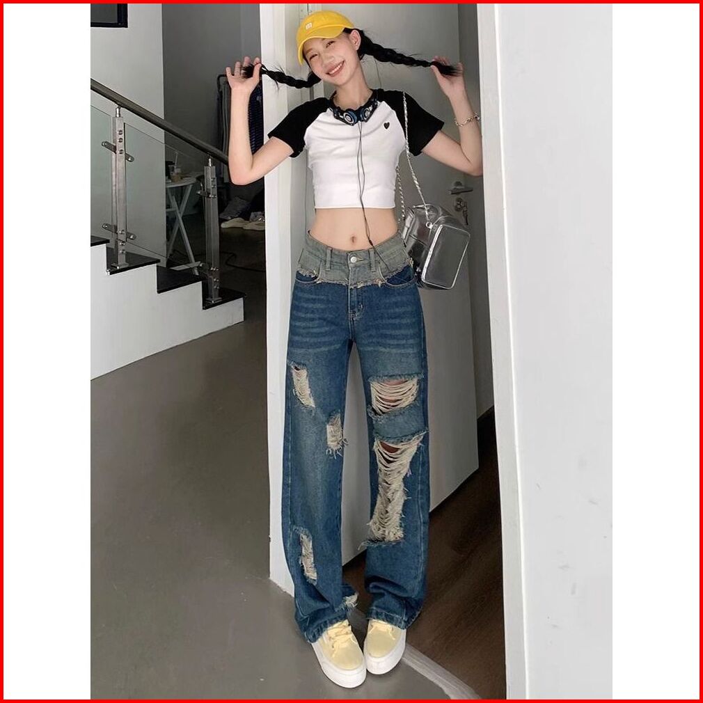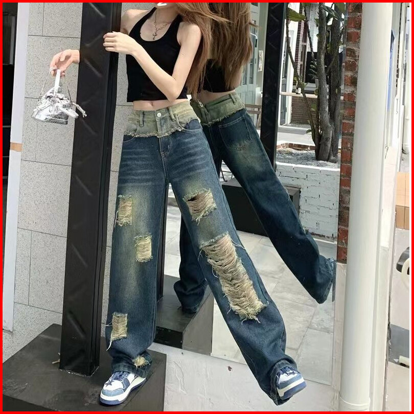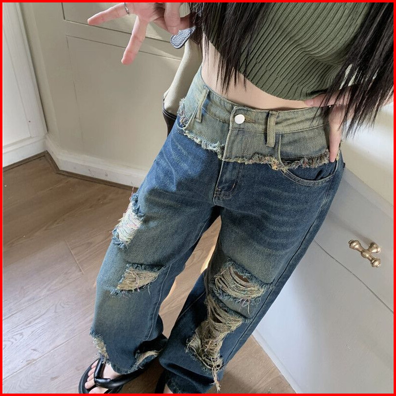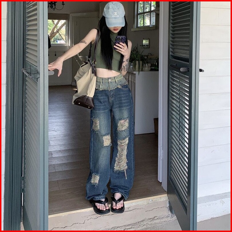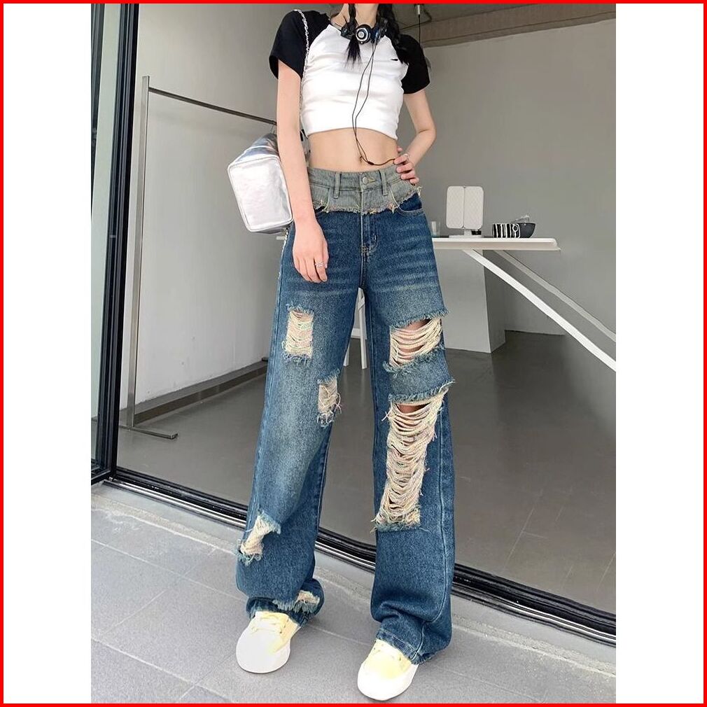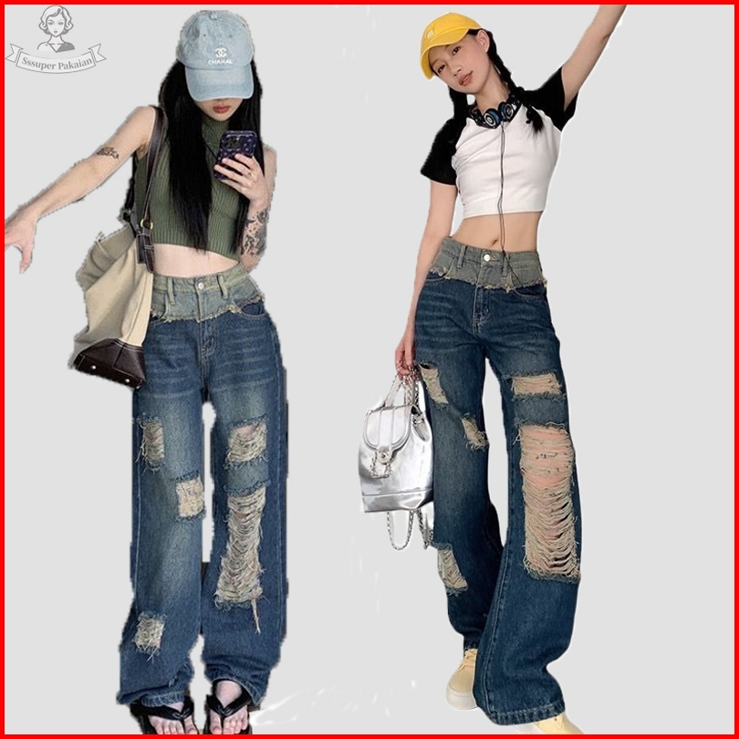 S 5xl Celana Jeans Robek Pinggang Tinggi Retro Wanita Gaya Korea Celana Jeans Kasual Longgar Dan Serbaguna