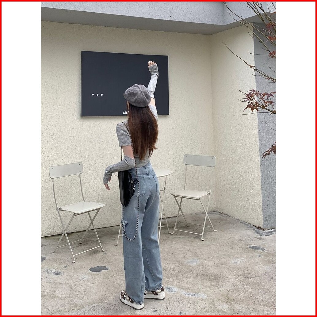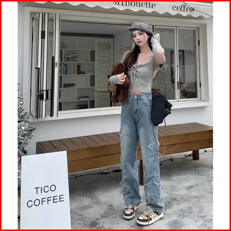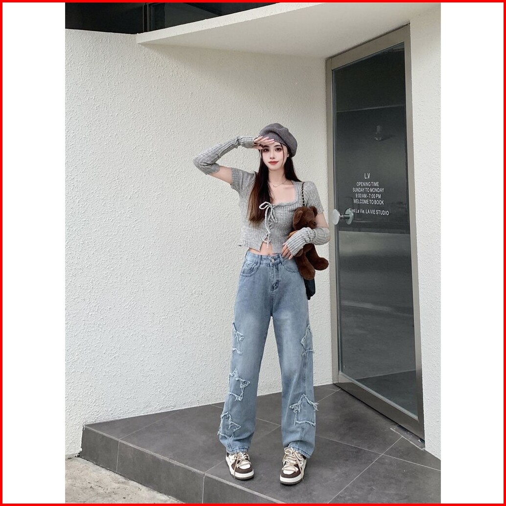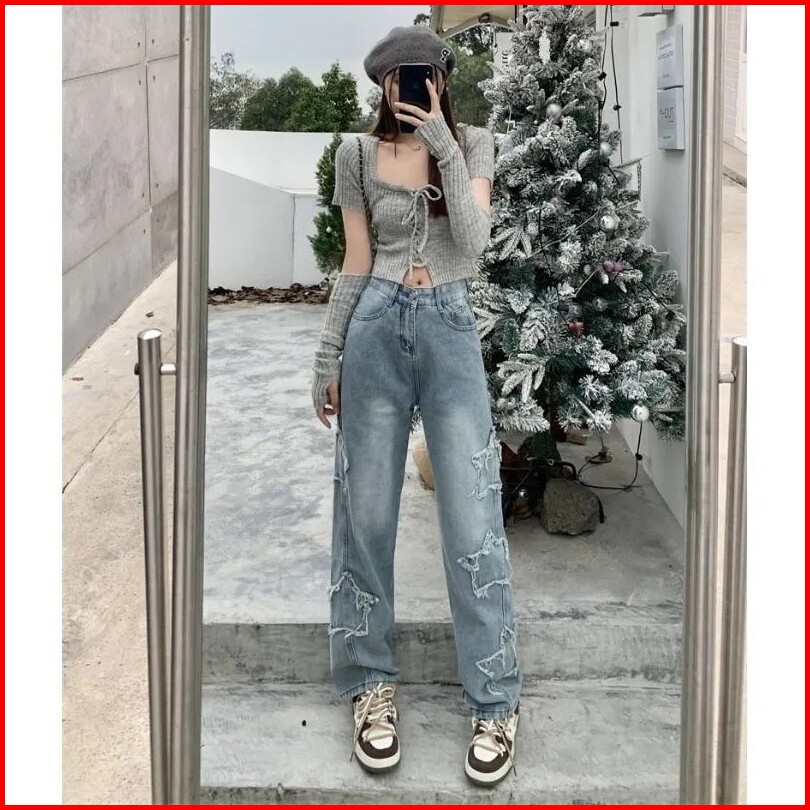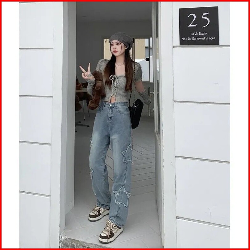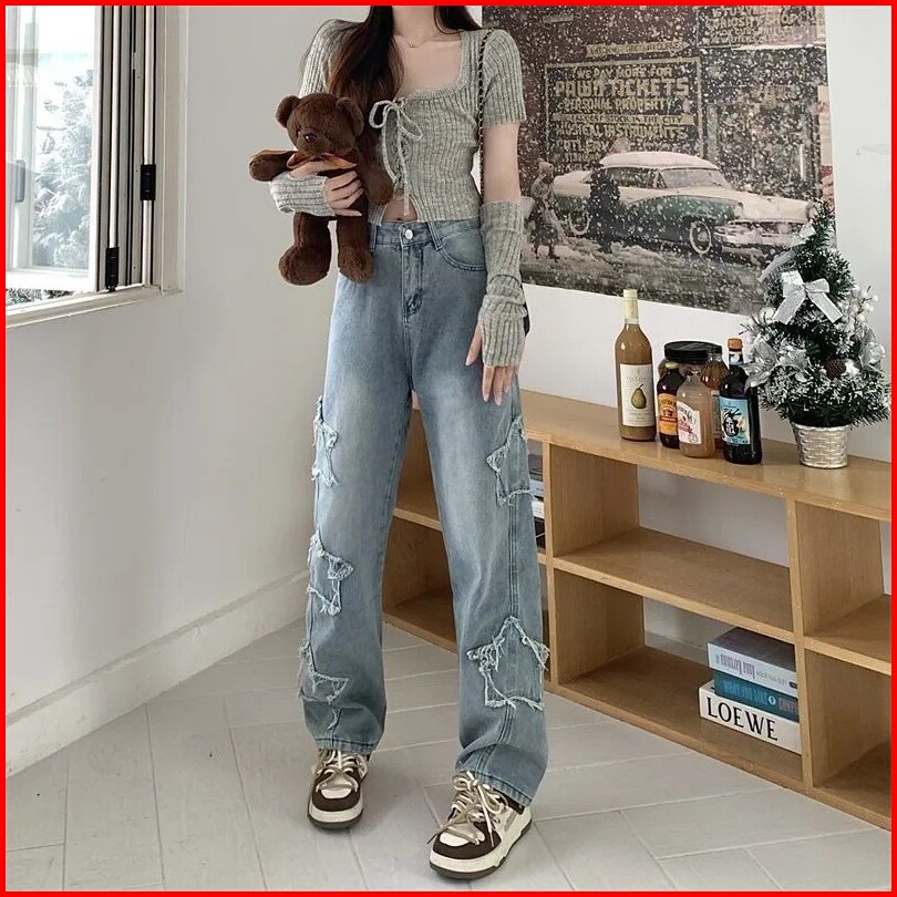 Jeans Pinggang Tinggi Bintang Berujung Lima Celana Wanita Kaki Lebar Longgar Kaki Lurus