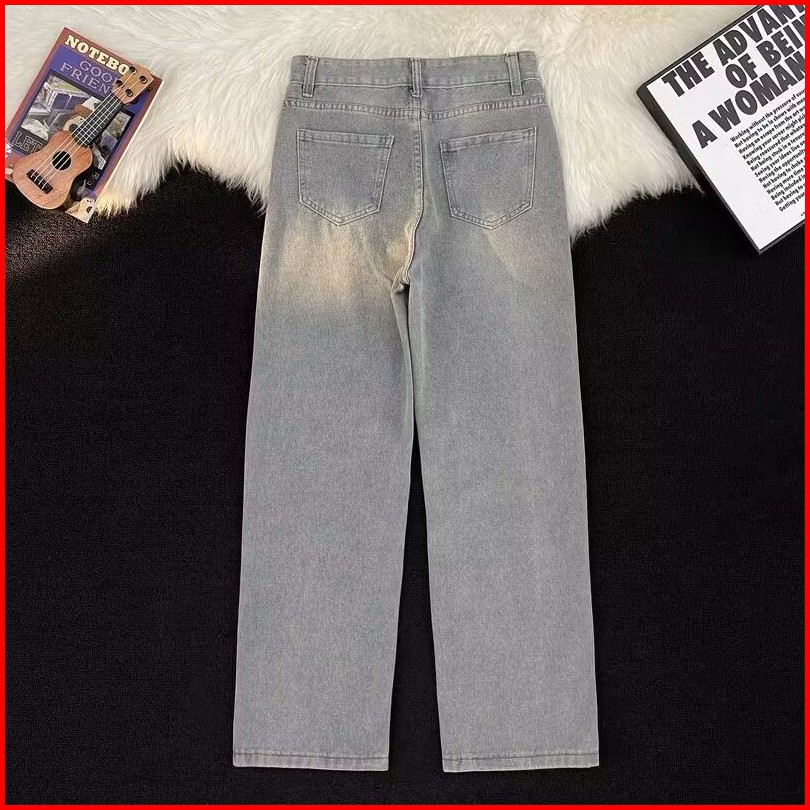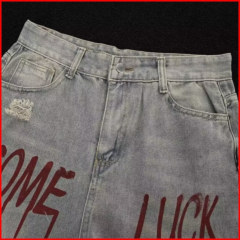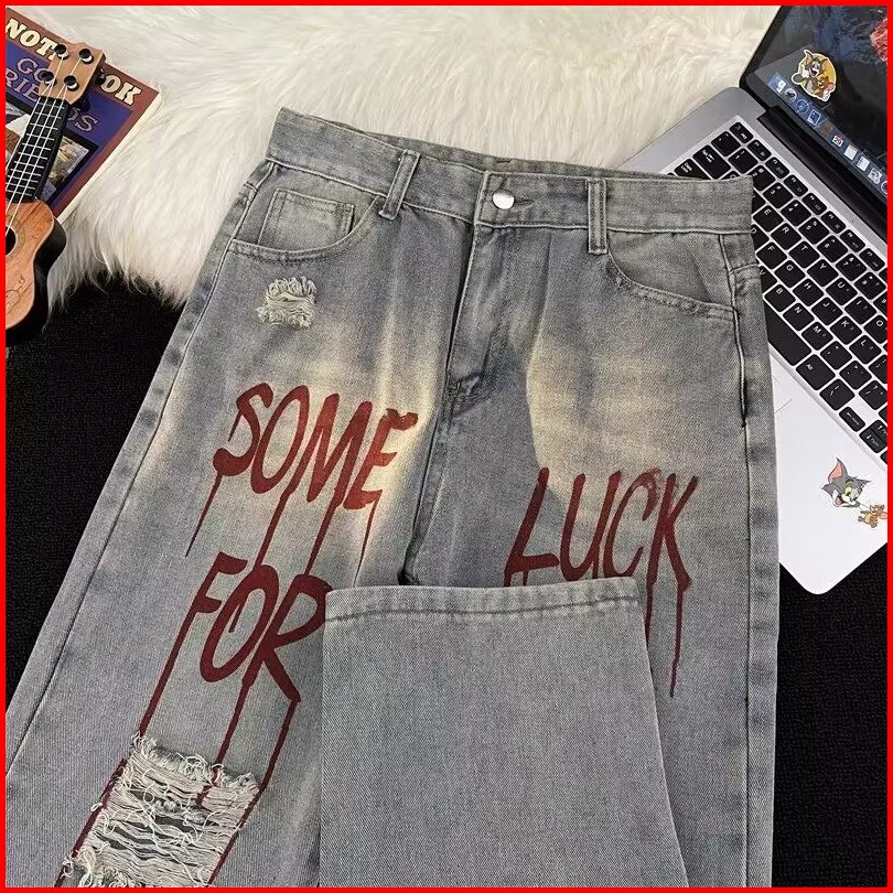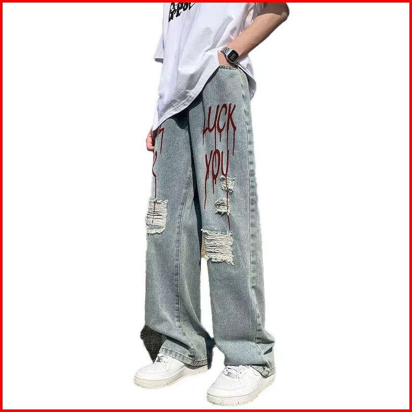 Fashion Korea Retro Graffiti Robek Celana Jeans Longgar Kaki Lebar Lurus