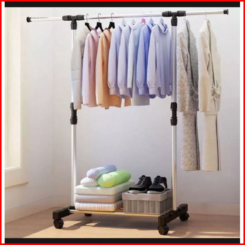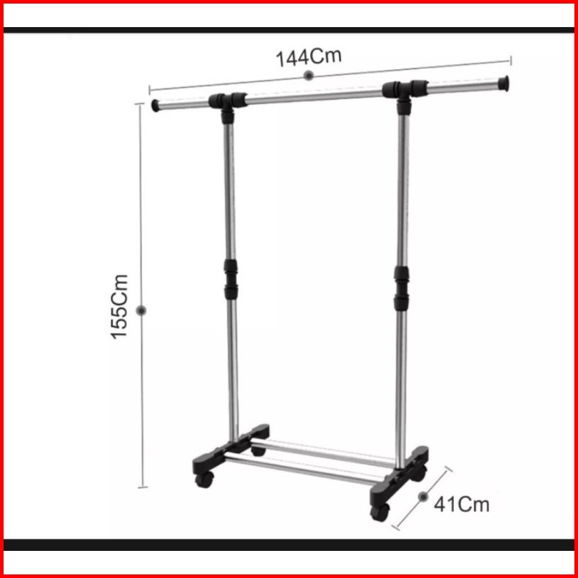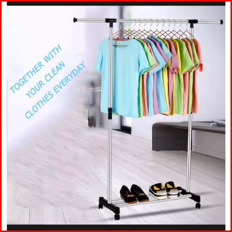 Stand Hanger Single Rak Gantungan Stainless Steel Rak Baju Jemuran Baju Single Rak Besi Stainless Jemuran Pakaian Roda 4