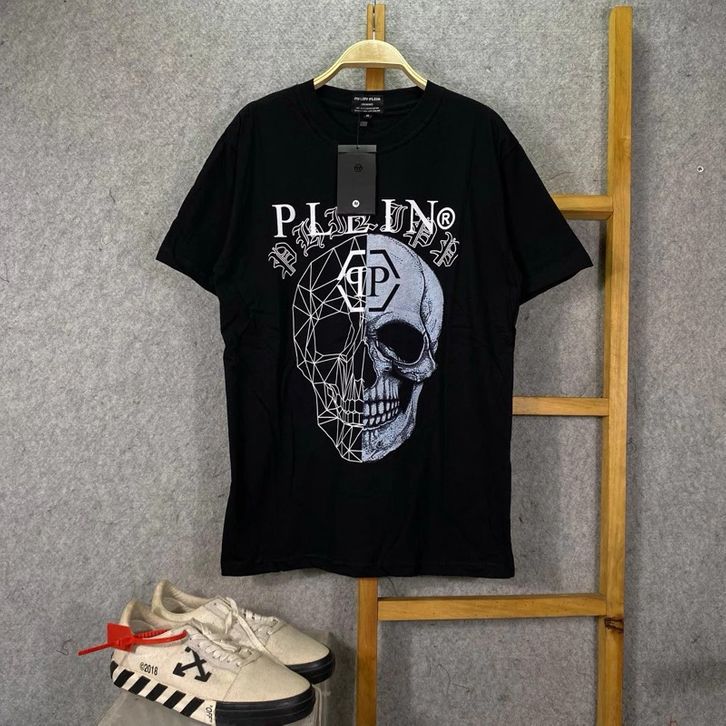 Kaos PHILIPP PLEIN HALF SKELETON HITAM T-shirt Oversize pria/wanita