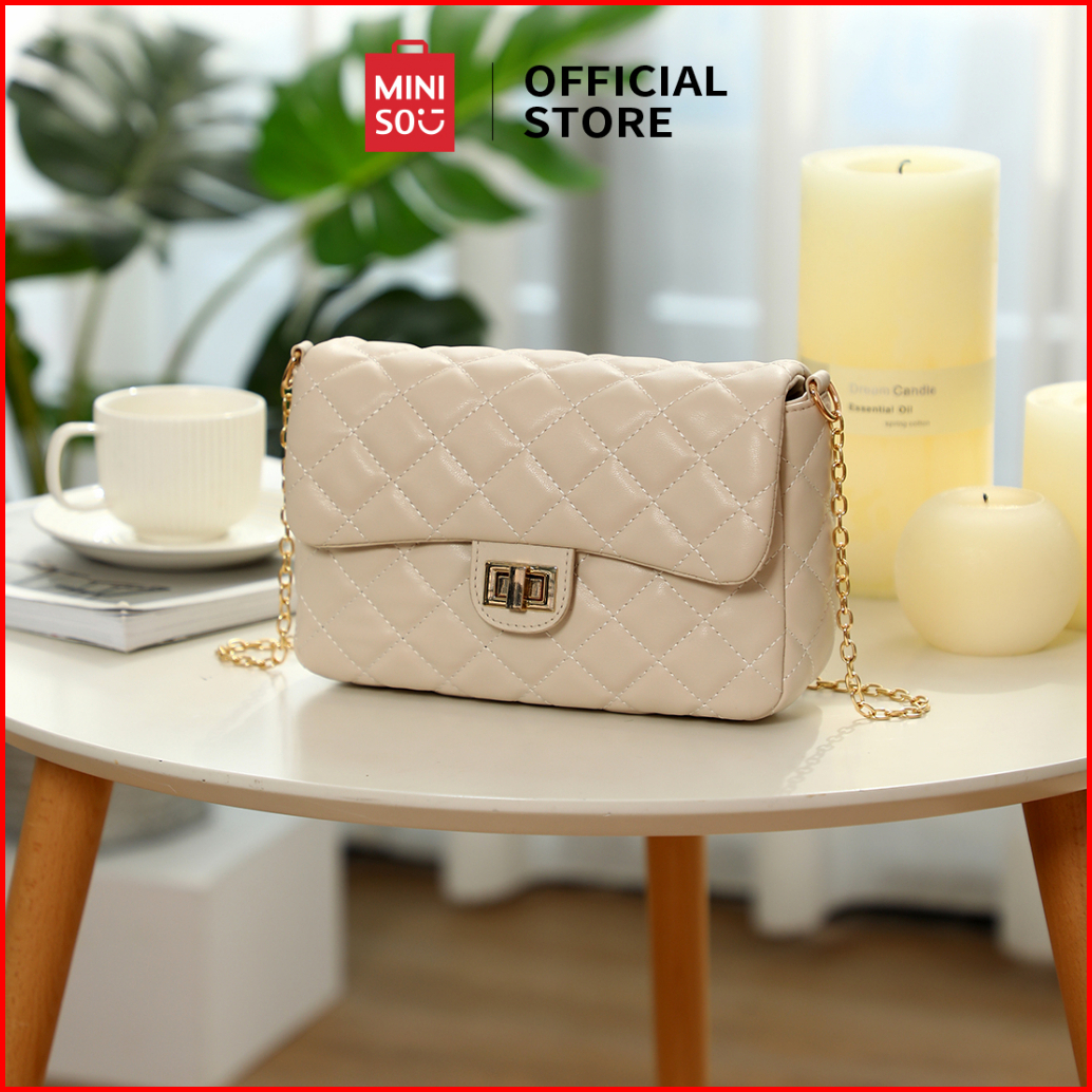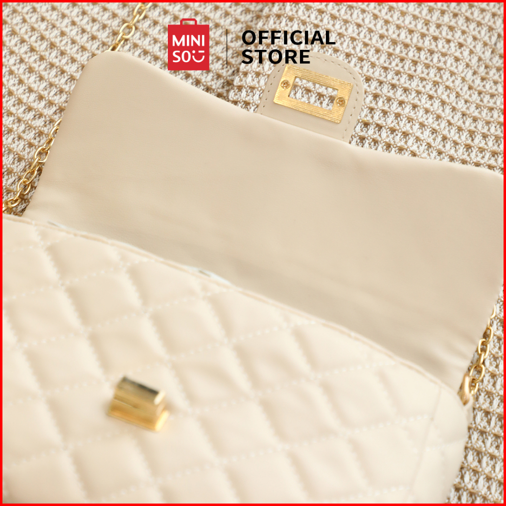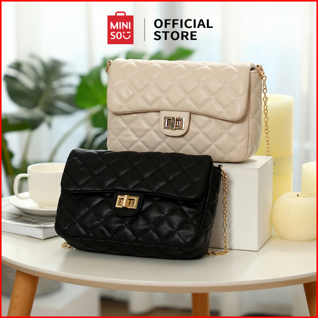 Miniso Tas Selempang Crossbody Bag Tas Y2k Barel Quilted Pola Kisi Berlian Klasik Kunci Perangkat Keras Kulit Lembut