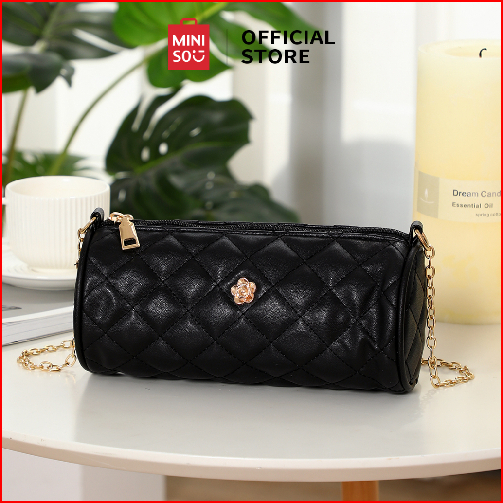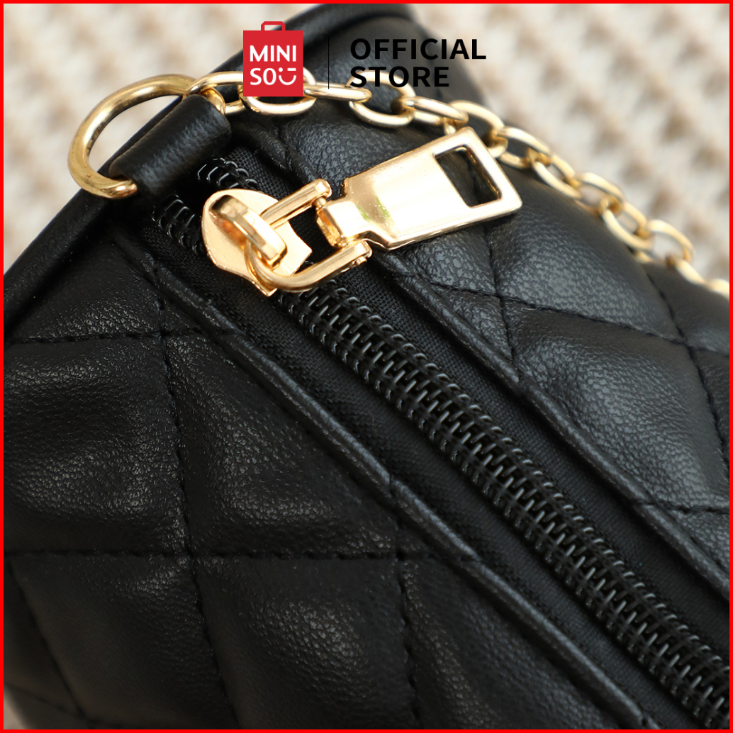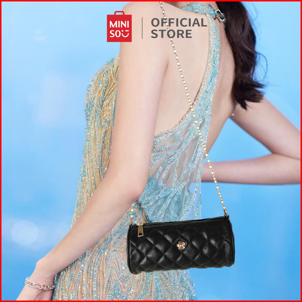 Miniso Tas Selempang Crossbody Bag Tas Y2k Barel Quilted Pola Kisi Berlian Klasik Kunci Perangkat Keras Kulit Lembut