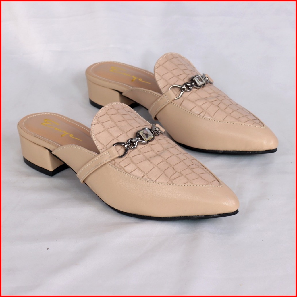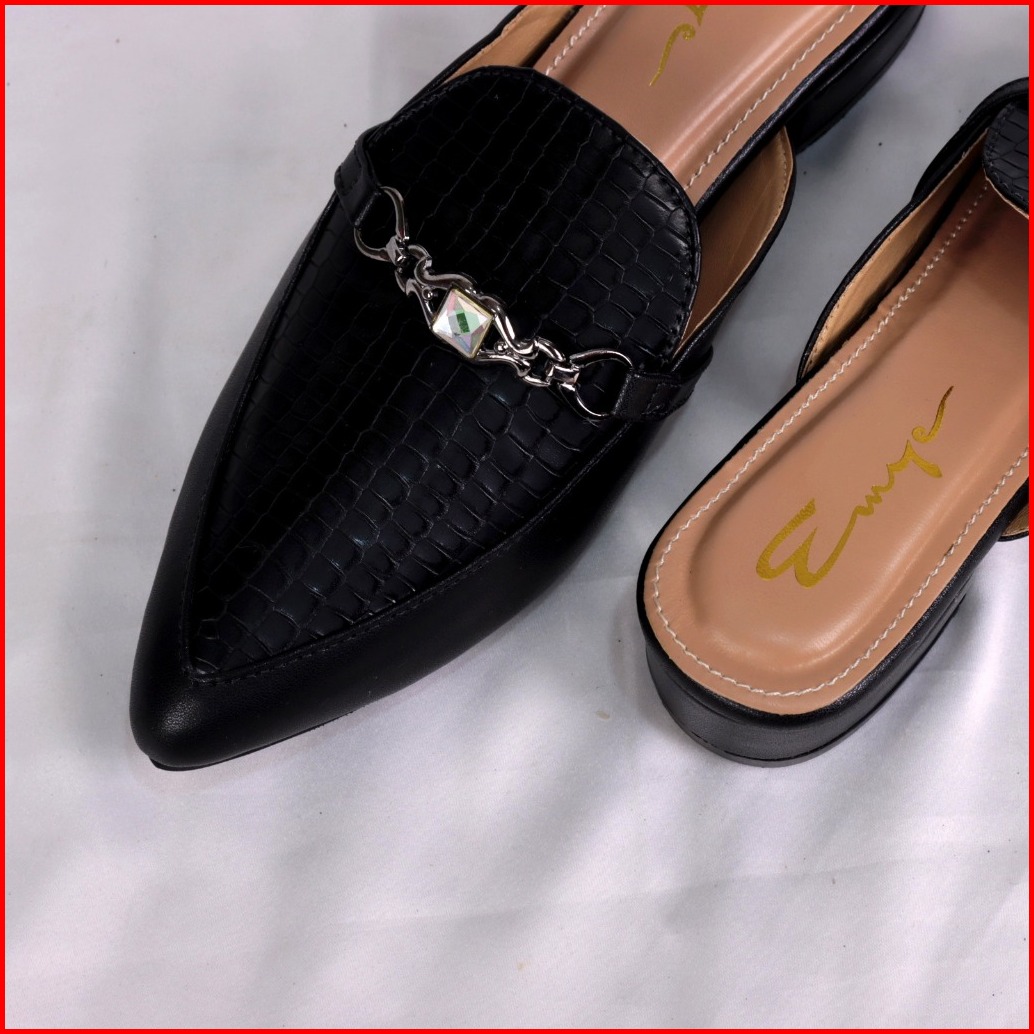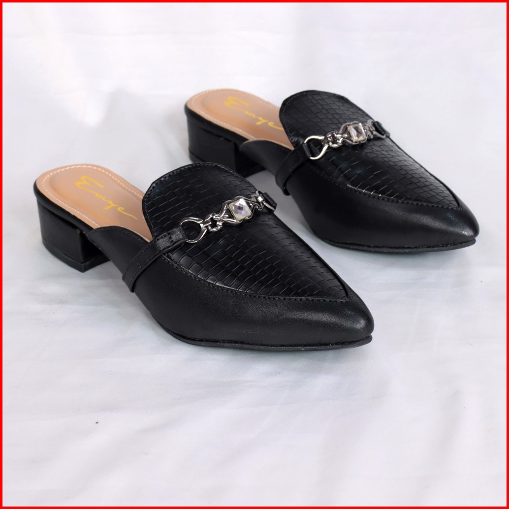 Emye - Sepatu Sandal Pantofel Mules Wanita Hitam Cream Moca 3 Cm