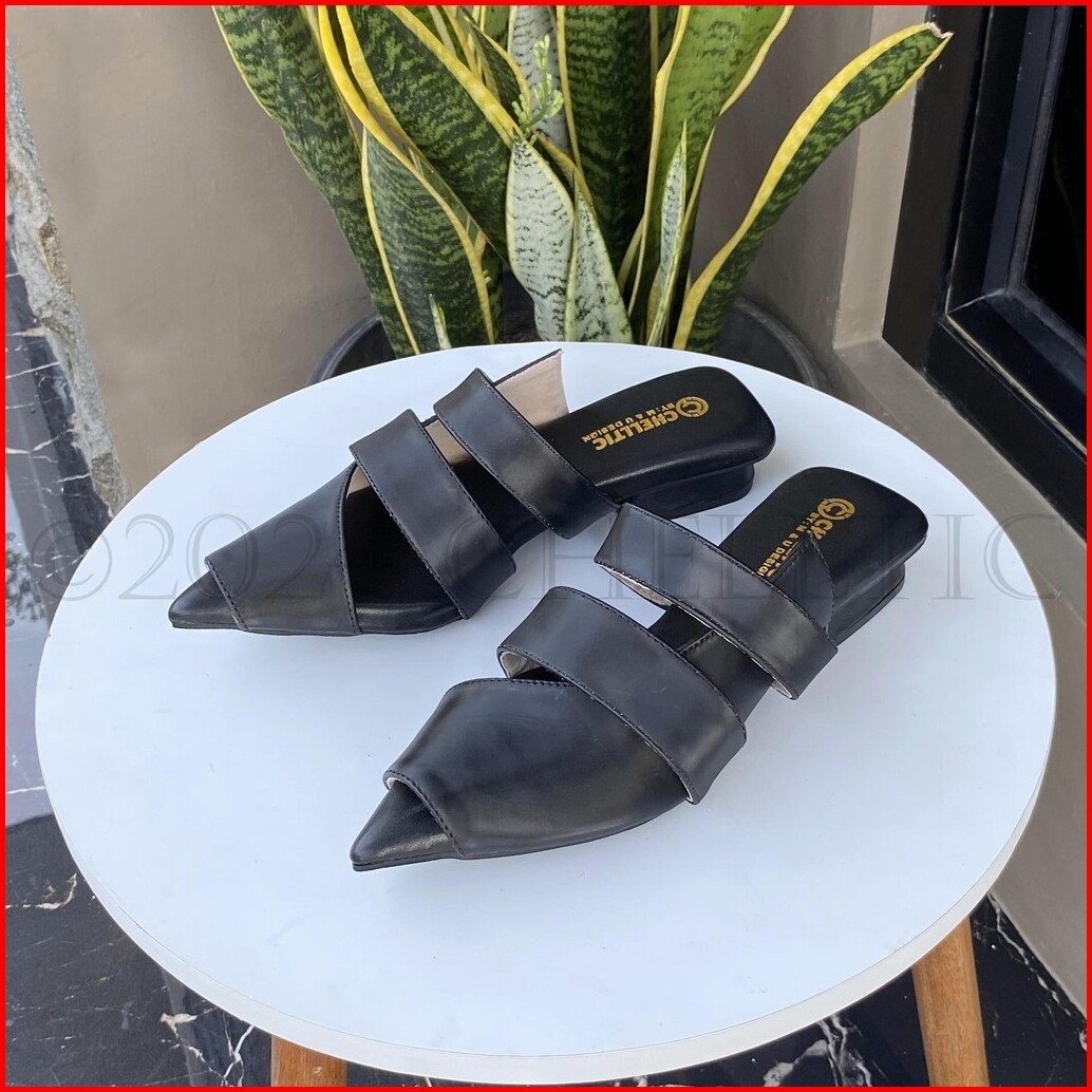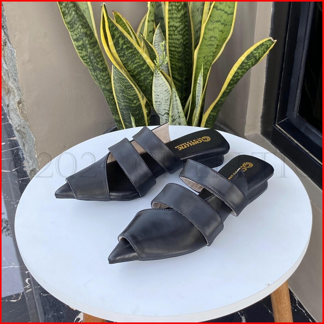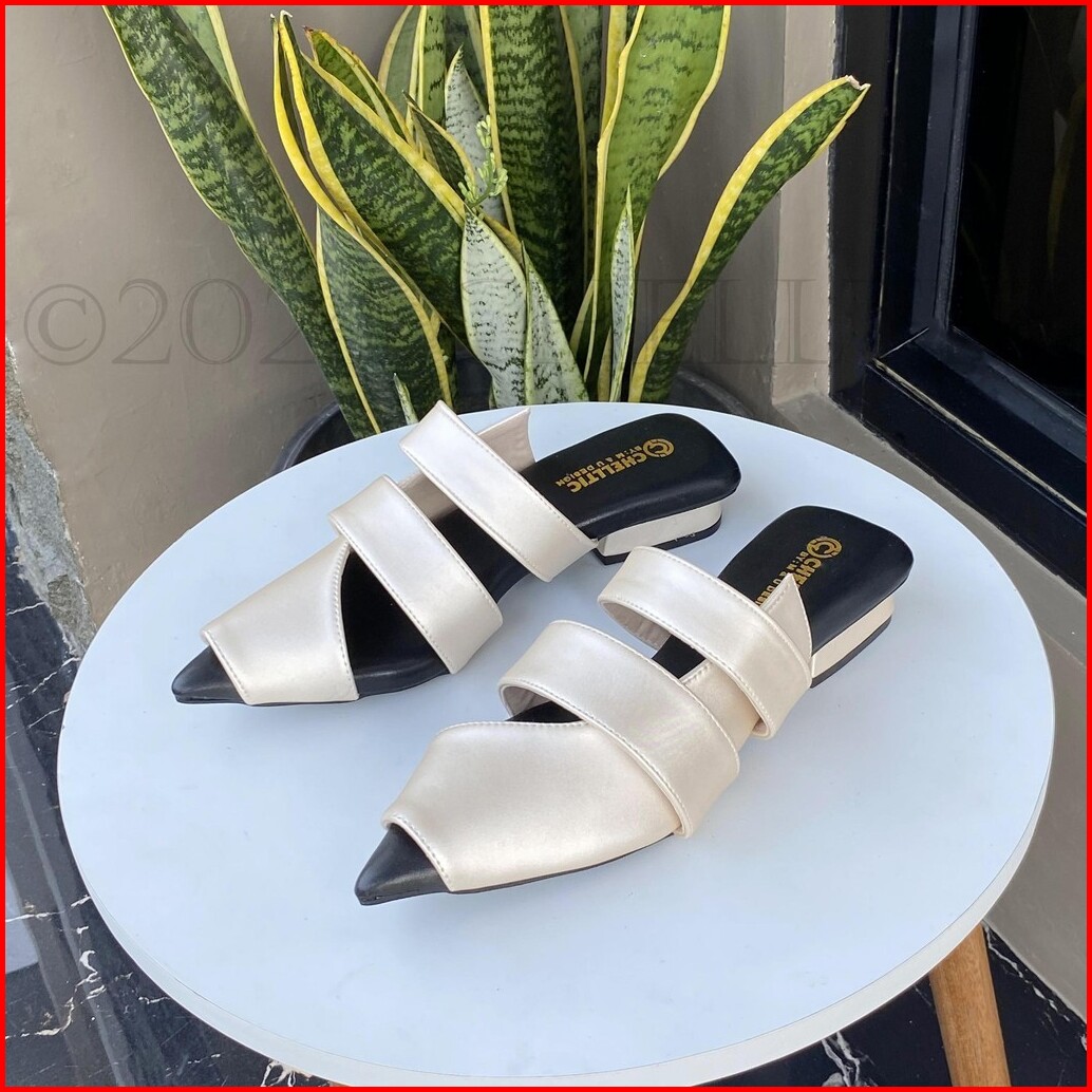 Chelltic - Sandal Wanita Mules Hak Tahu 2cm Terbaru Sepatu Heels Wanita Elegan Party Cewek Korea Sendal Flat Slipon Keki