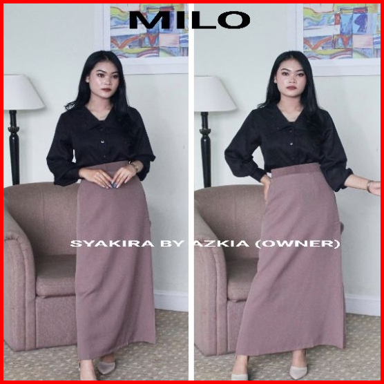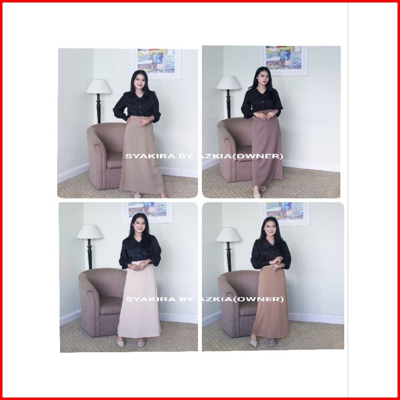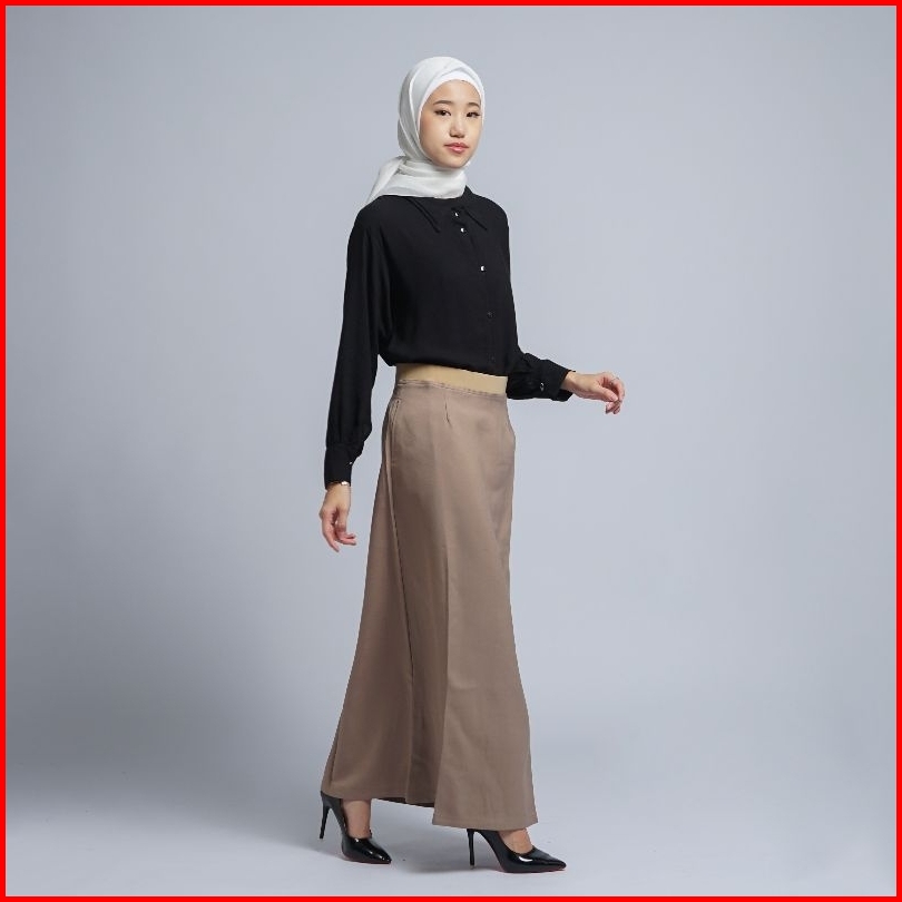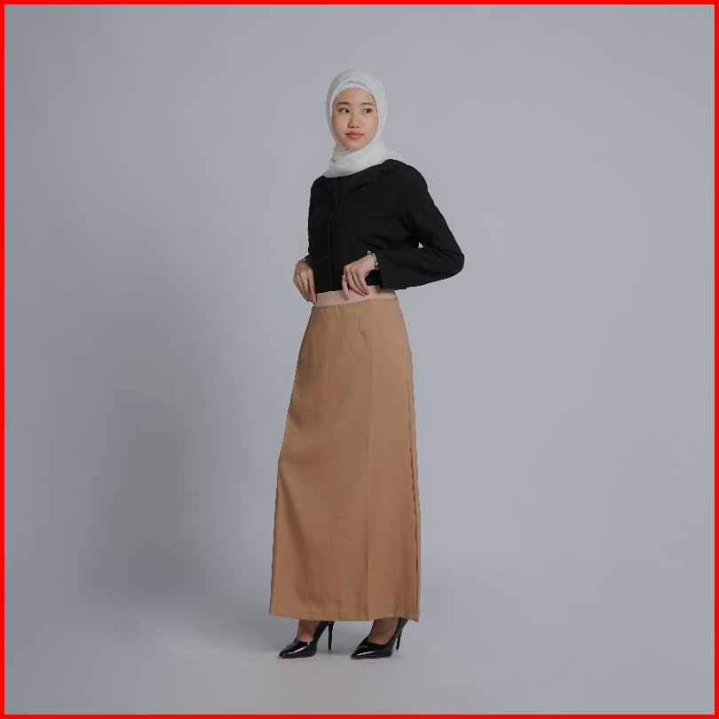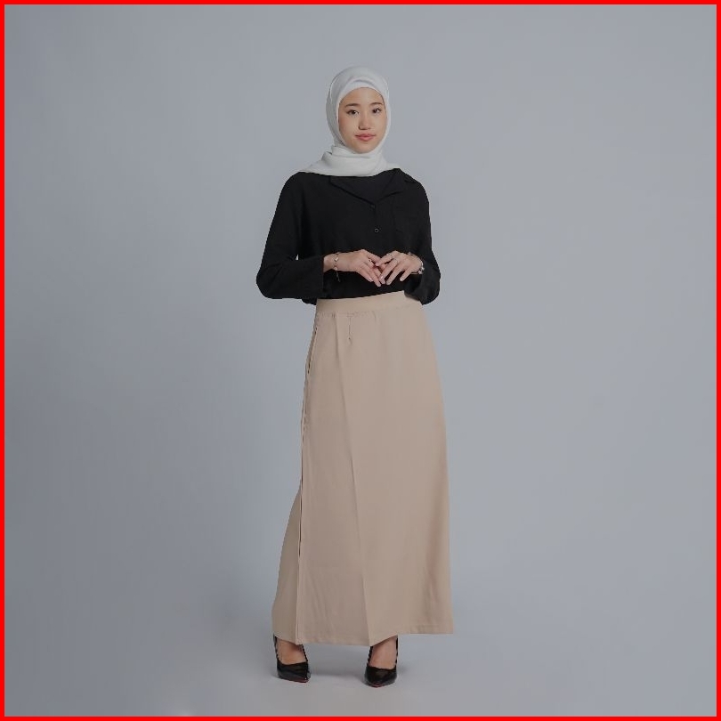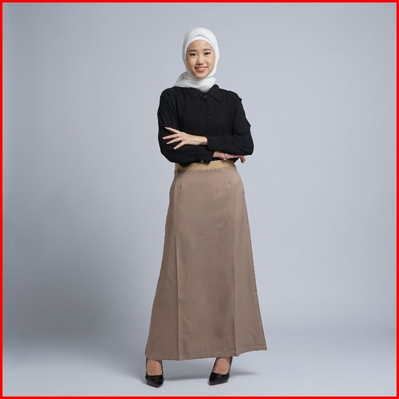 Rok Kerja Wanita A Line Terbaru Pinggang Full Karet Polyester Premium Import Stretch Cream Milo Moca