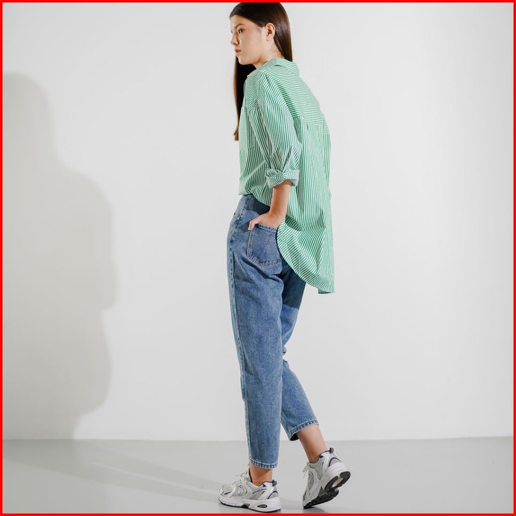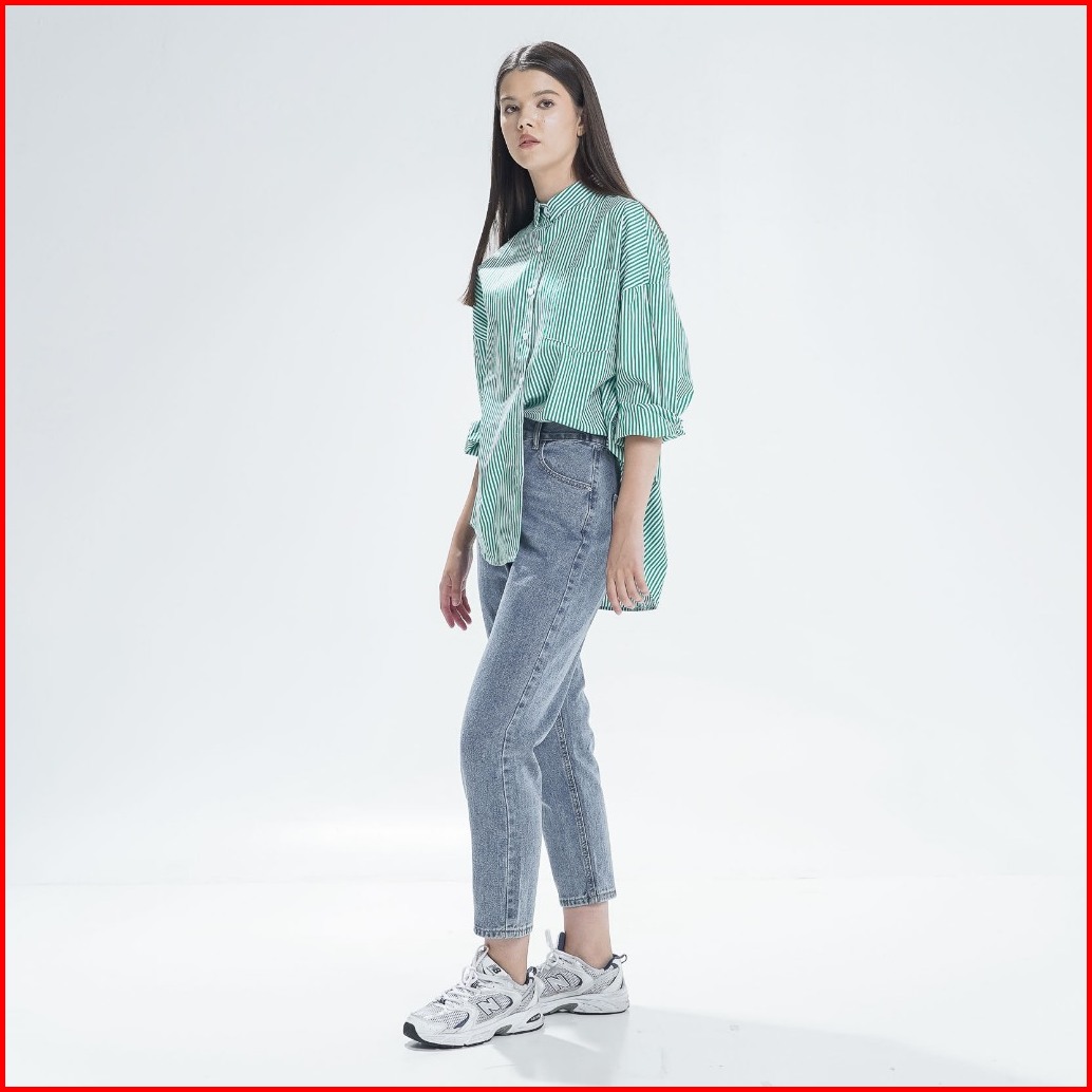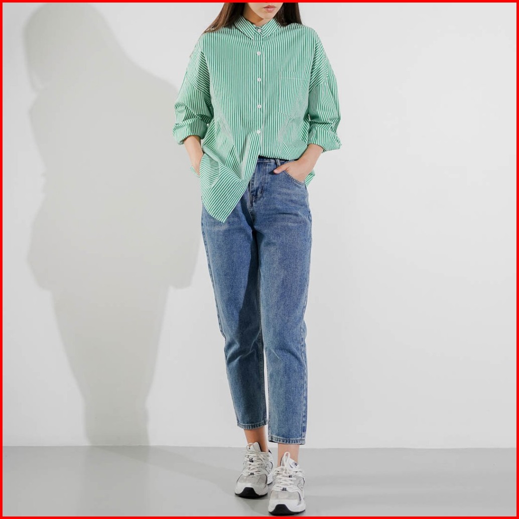 This Is April Atasan Kemeja Wanita Striped Lengan Panjang Amanda Top Green Restock