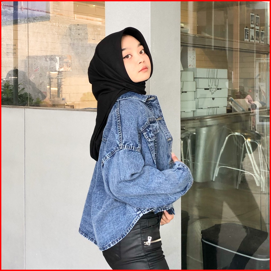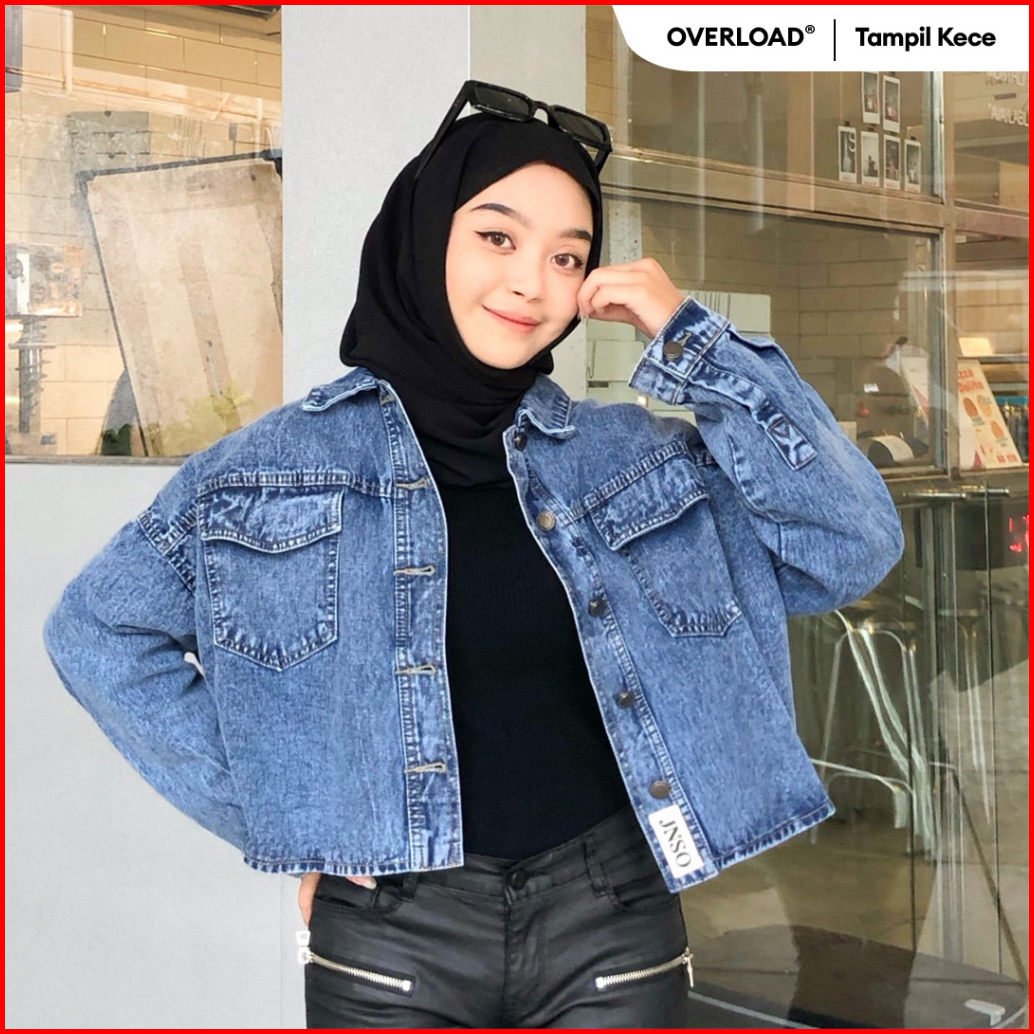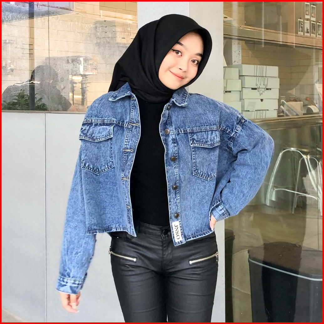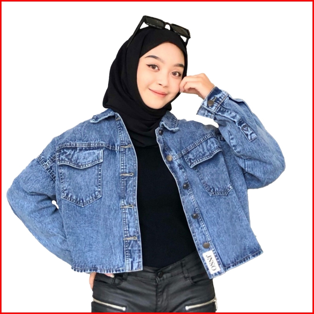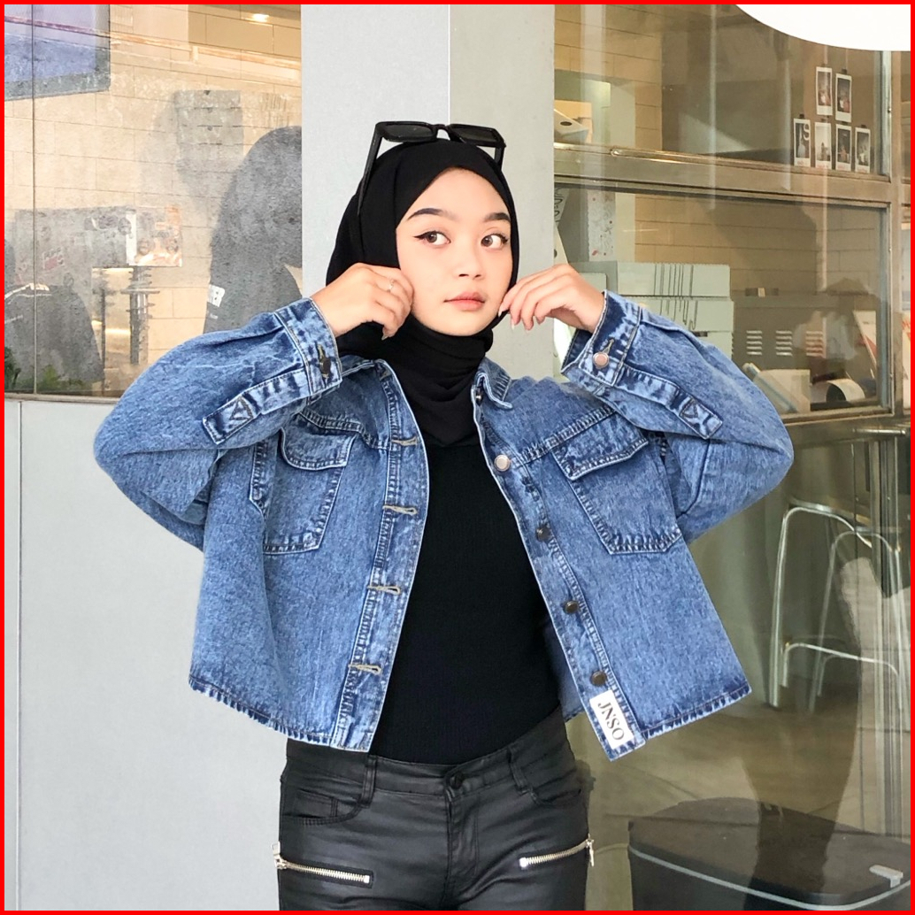 Jiniso Jaket Crop Jeans Oversize Baggy Pocket Blue Acid