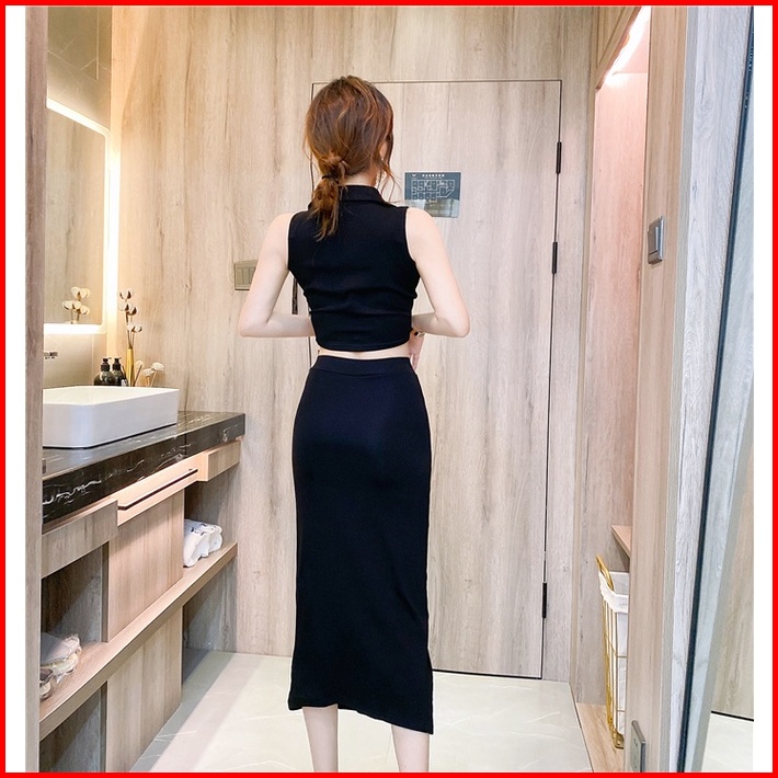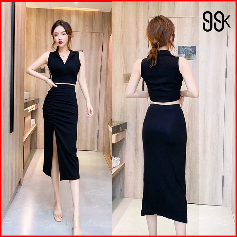 One Set Dress Sleeveless V Neck Crop Top Split Midi Skirt 1368 S M L Xl