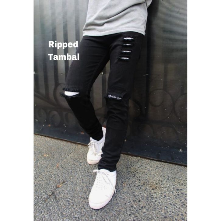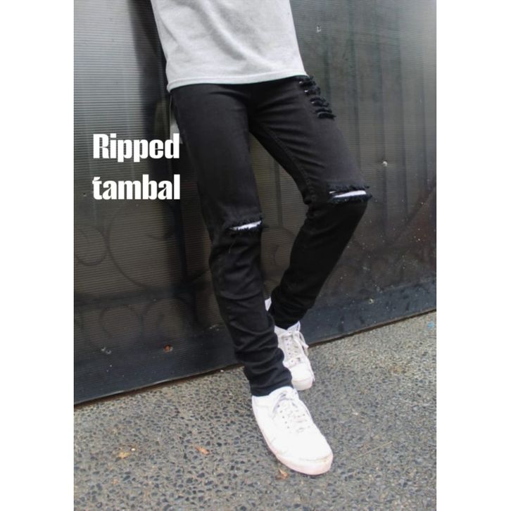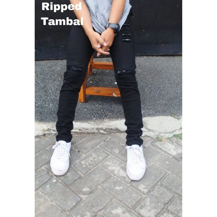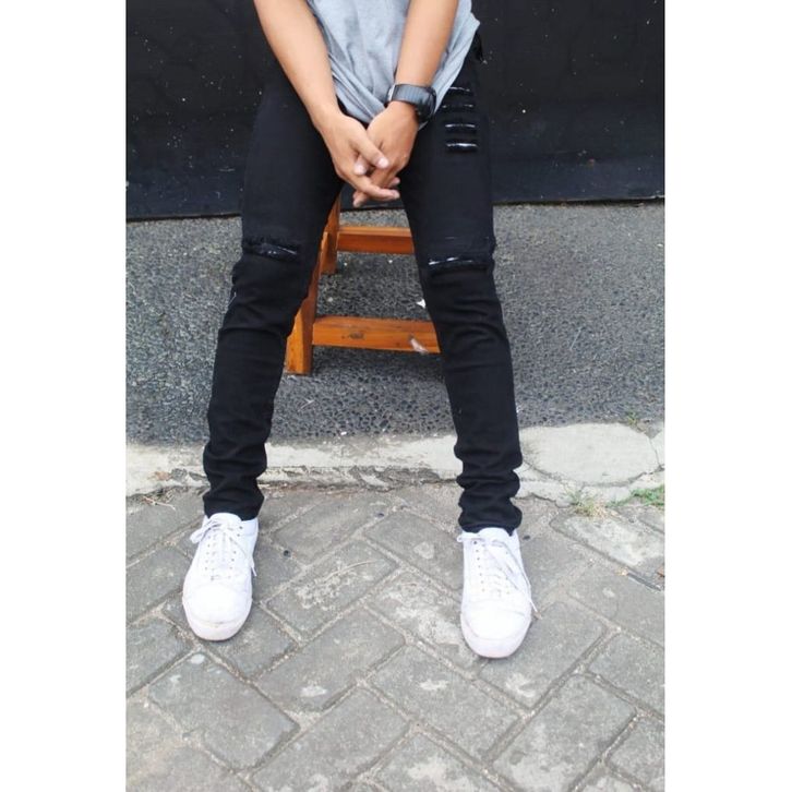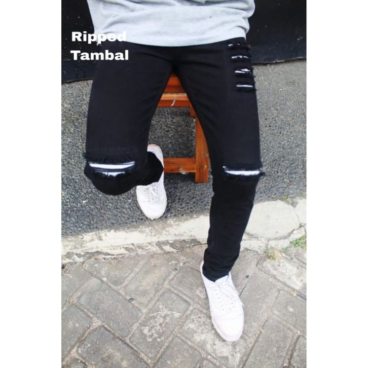 Celana Jeans Pria Sobek Emblem Bordir / Celana Sobek Pria Pakai lapisan