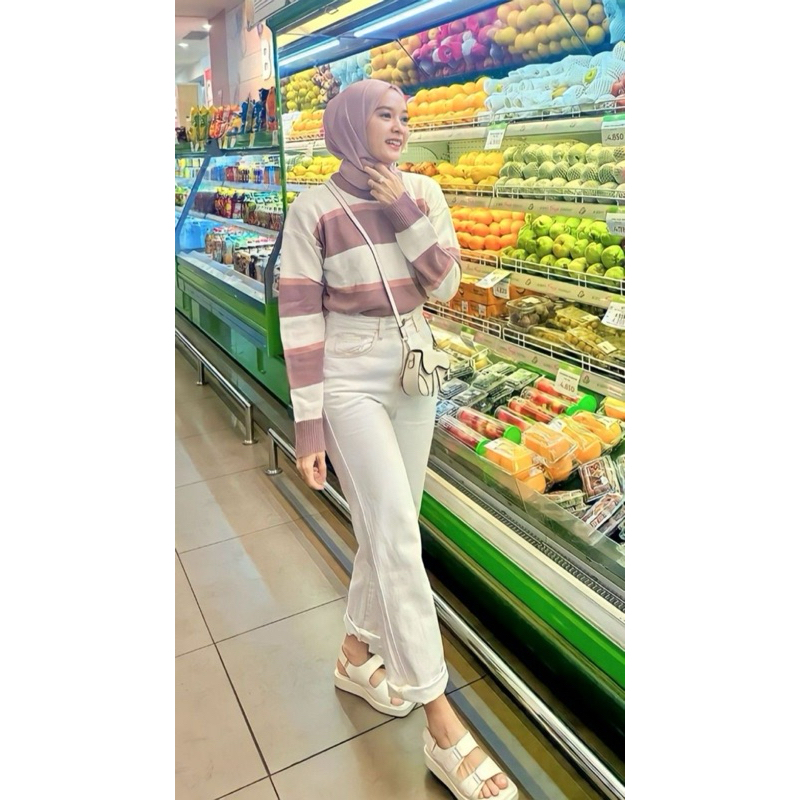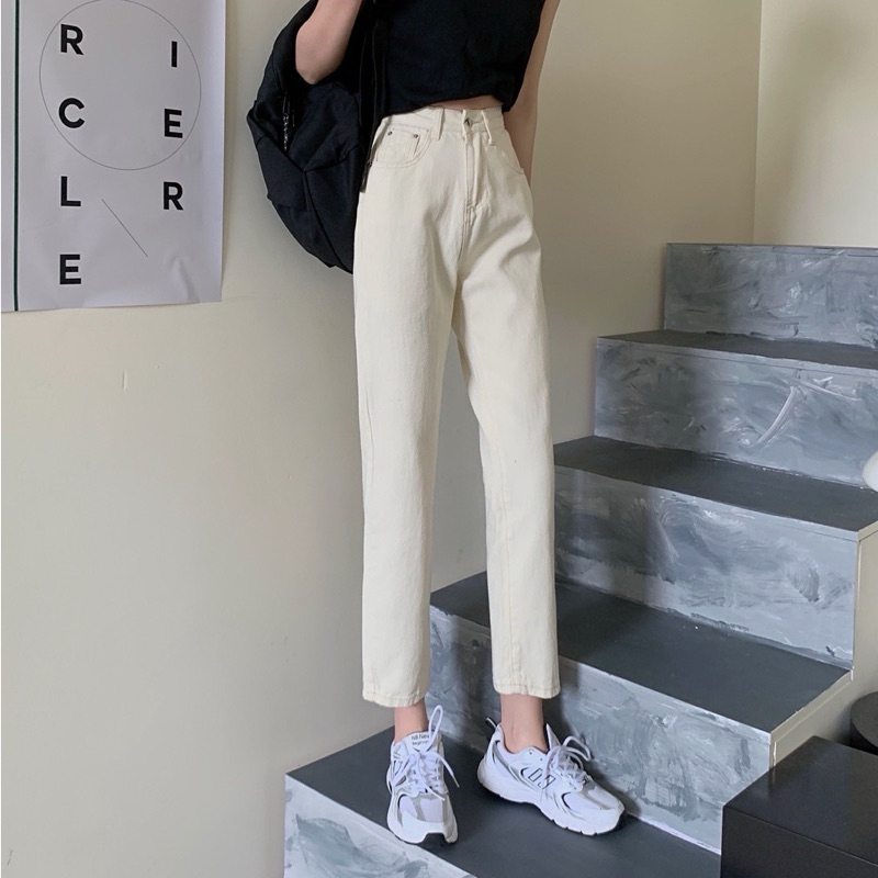 CELANA BEIGE JEANS BOYFRIEND HIGHWAIST PINGGANG KARET