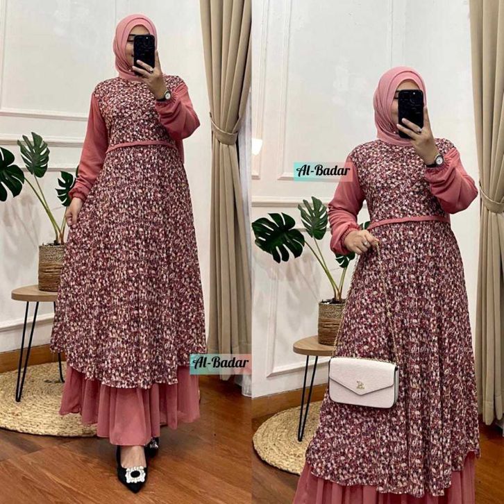 gamis dua layer motif bunga bahan ceruty babydoll dress kondangan modern baju wanita terbaru kekinian gamis lebaran 2025