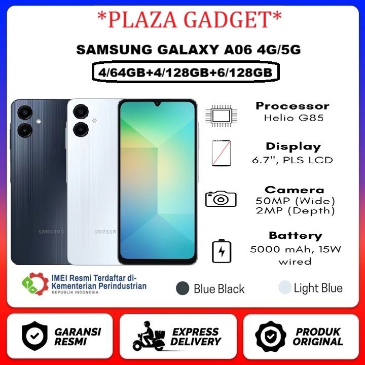 SAMSUNG A06 4G/5G 4/64GB+4/128GB+6/128GB Chipset: Mediatek Helio G85 (12 nm)Battery: Type Li-Po 5000 mAh, Charging 25W