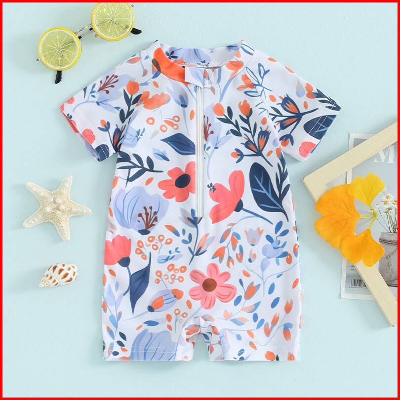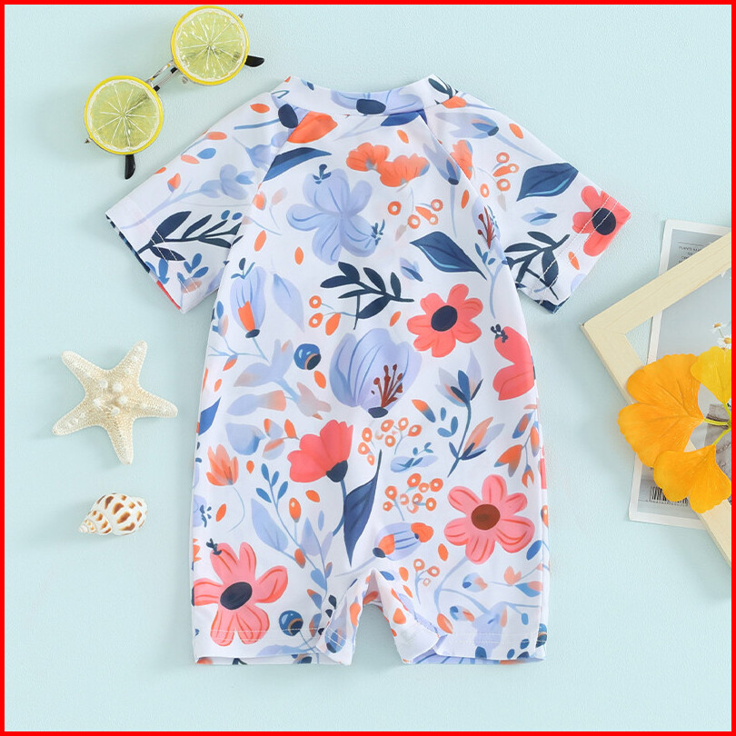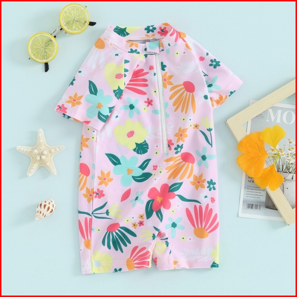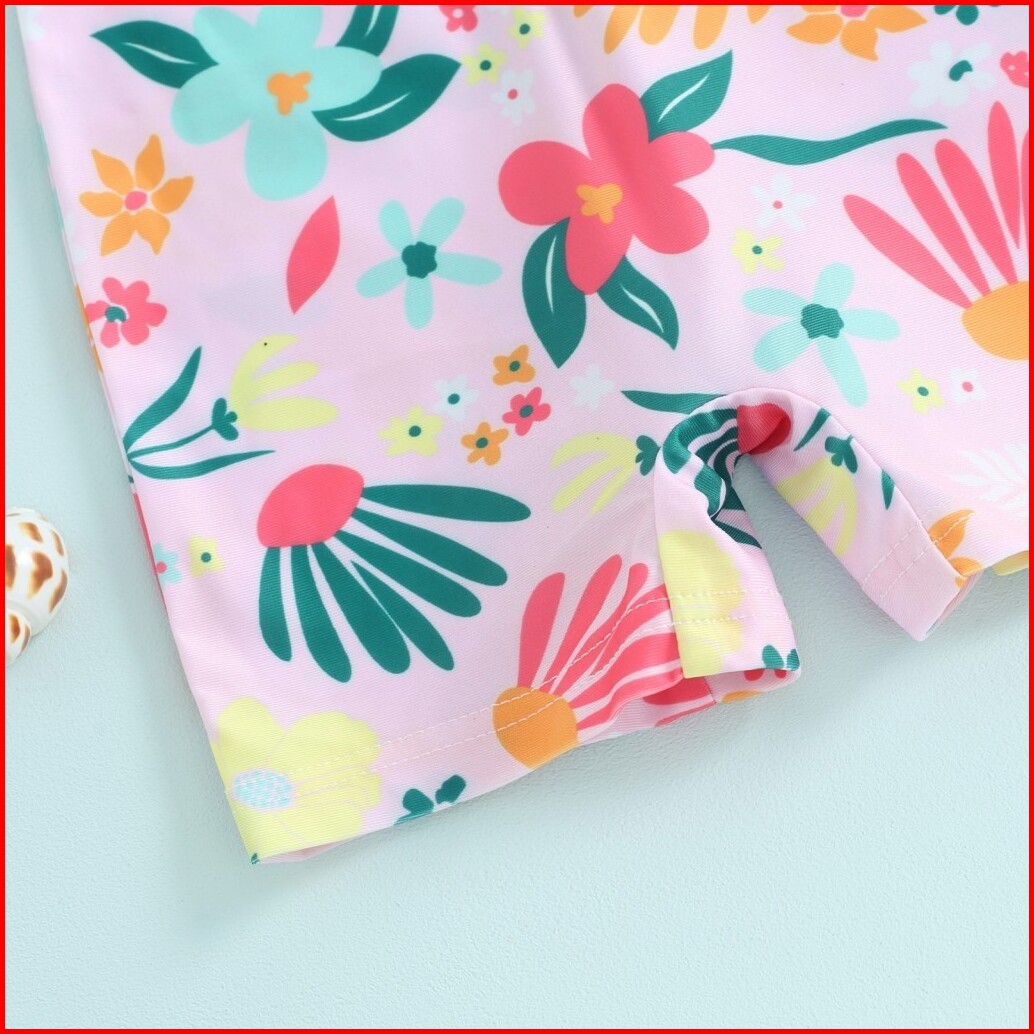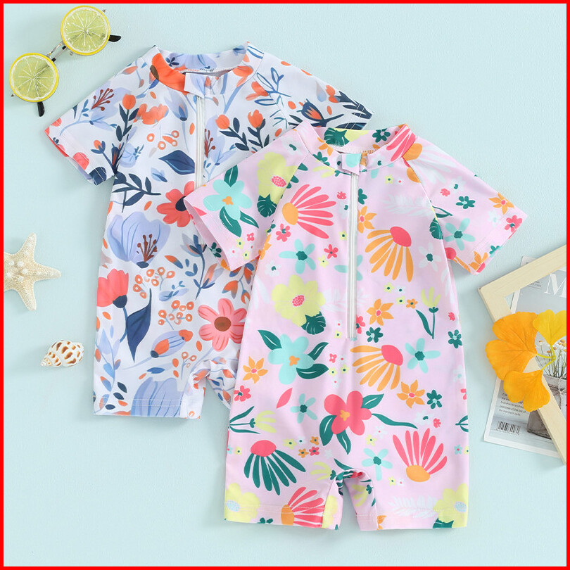 Baju Renang Pelindung Ruam Balita Perempuan Baju Monyet Ritsleting Lengan Pendek Motif Bunga Baju Renang Anak Pakaian Re