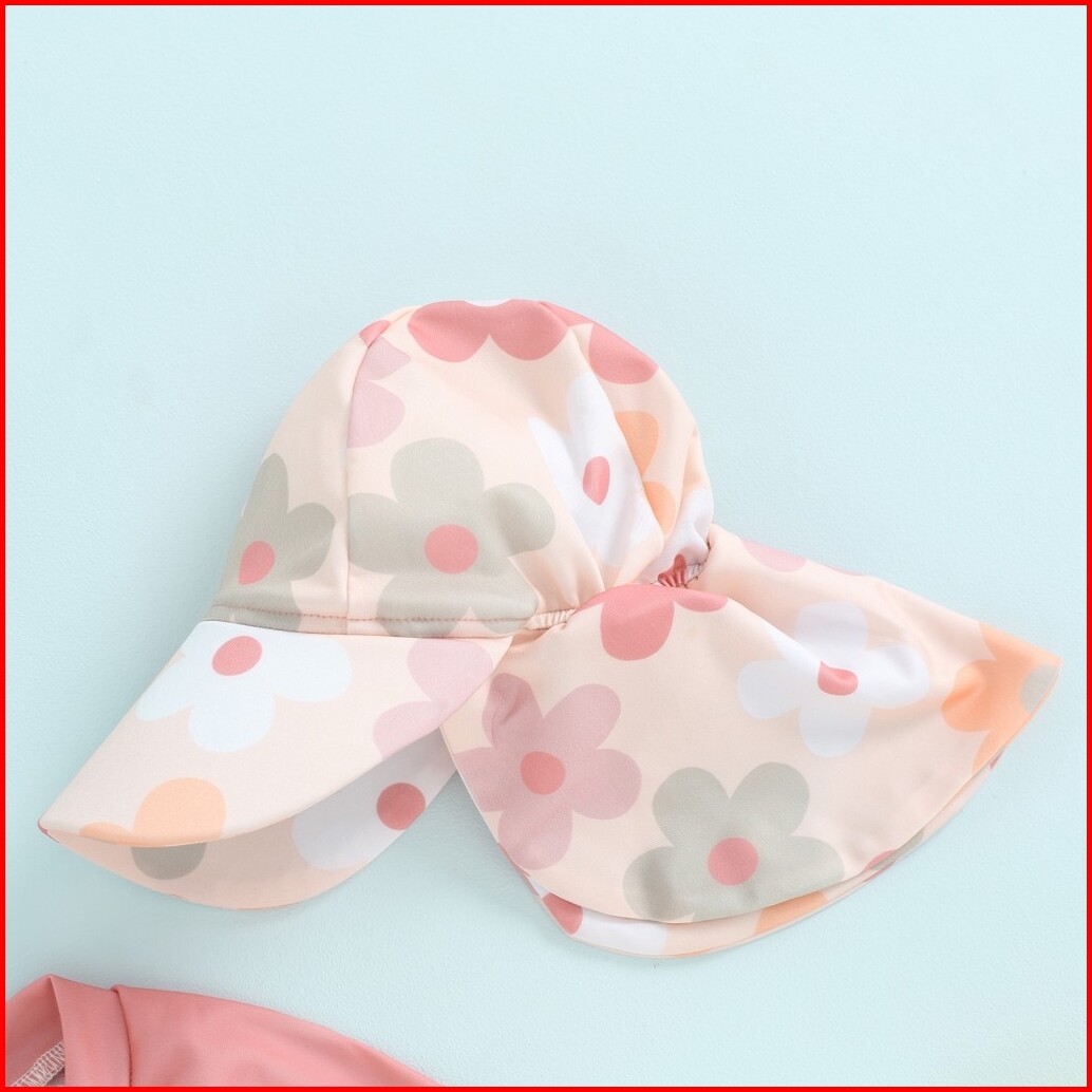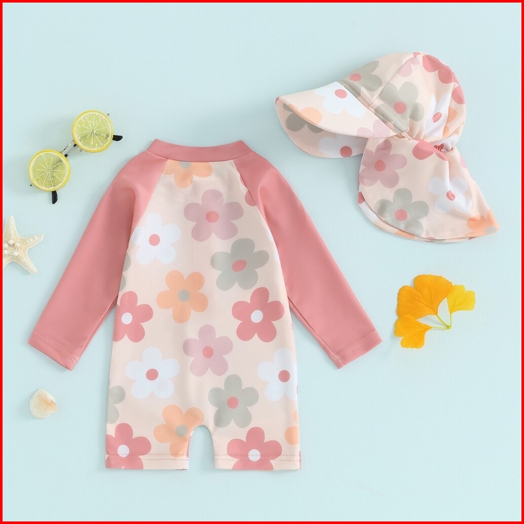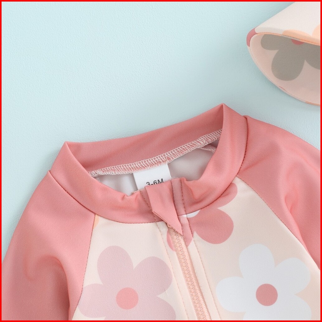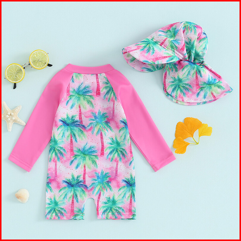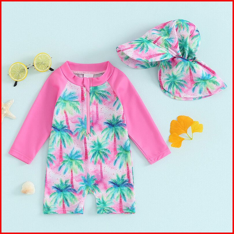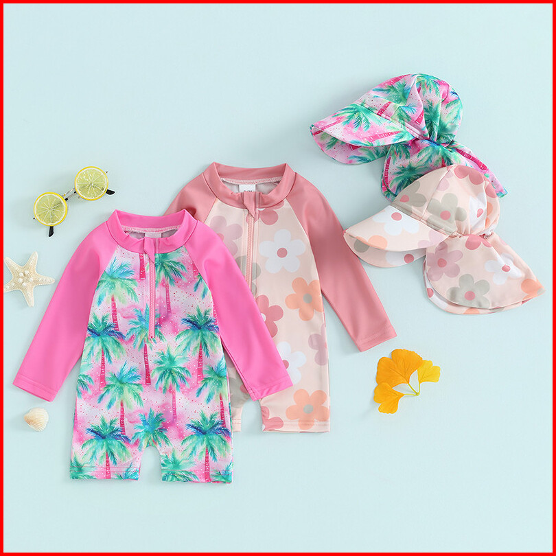 Pakaian Renang Pantai Anak Perempuan Balita Pakaian Mandi Zip Up Motif Bunga Pohon Tropis Lengan Panjang Dengan Topi