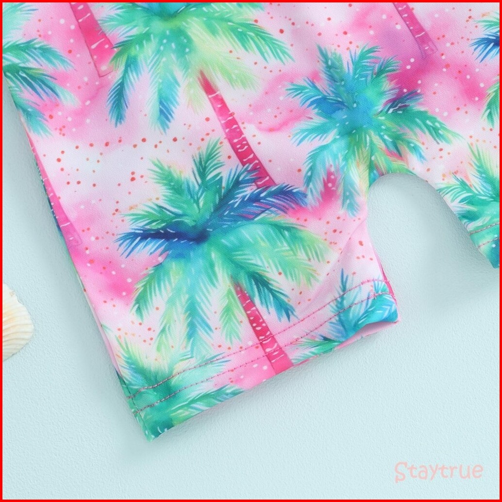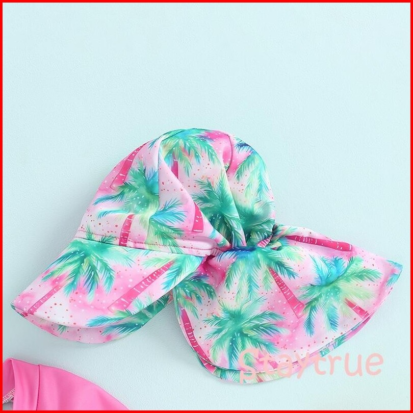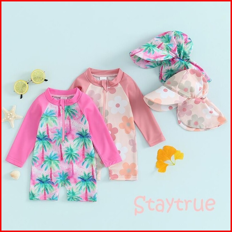 Pakaian Renang Pantai Anak Perempuan Balita Pakaian Mandi Zip Up Motif Bunga Pohon Tropis Lengan Panjang Dengan Topi