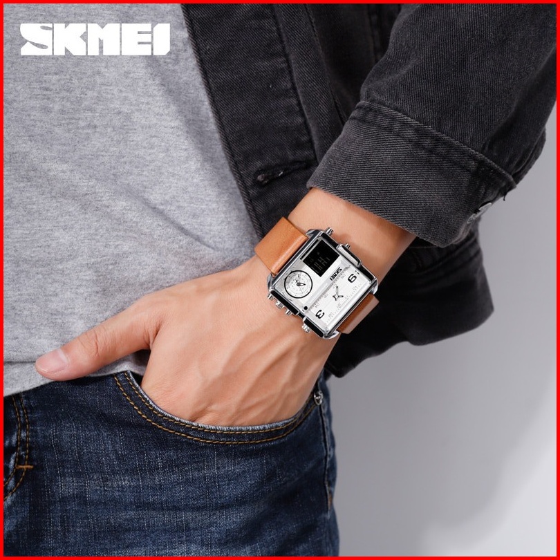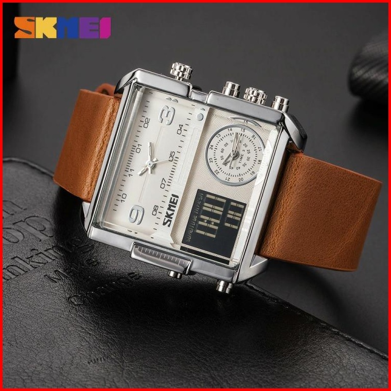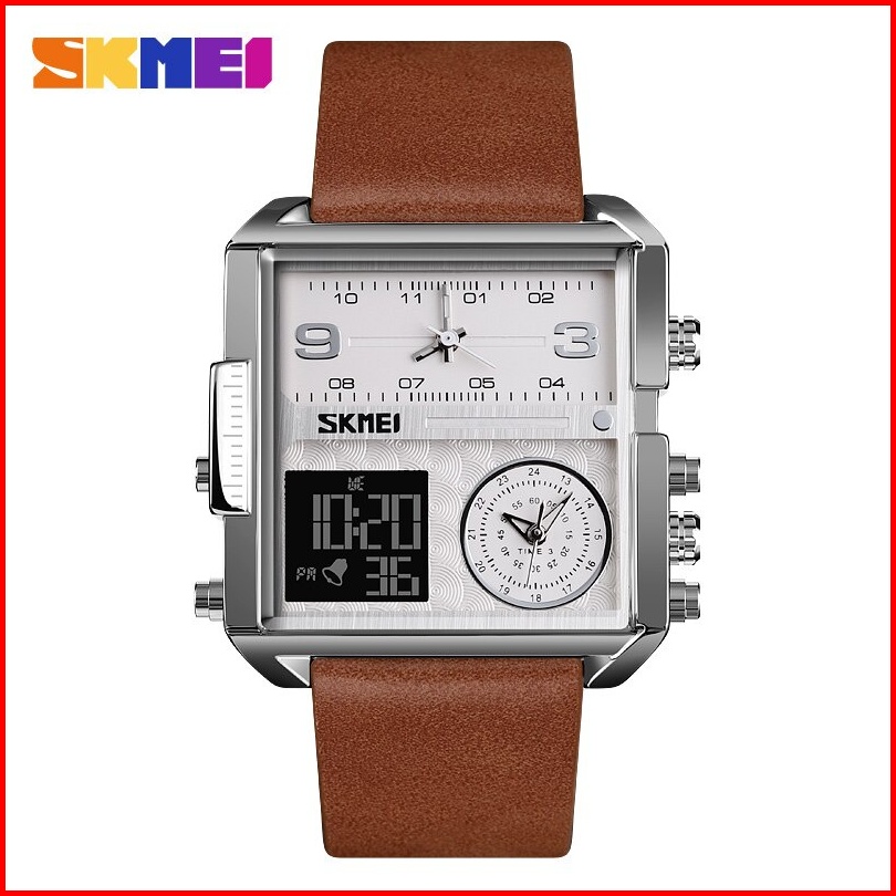Jam Tangan Pria Skmei Digital Analog 1584 Silver Brown Leather Water Resistant 30m