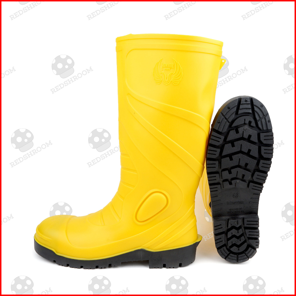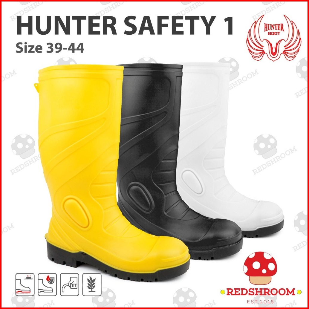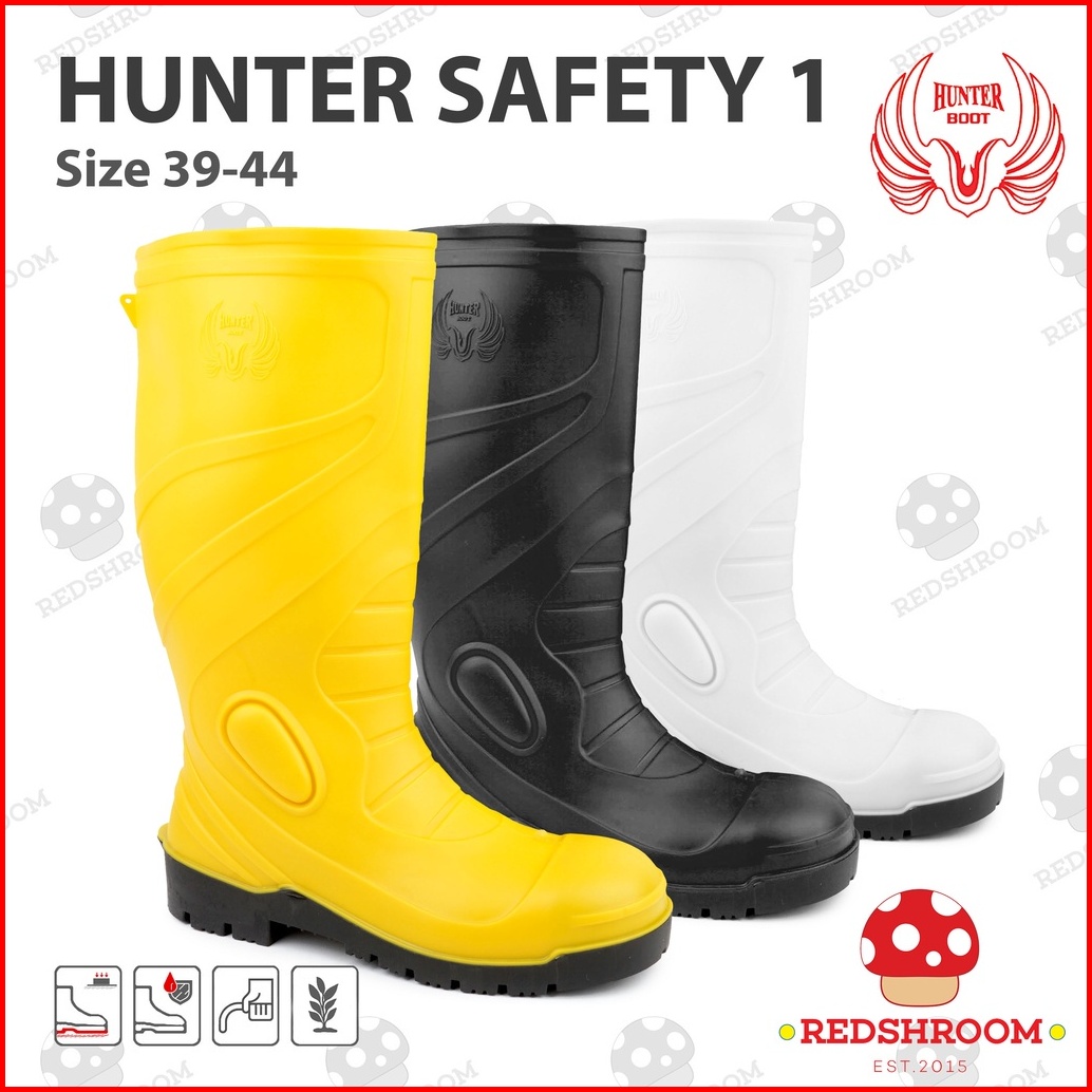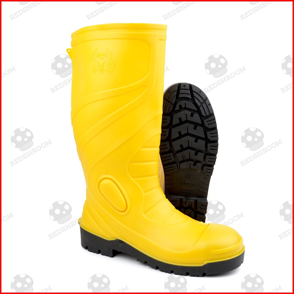 Sepatu Boot Tinggi Hunter Safety 1 Hitam Kuning Putih Toe Cap Besi Anti Slip Air Karet Lokal