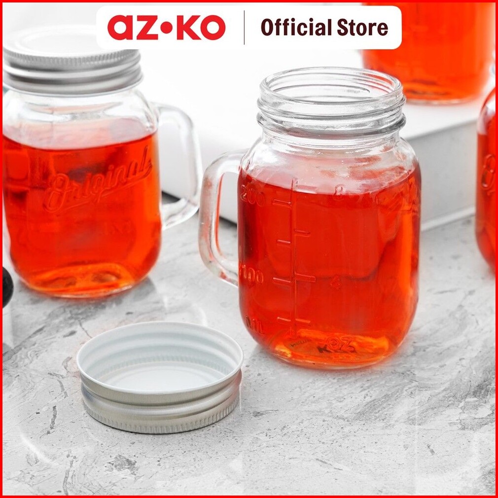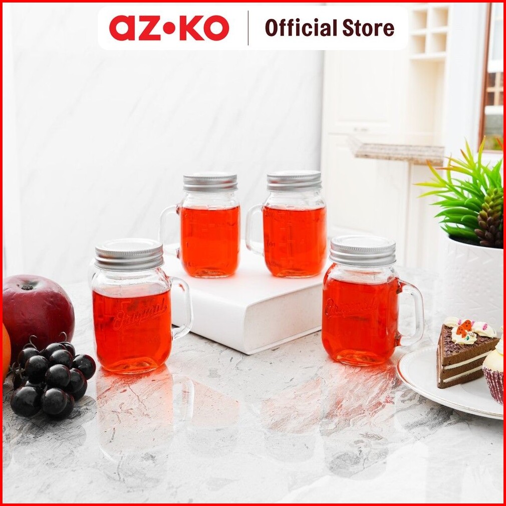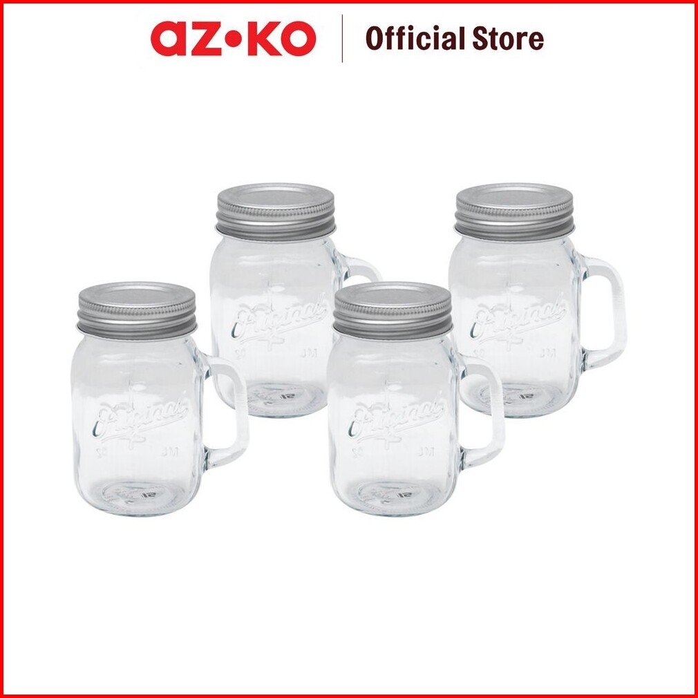 Azko Delicia 300 Ml Set 4 Pcs Mason Mug Jar Dengan Tutup Gelas Beling Dengan Handle Cup Wadah Minuman Perlengkapan Dapur