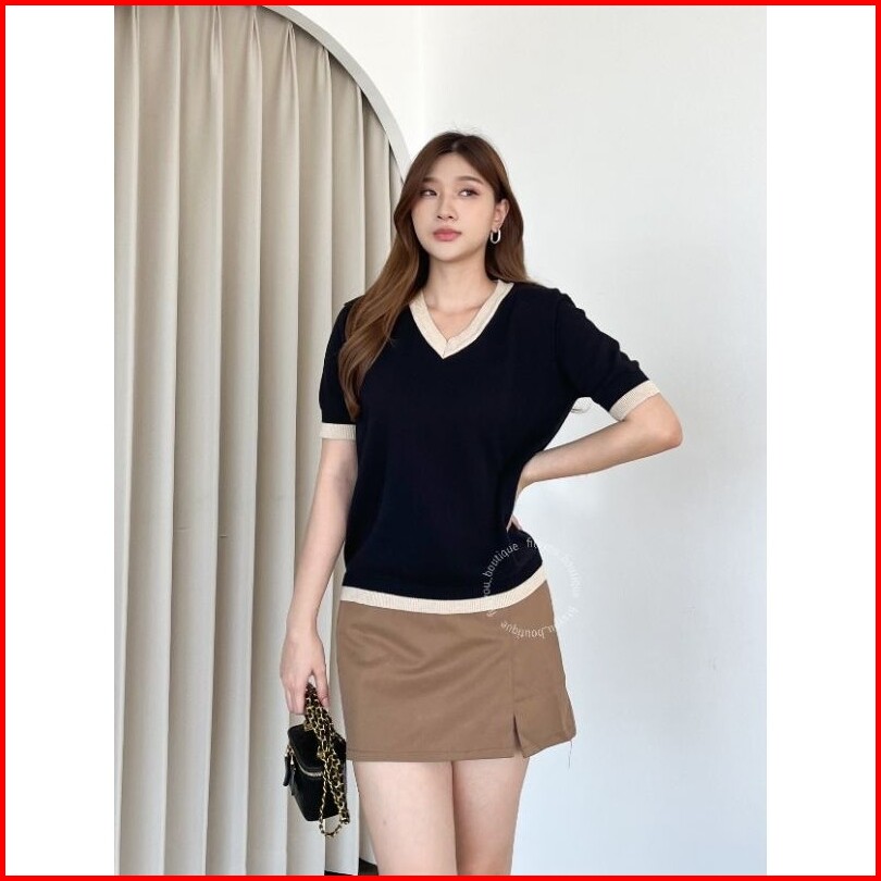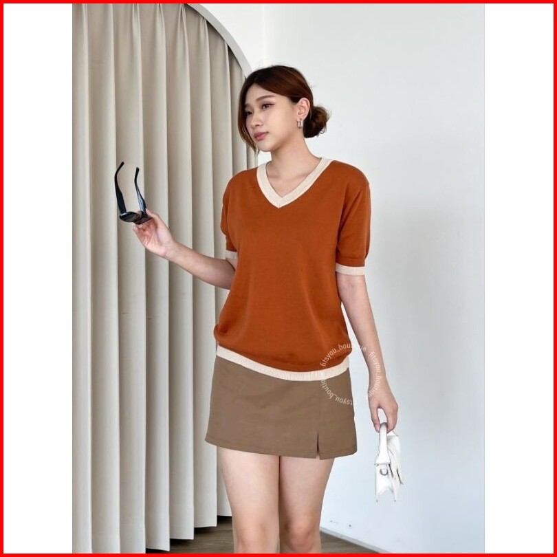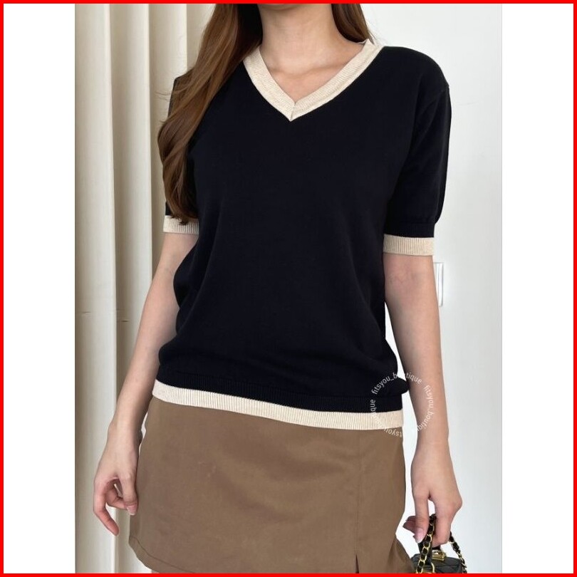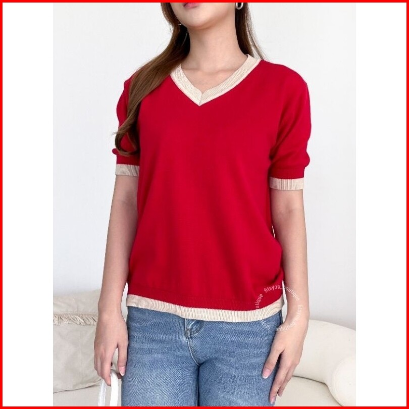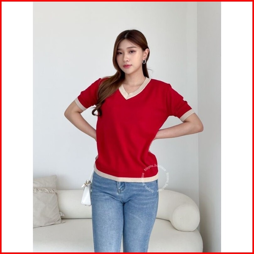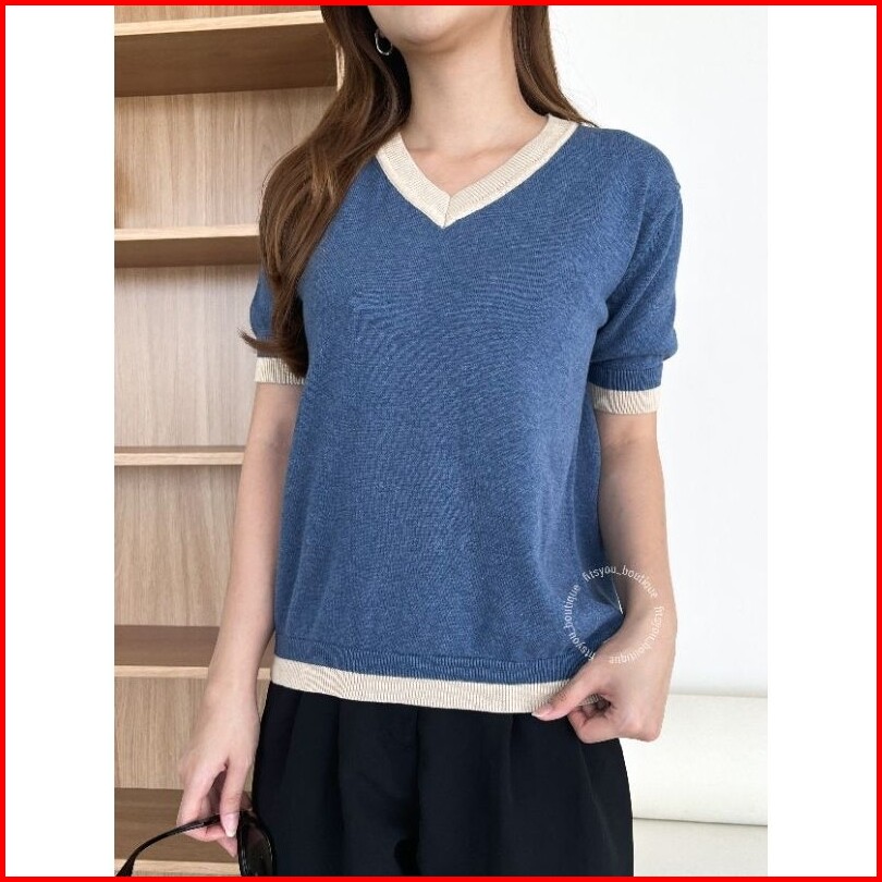 Nichi Knit Tops Baju Atasan Rajut Wanita Katun Halus Adem Tangan Pendek Katun Tangan Pendek Vneck