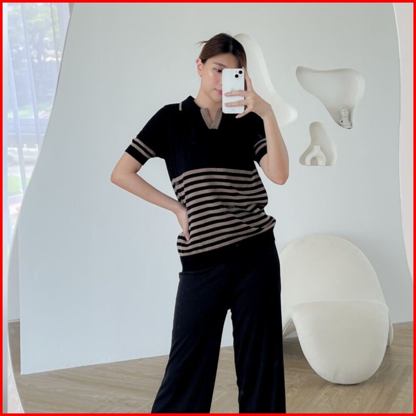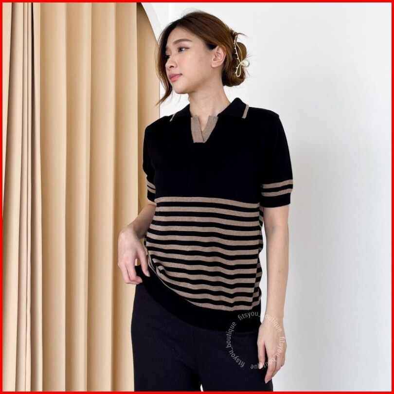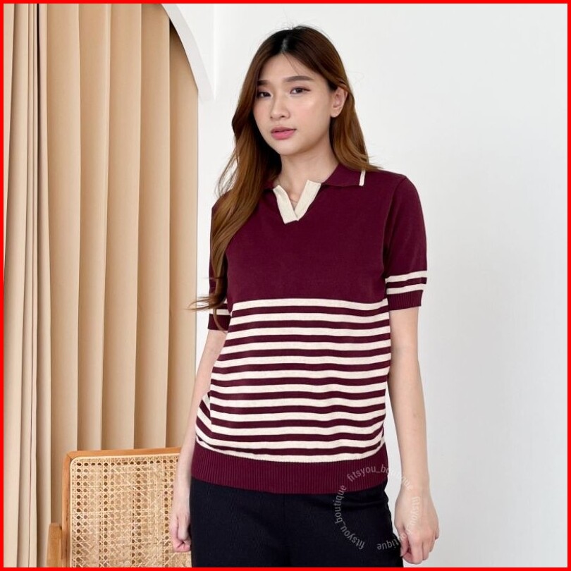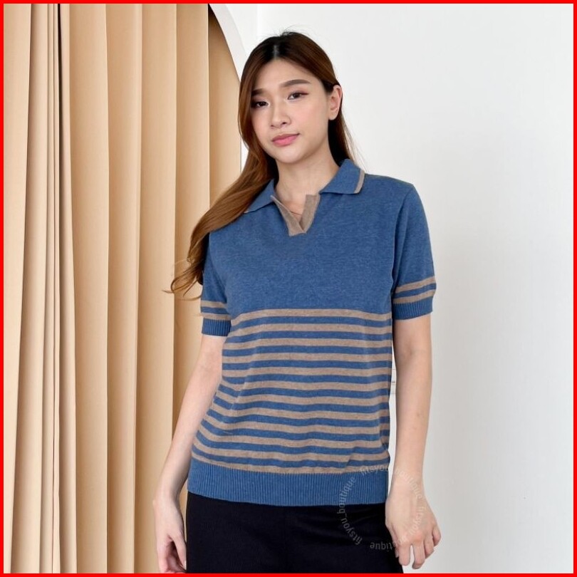 Prinsa Knit Tops Atasan Rajut Katun Wanita Tangan Pendek Garis Halus Adem Serap Keringat Vneck Baju Daily