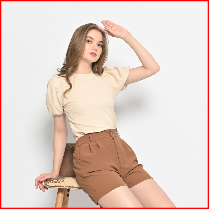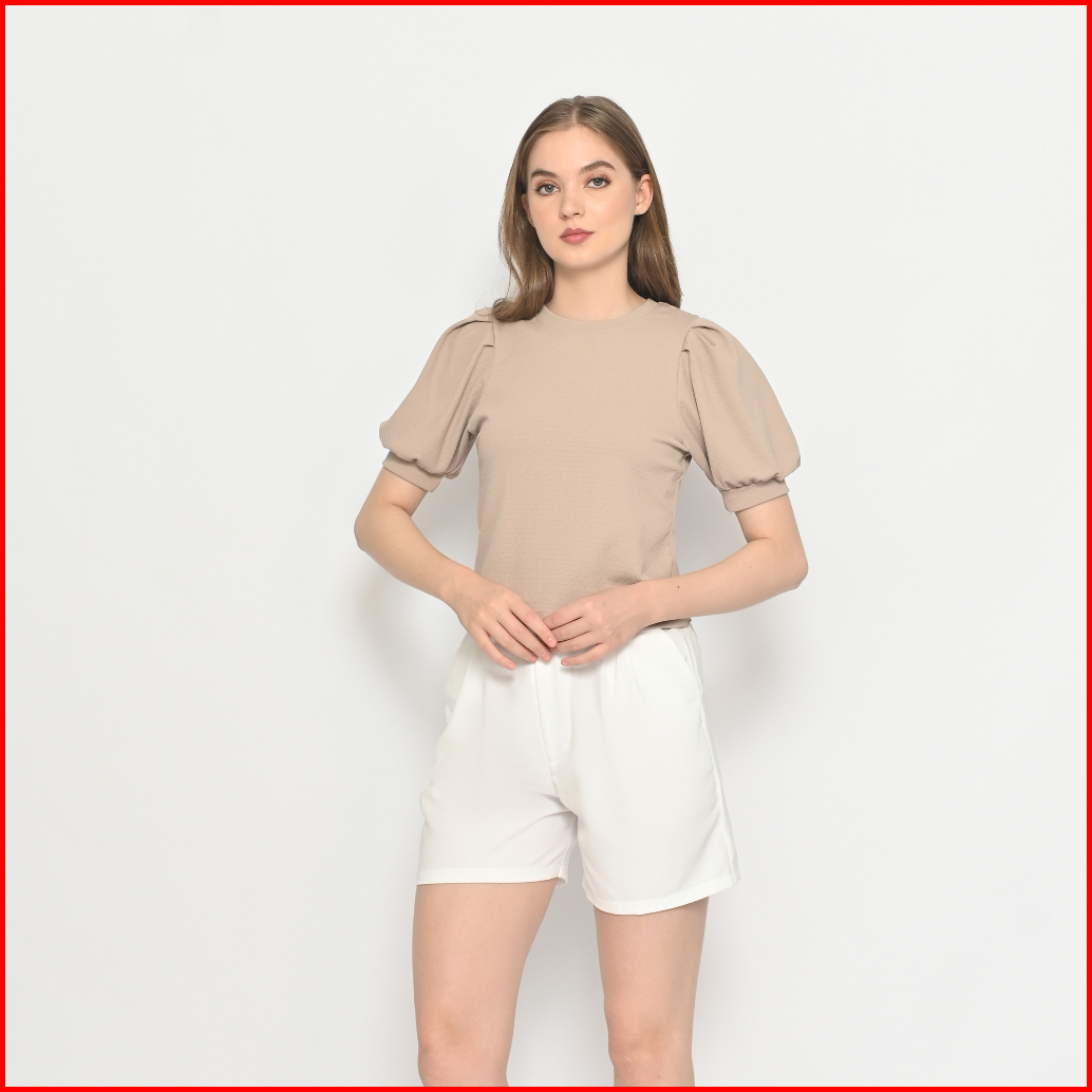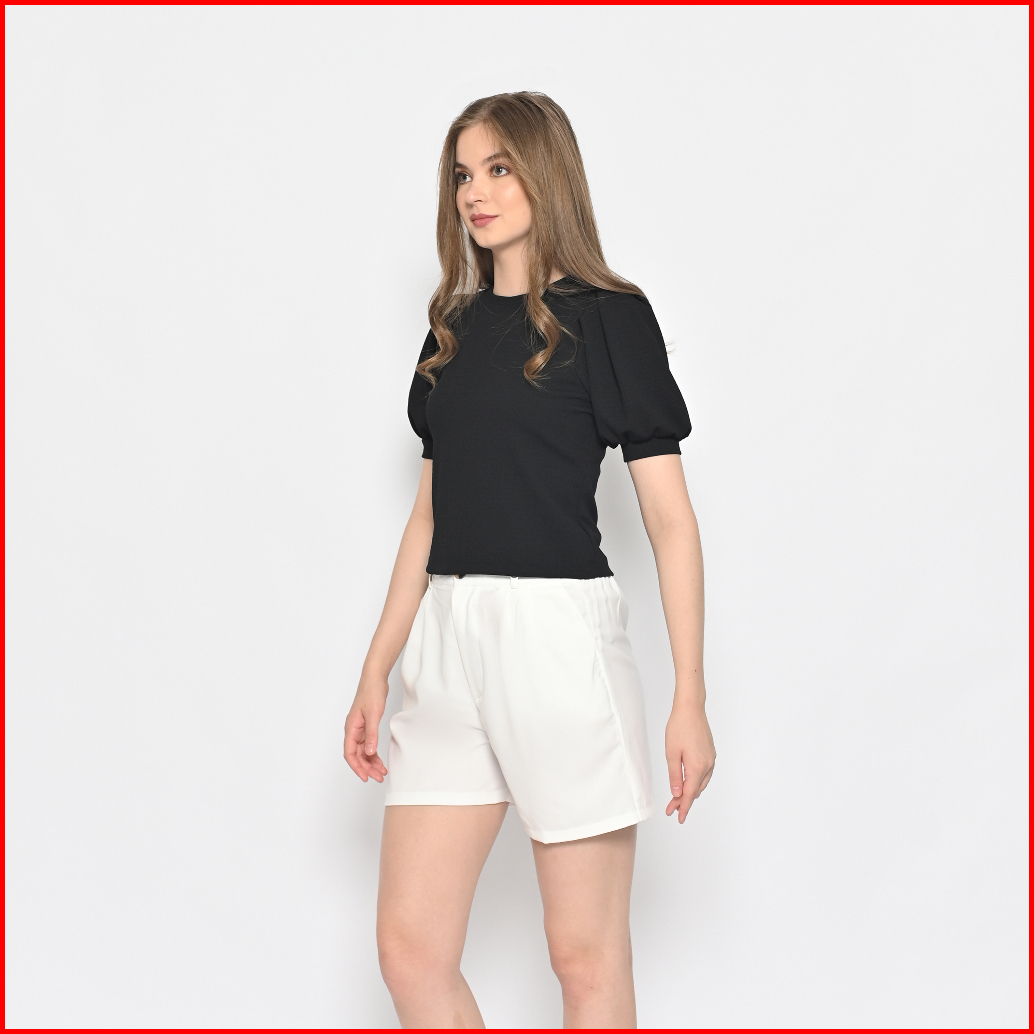 Queentin Kaos Crop Wanita 0282 Katun Knit Brickwork Vertical Stretch Lengan Pendek Balon Puff