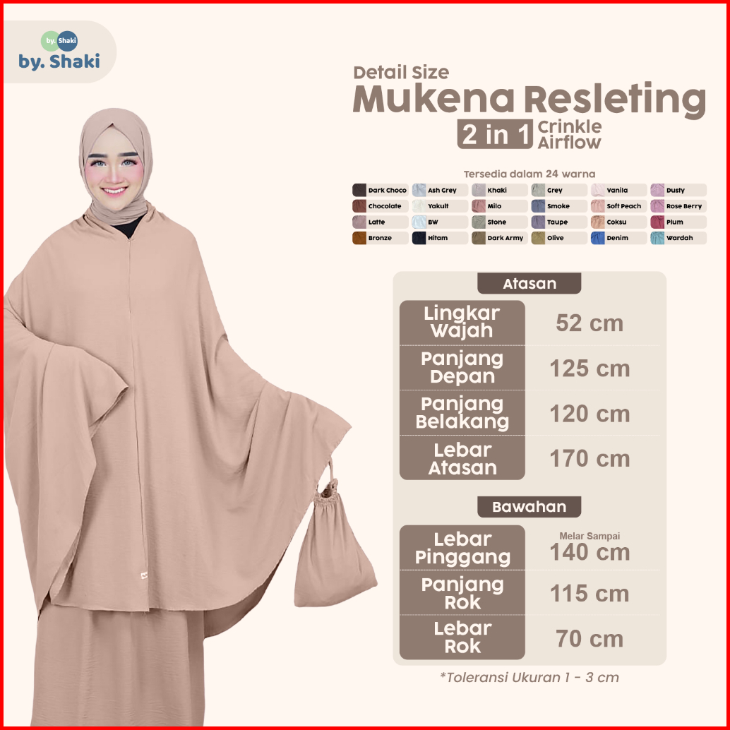 Putih, Khaki, Dusty, Rose Berry, Stone, Grey, Vanila, Yakult, Soft Peach, Ash Grey, Hitam, Late, Milo, Bronze, Plum, Chocolate, Dark choco, Smoke, Olive, Dark Army, Denim, Coksu, Wardah, Taupe, Violet, Matcha, Soft Milo