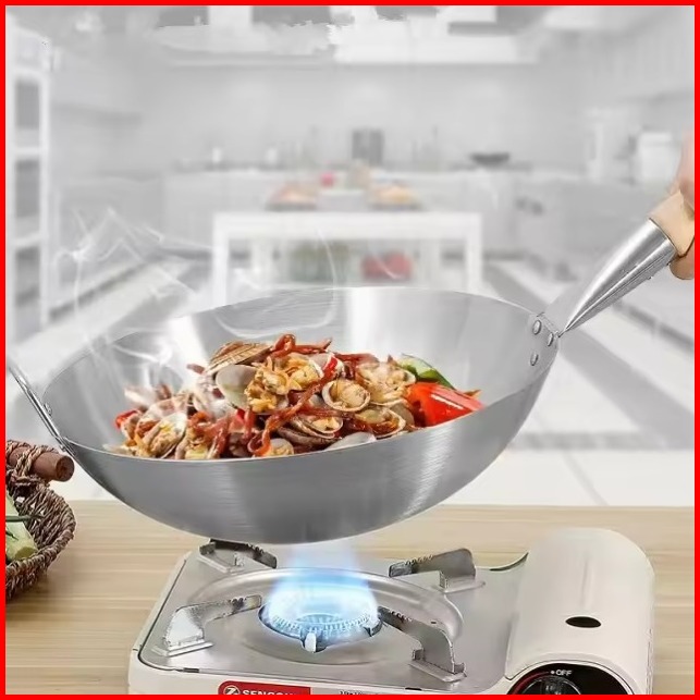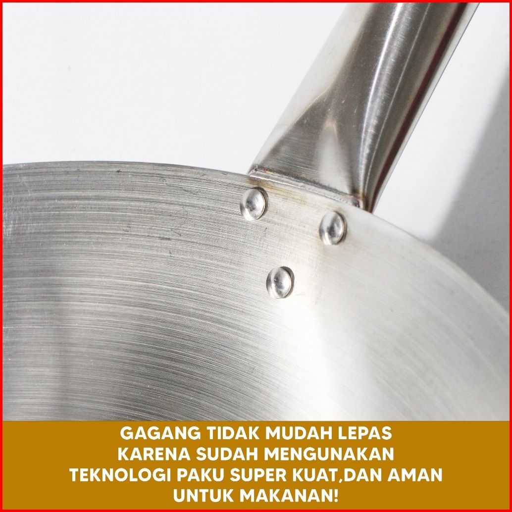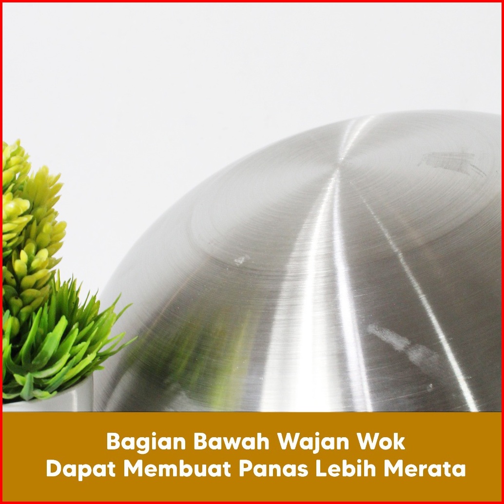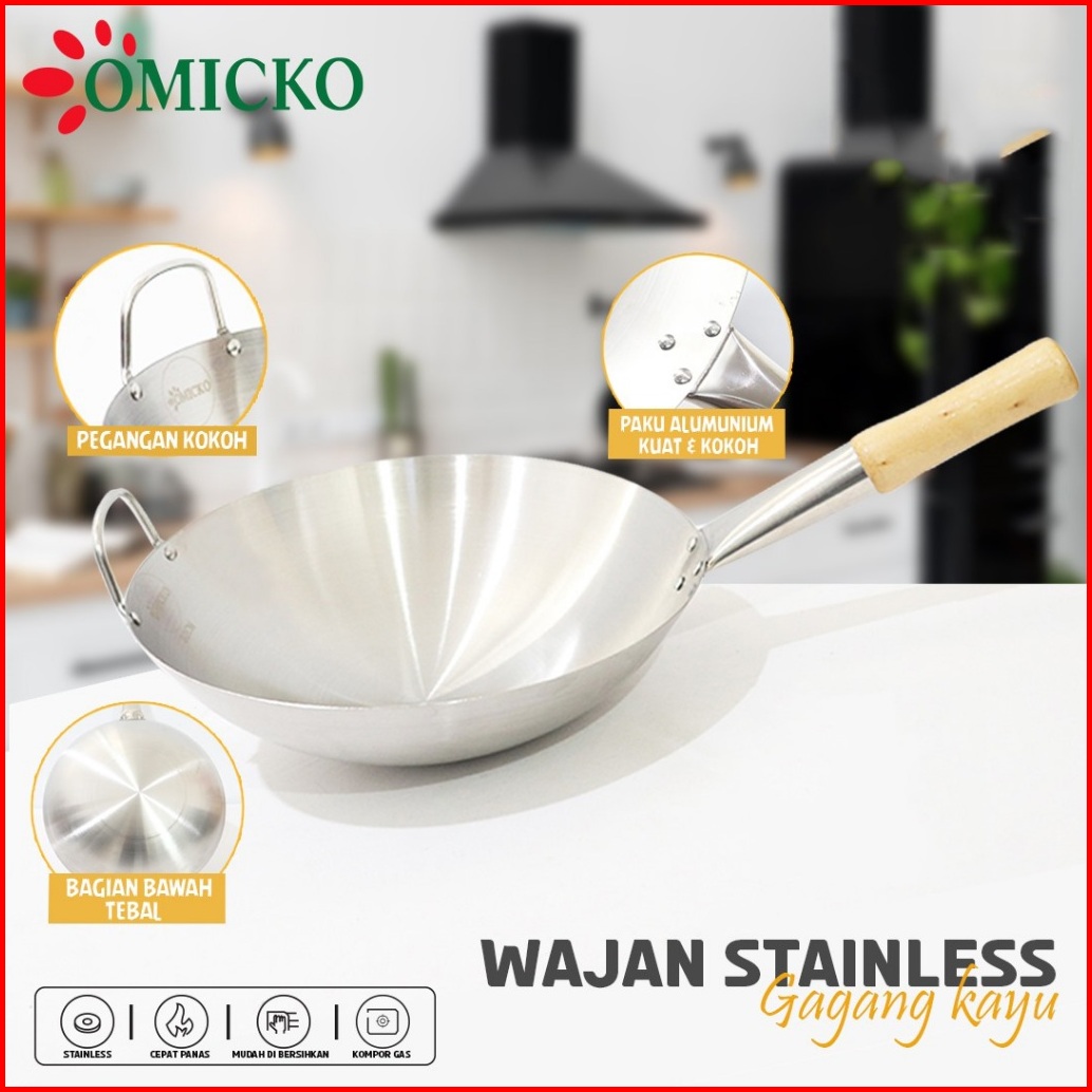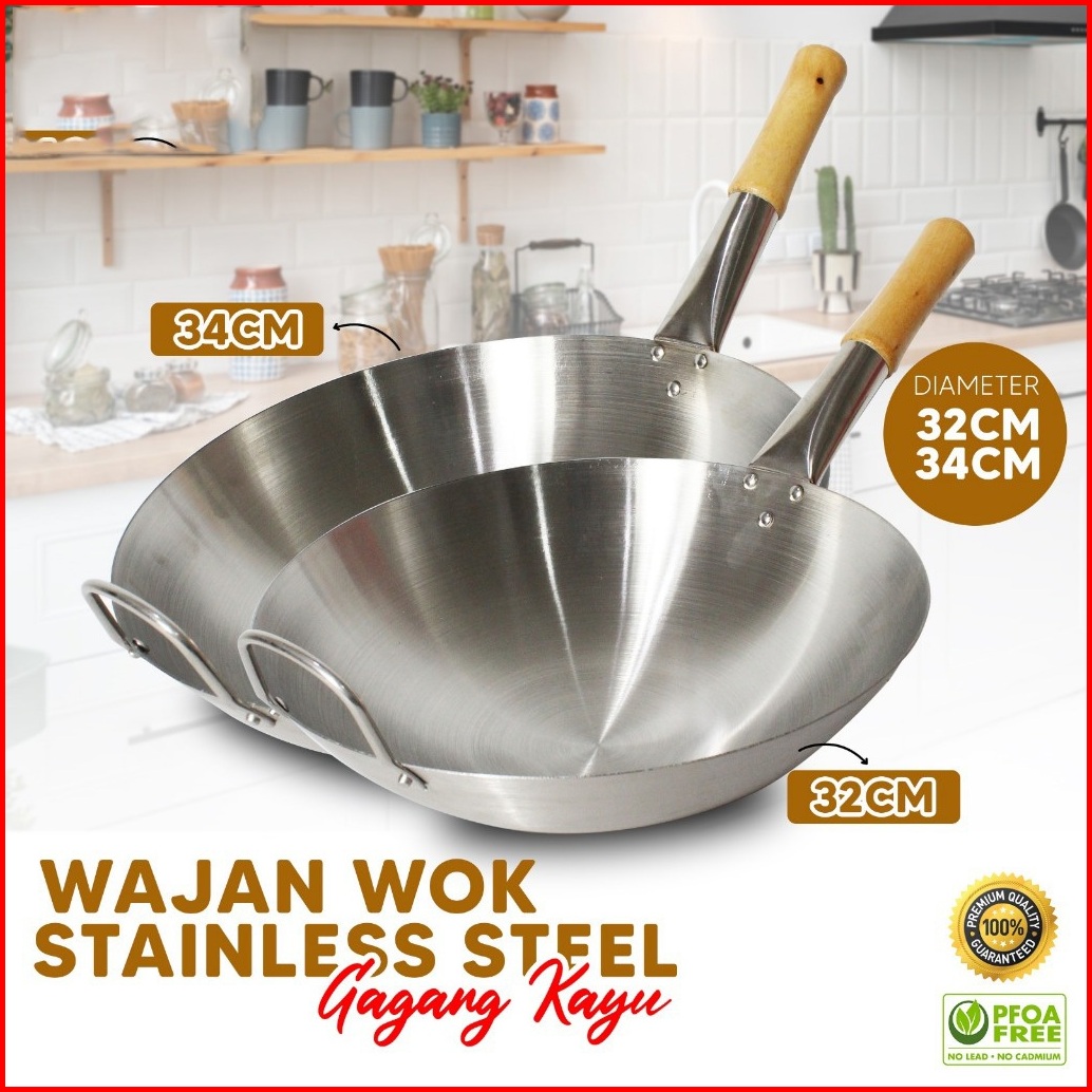 Wajan Penggorengan Kuali Stainless Steel Gagang Kayu Anti Panas Anti Lengket Wok Pan Wajan Nasi Goreng 32cm 34 Cm Centim