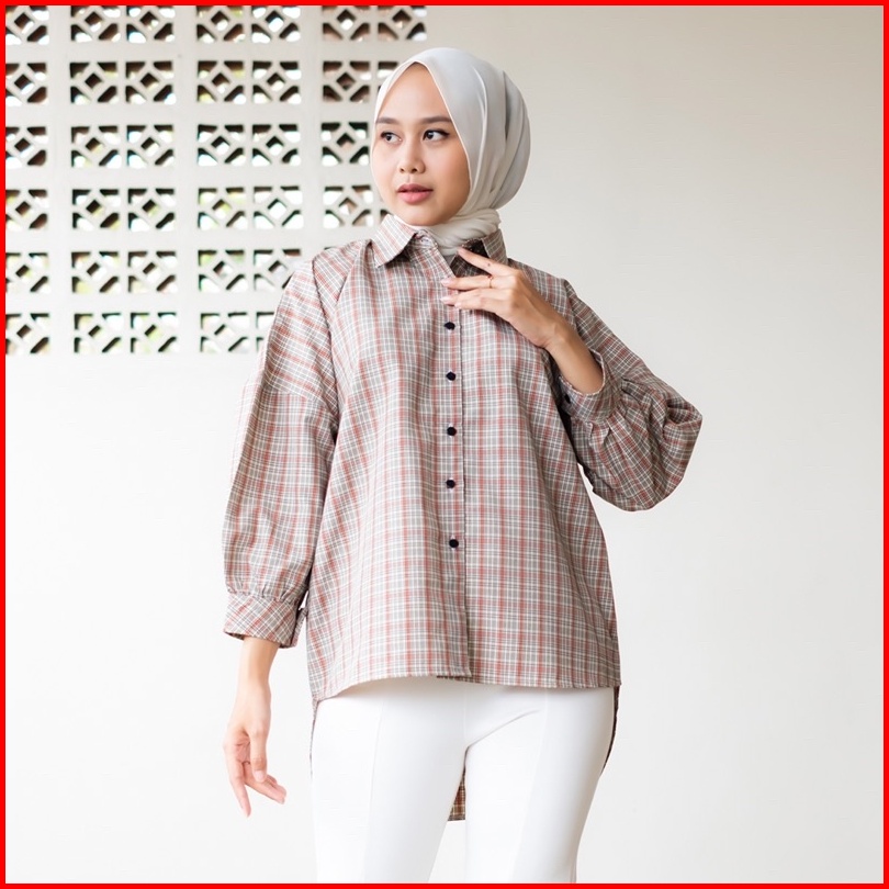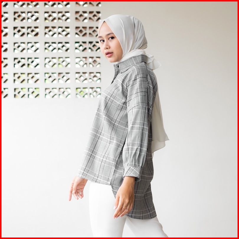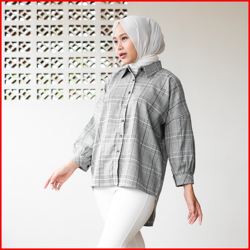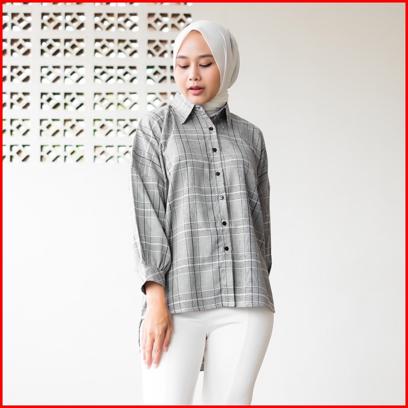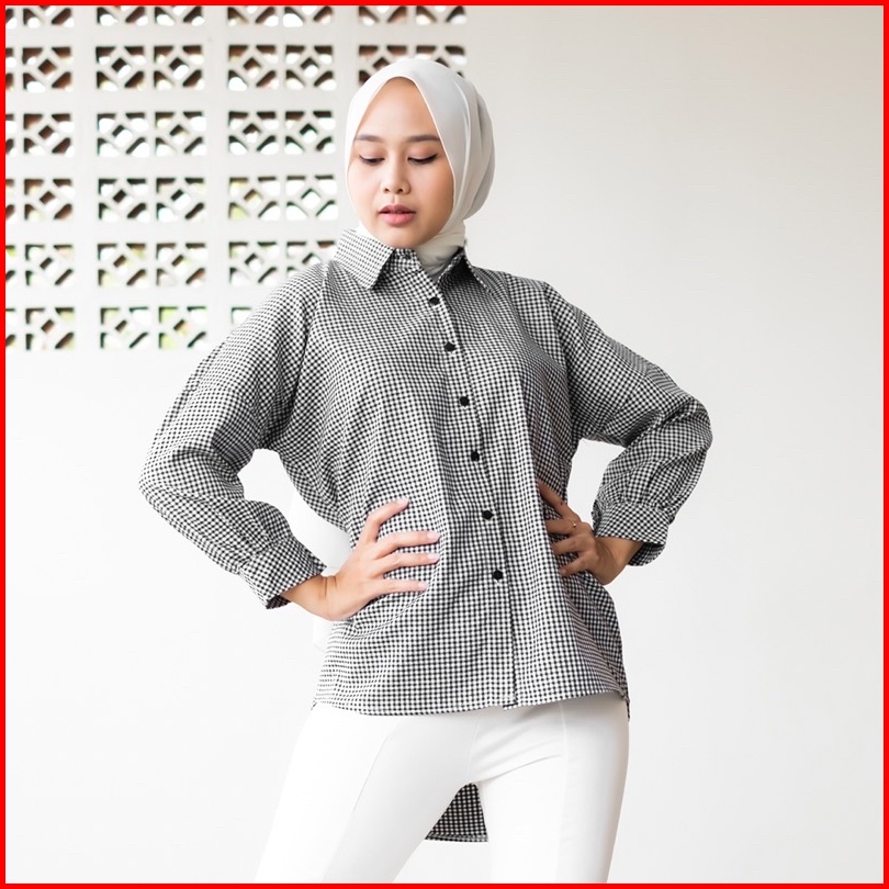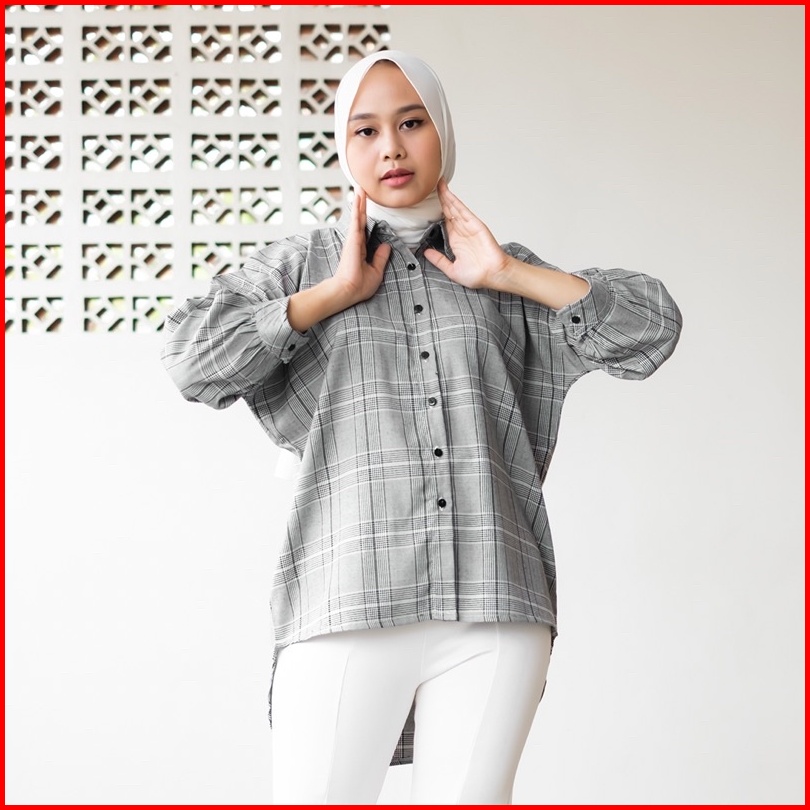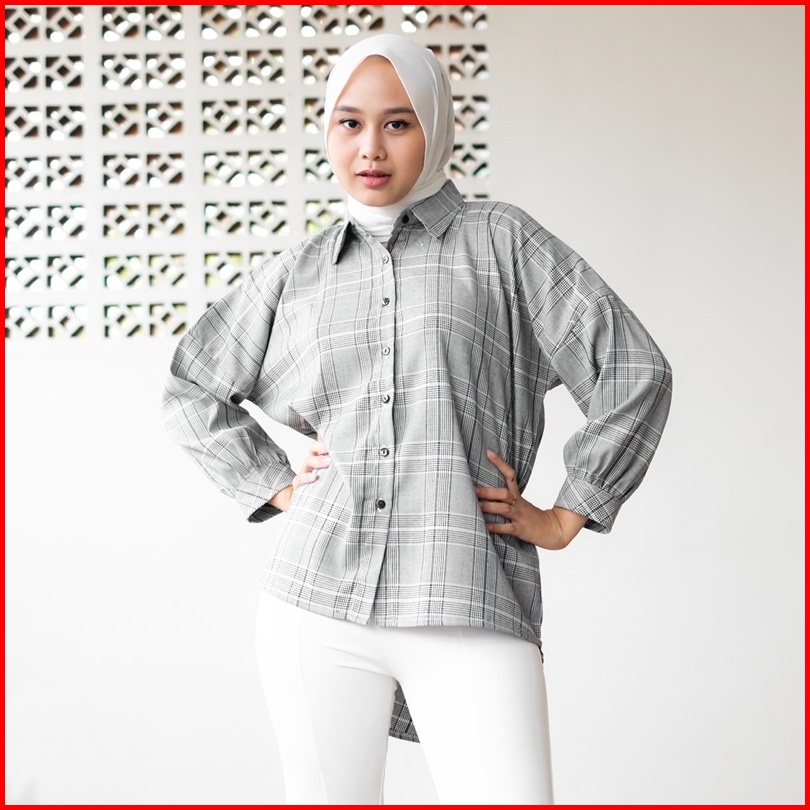 Haymeeidn - Kemeja Flanel Wanita Atasan Pinguin Oversize Lengan Panjang Cewe Pakaian Motif Kotak