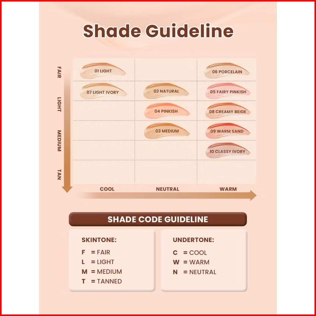 101 Light, 102 Natural, 103 Medium, 104 Pinkish, 105 Fairy Pink, 106 Porcelain, 107 Light Ivory, 108 Creamy Beige, 109 Warm Sand, 110 Classy Ivory