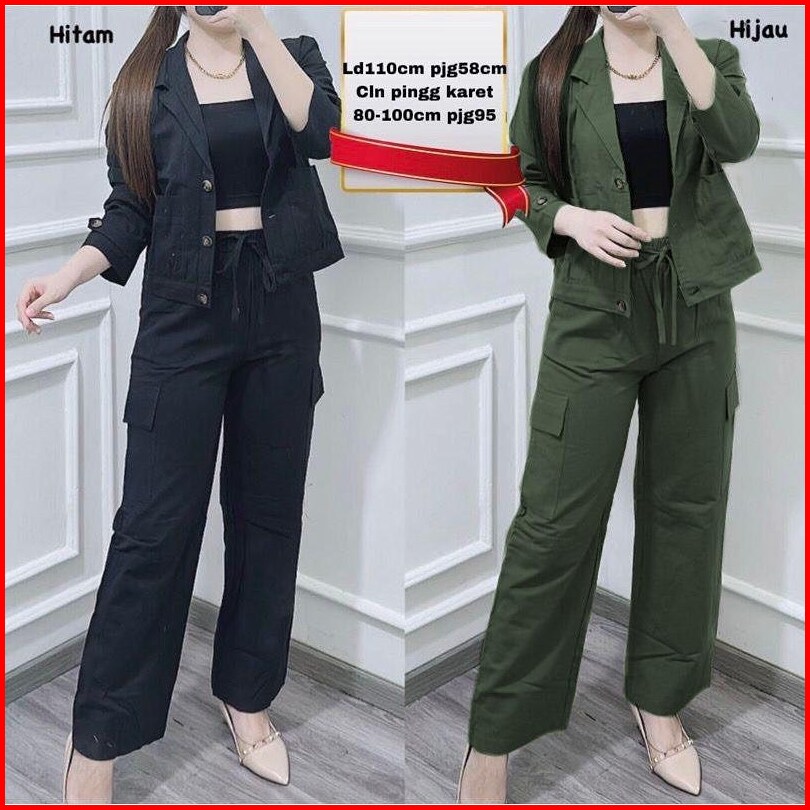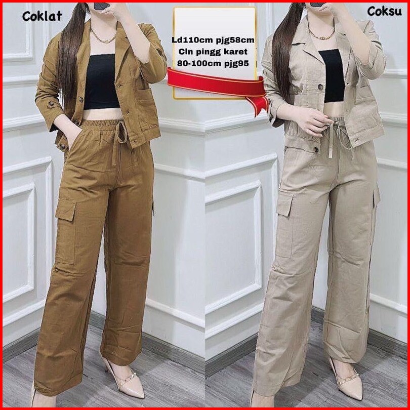 Setelan Wanita Kekinian Carla Set Cargo 2in1 Bahan Linen Rami Oneset Baju Atasan Dan Celana Gso