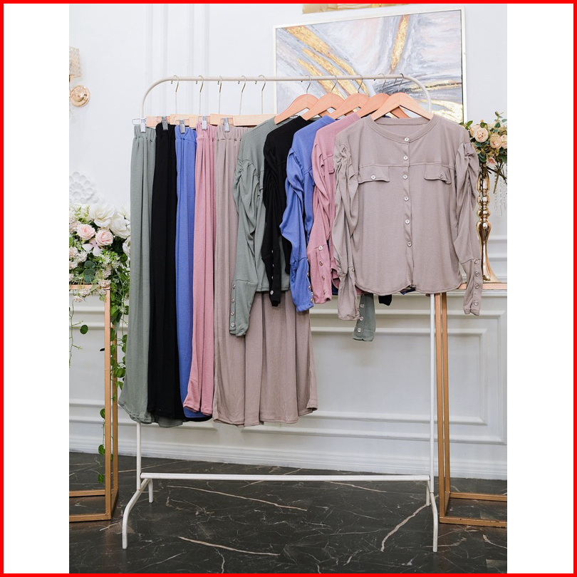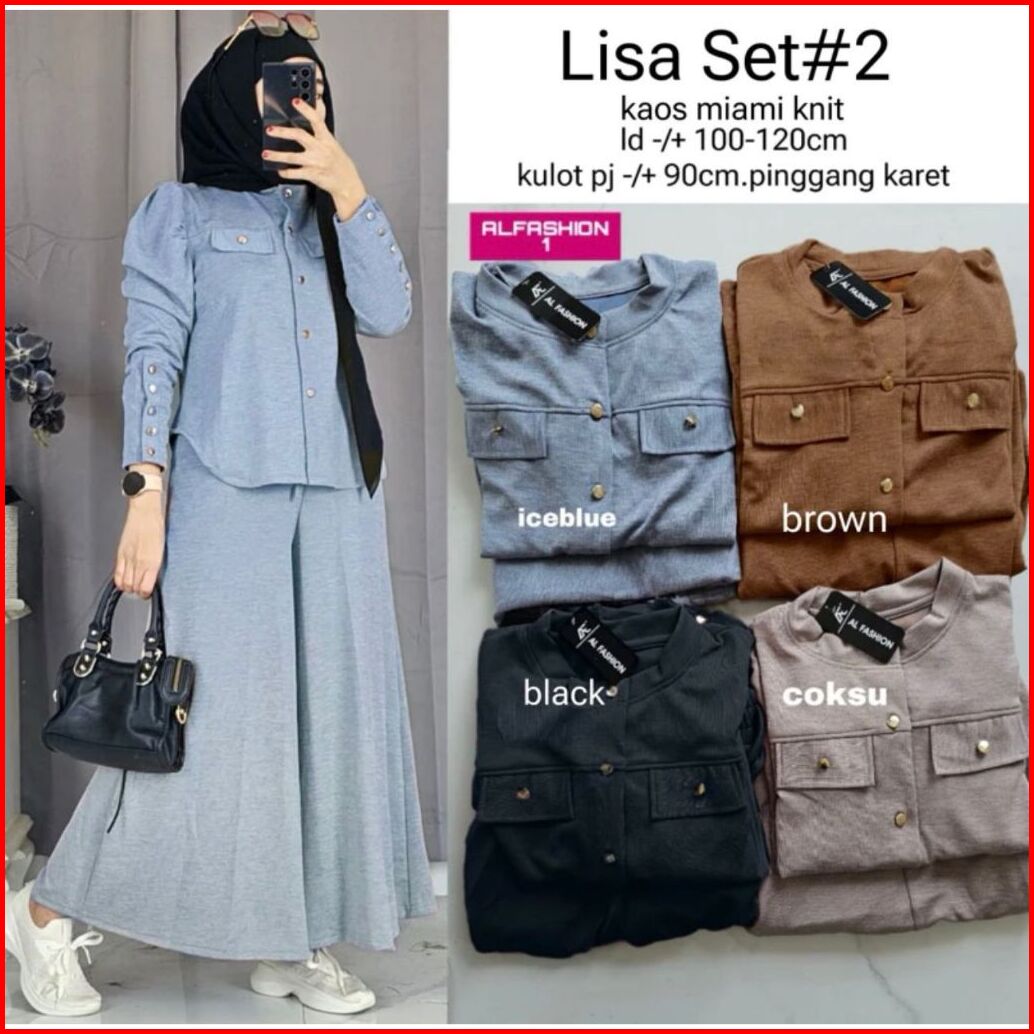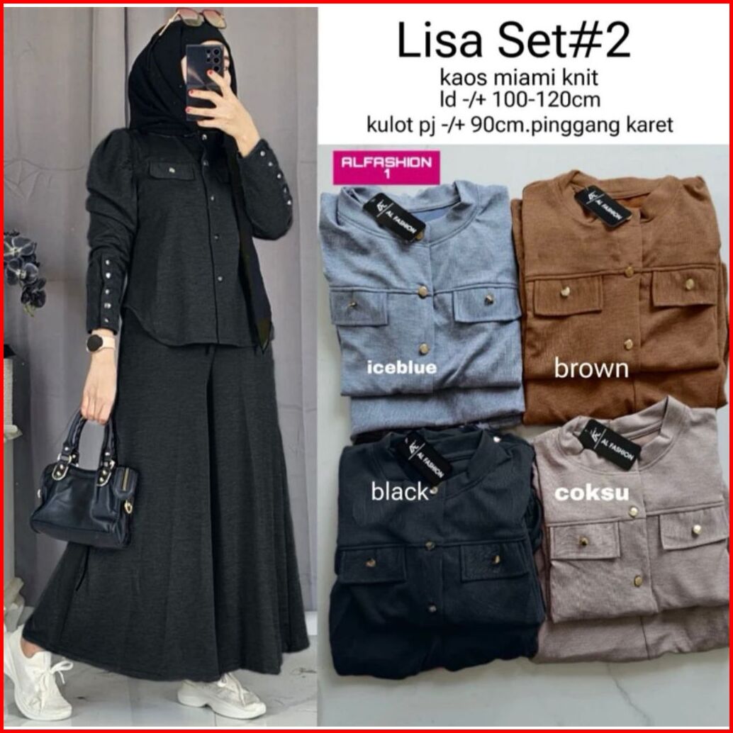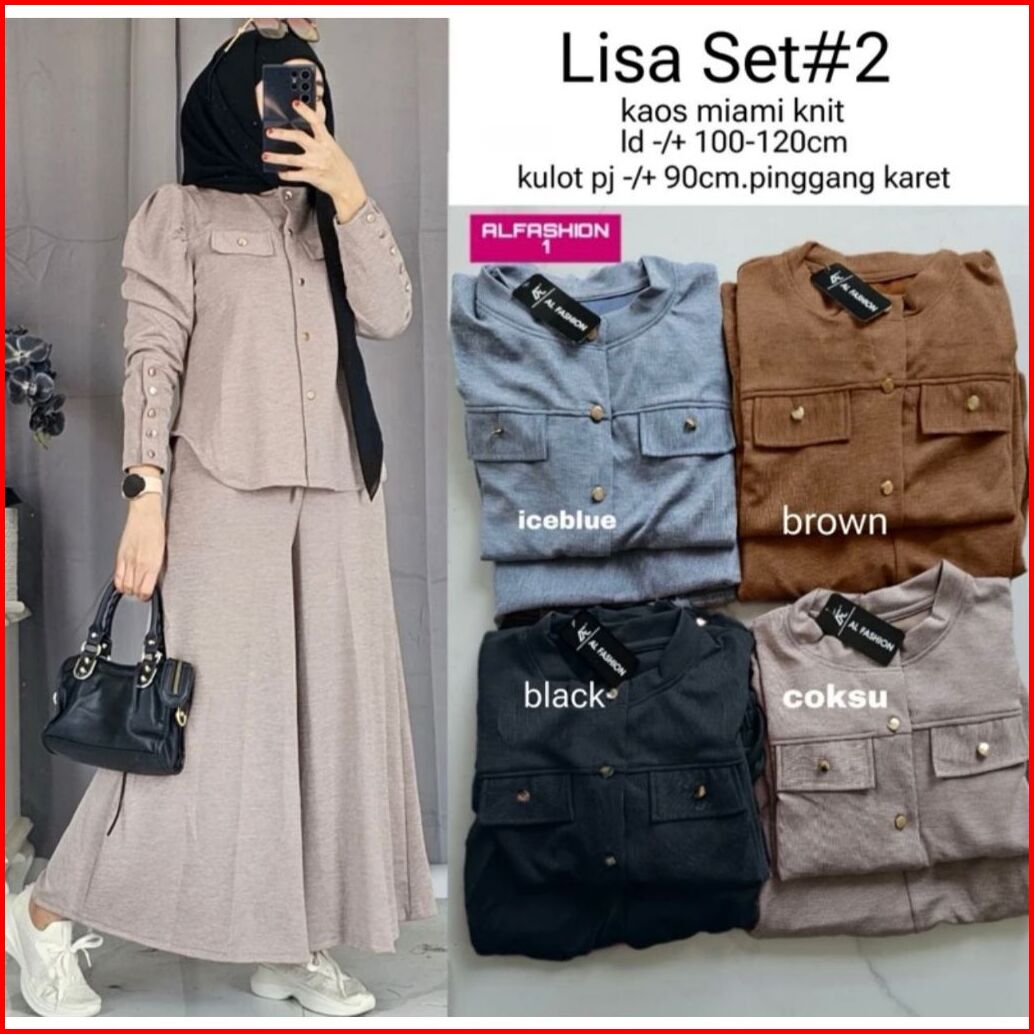Lisa Set Knit Tangan Balon Kancing Aktif Celana Kulot Setelan Wanita Polos One Set Lisa Knit Terbaru Set Wanita Setelan