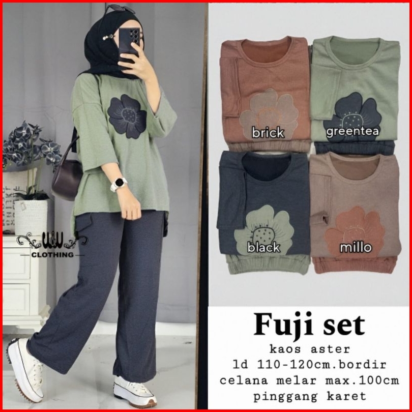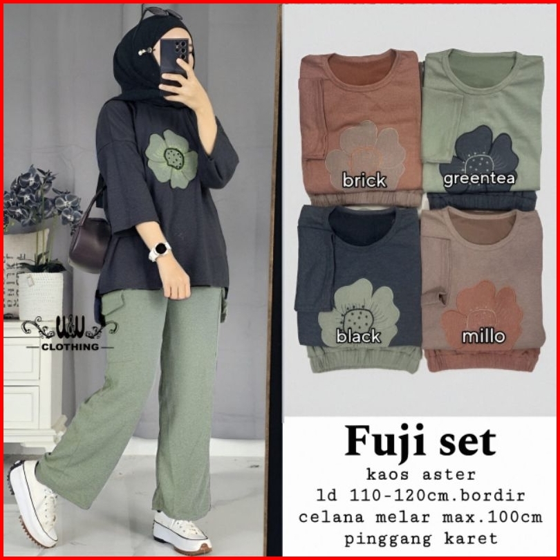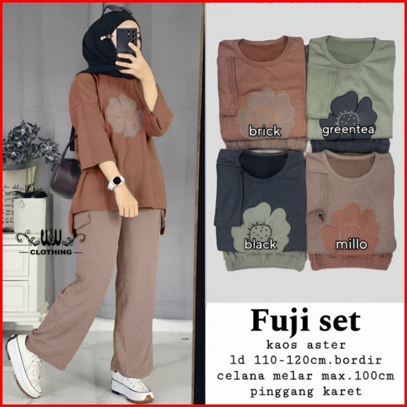 Fuji Set Celana Cargo Setelan Kaos Aster Bordir Bunga Ld 110-120cm Setelan Pakaian Wanita By W W