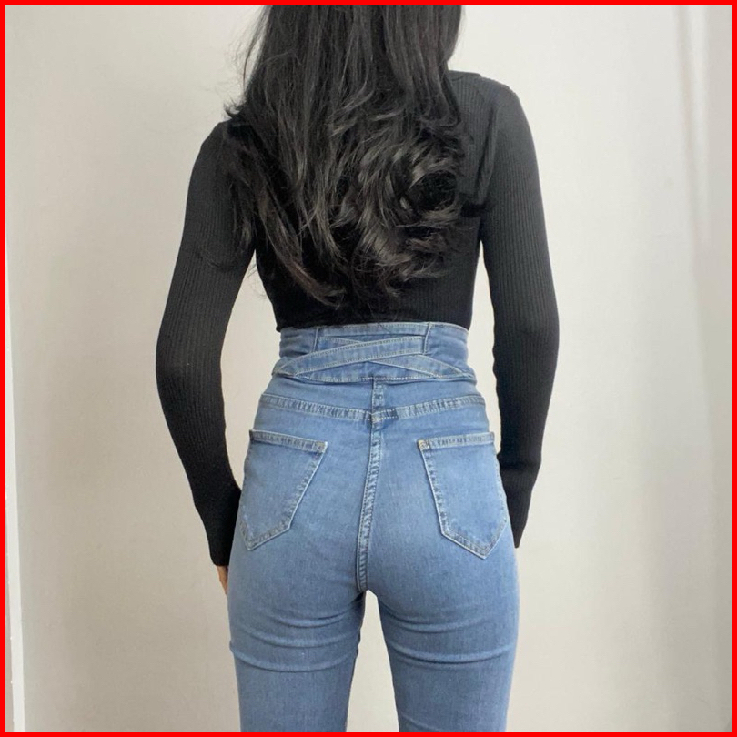 Korean Style Jeans Skinny J32 Highwaist Strech Pensil Silang Wanita - Straight High Loose - Celana Panjang Wanita Terbar