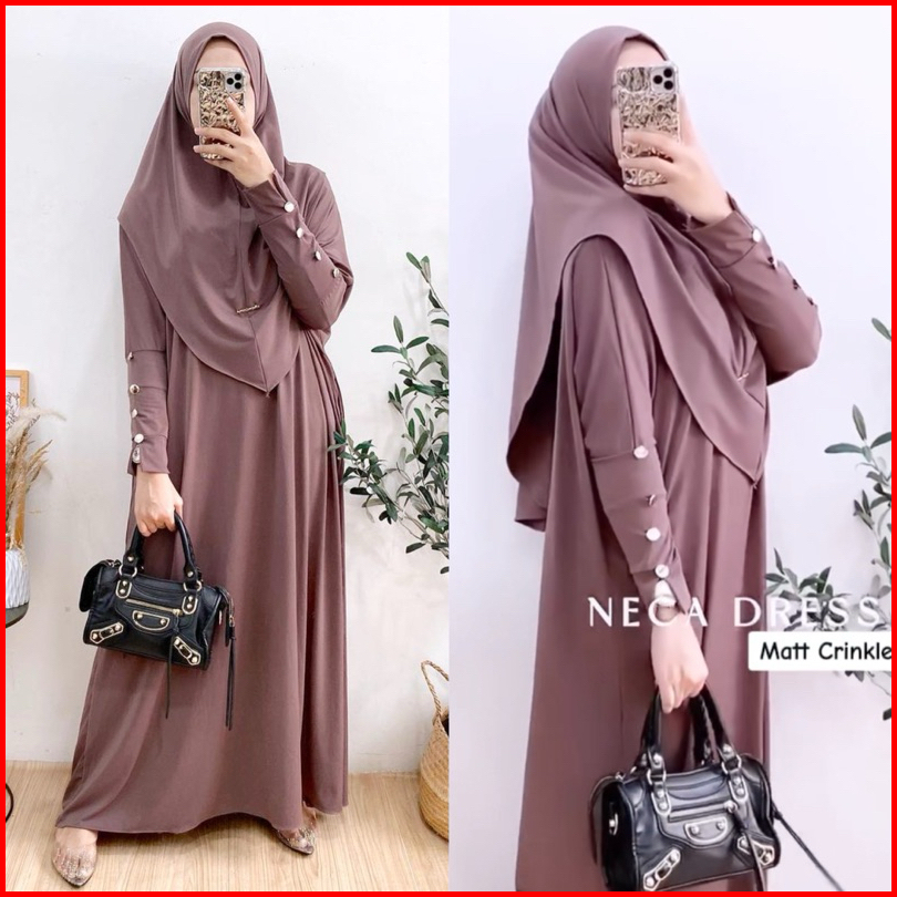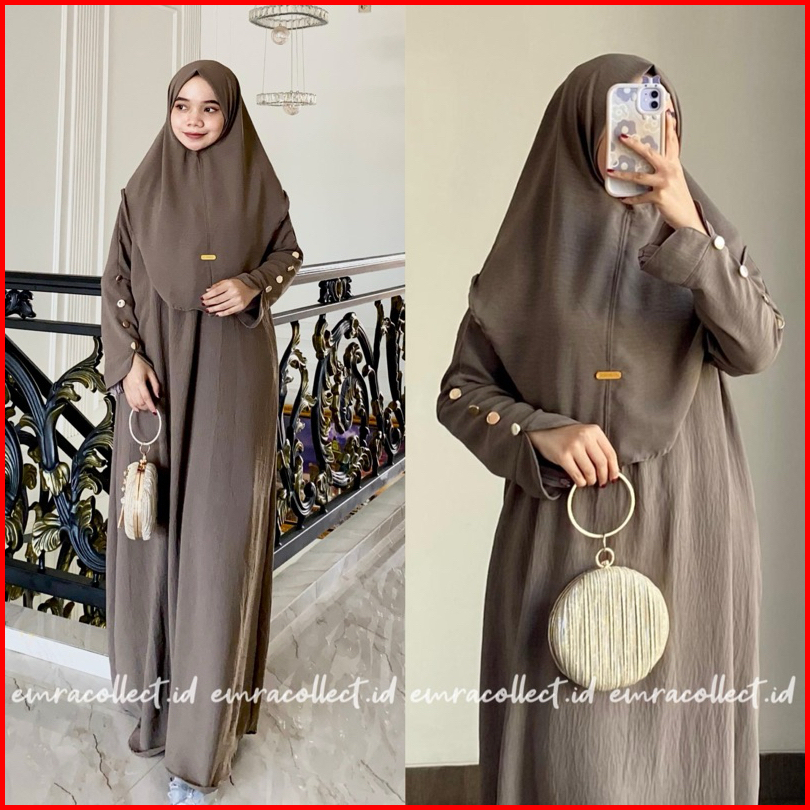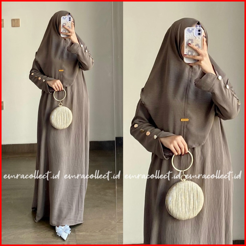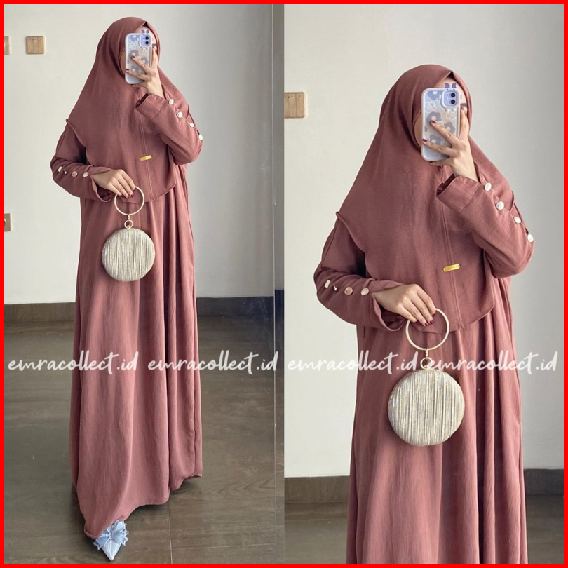 Abaya Free Hijab Setelan Gamis Umroh Dress Batwing Oversize Crinkle Inara Button - Emracollect.id