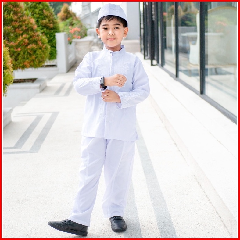 Fatih Dan Firra - Set Peci Koko Arziki Setelan Putih Anak Usia 4-12 Tahun Lengan Panjang