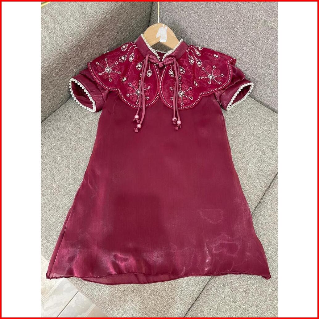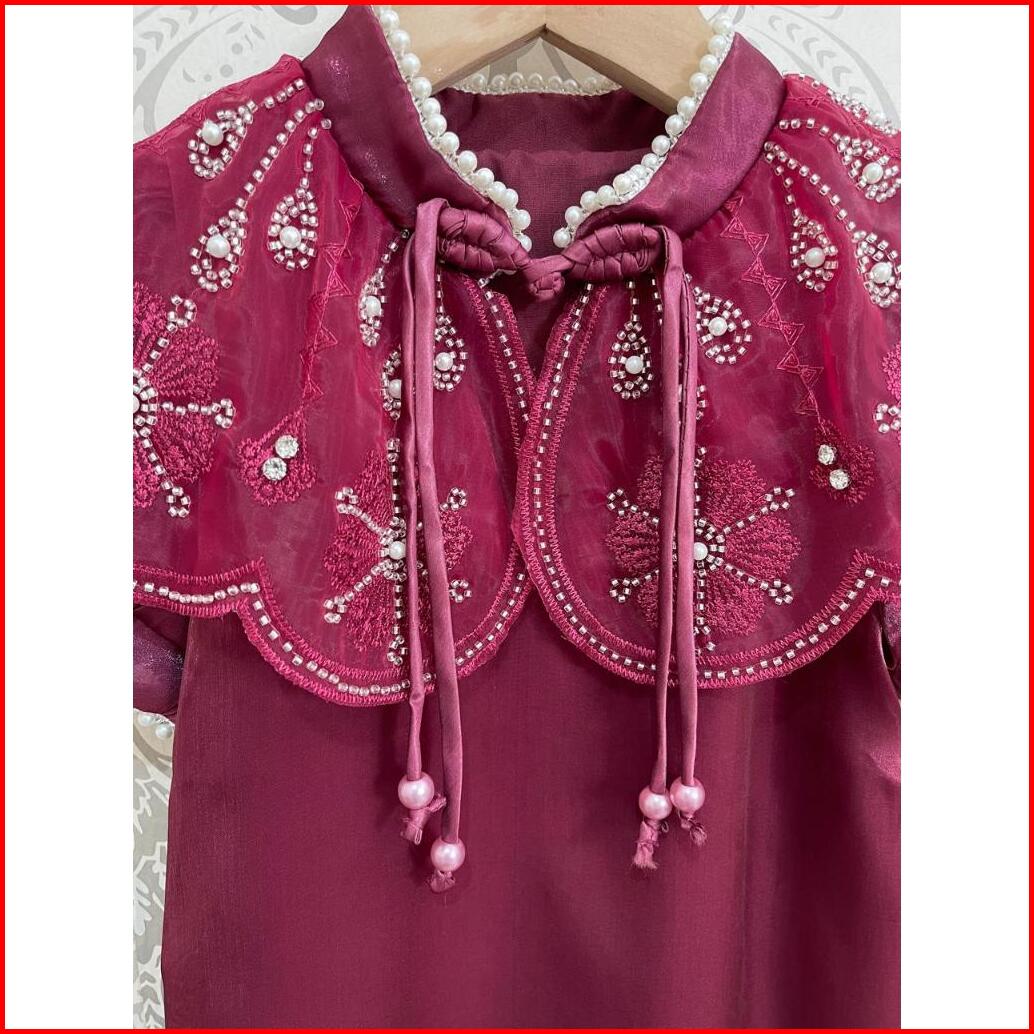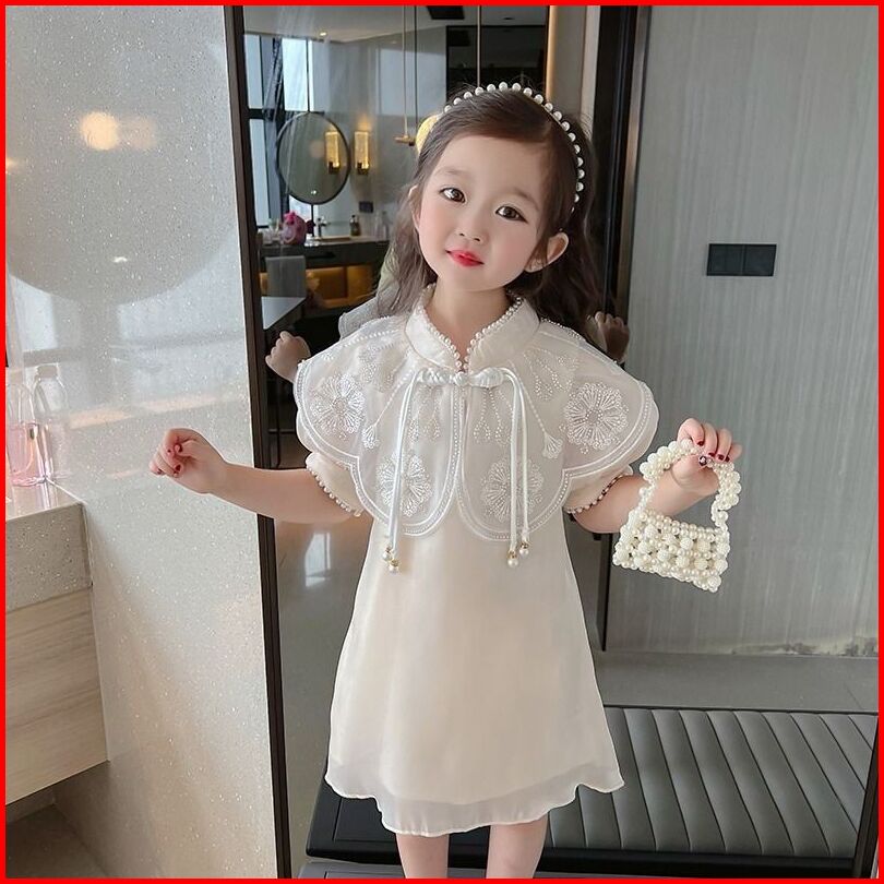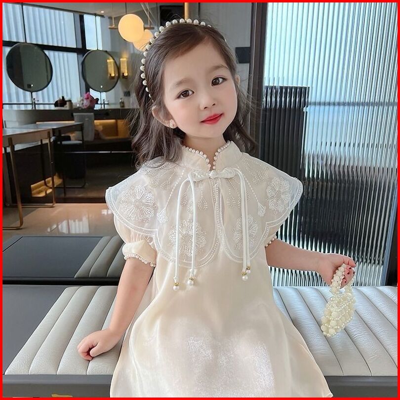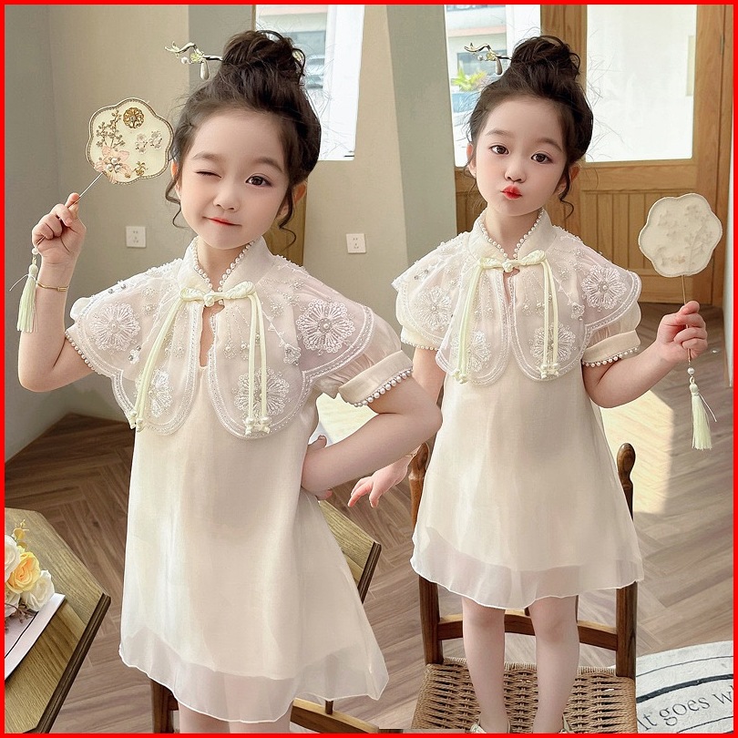 Kidsfashionkoleksi 1060 Gaun Pesta Cheonsam Anak Perempuan Motif Shimmer Cream Collar Mute