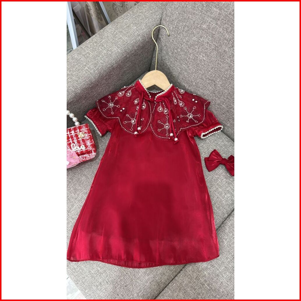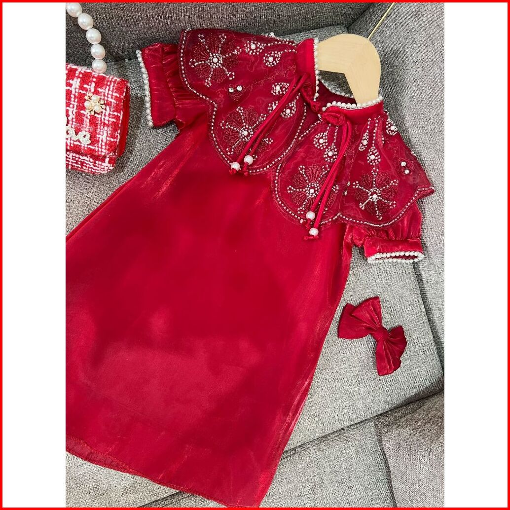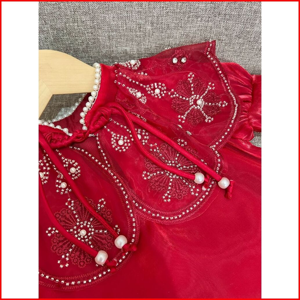 Kidsfashionkoleksi 1060 Gaun Pesta Cheonsam Anak Perempuan Motif Shimmer Cream Collar Mute
