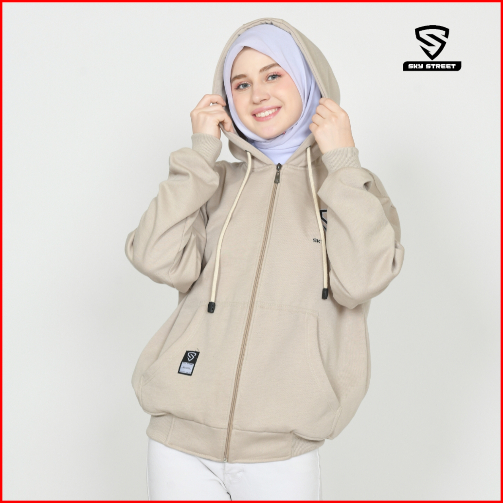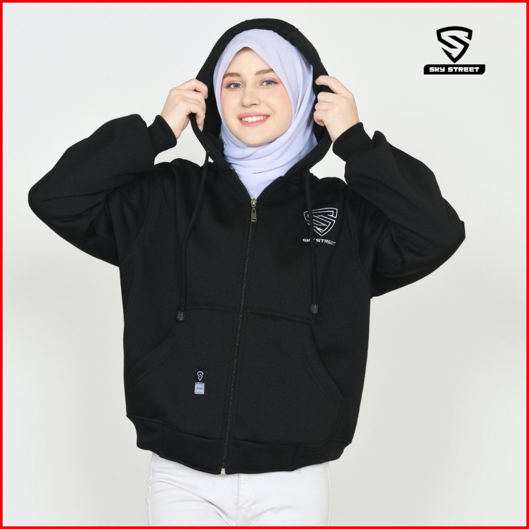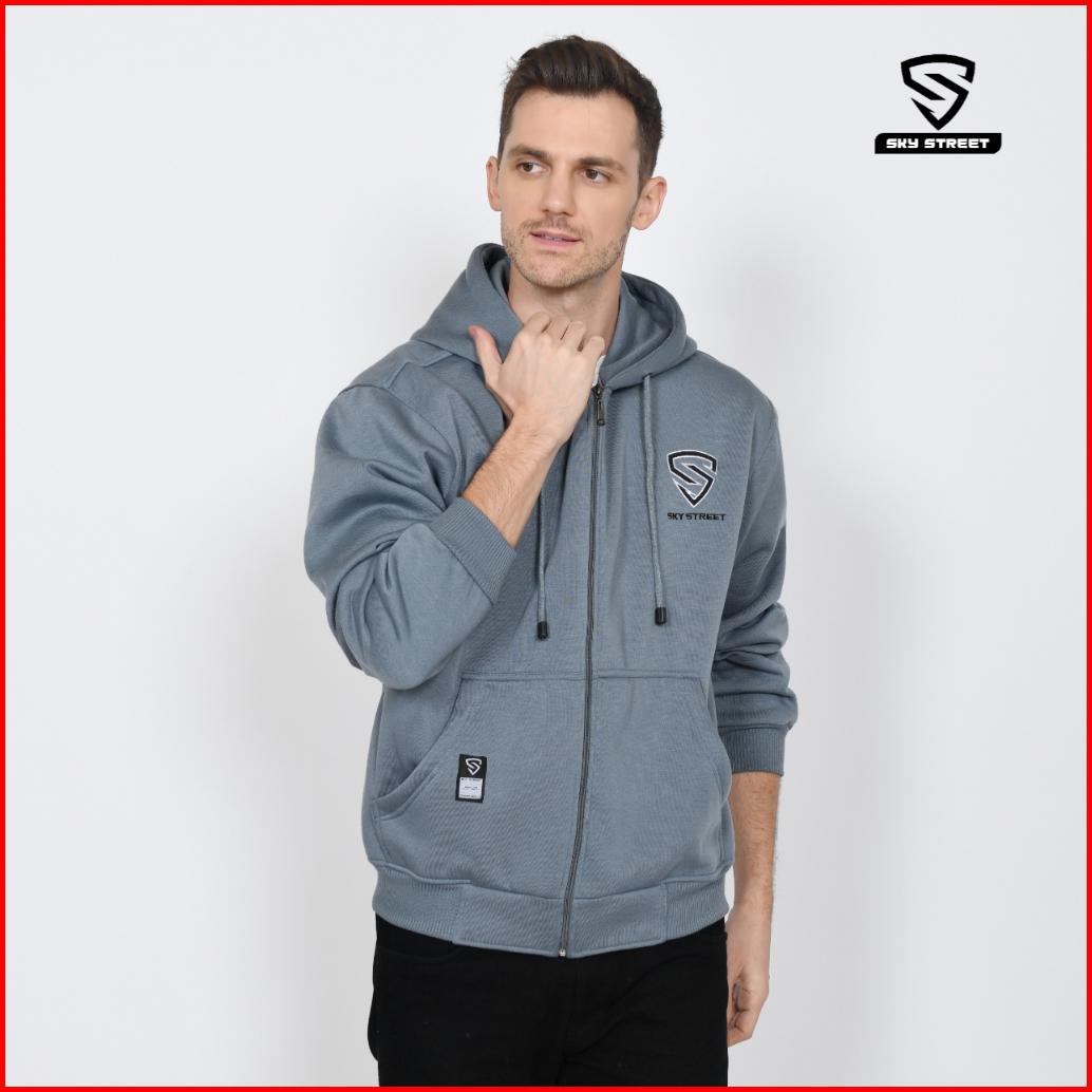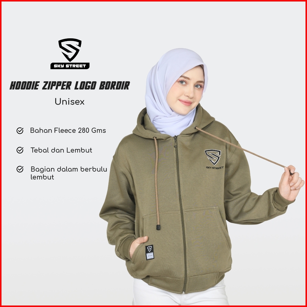 Sky Street Hoodie Sweater Jacket Zipper Resleting Logo Bordir 280 Gms Tebal Lembut Unisex Pria Wanita Bahan Fleece Distr